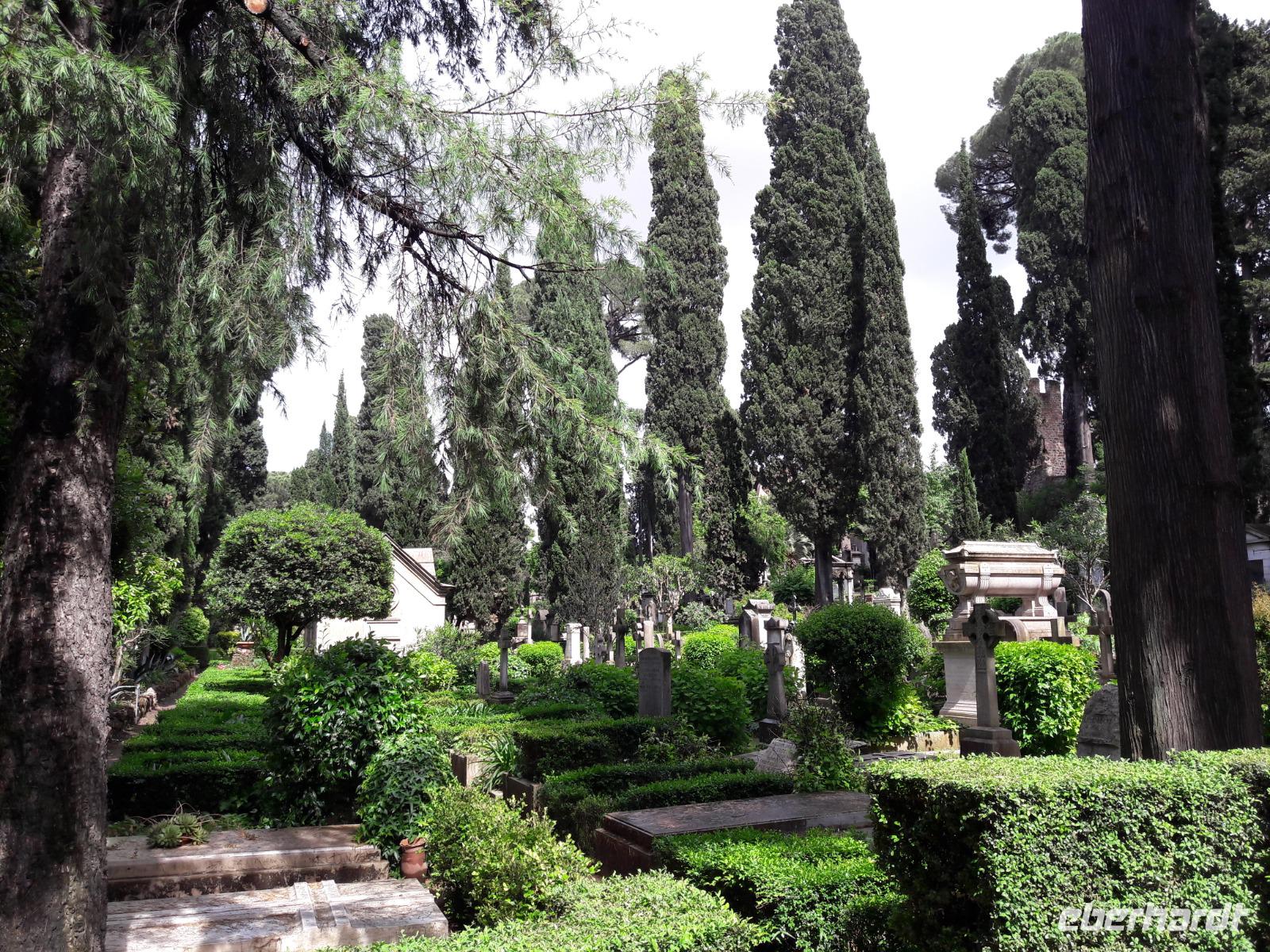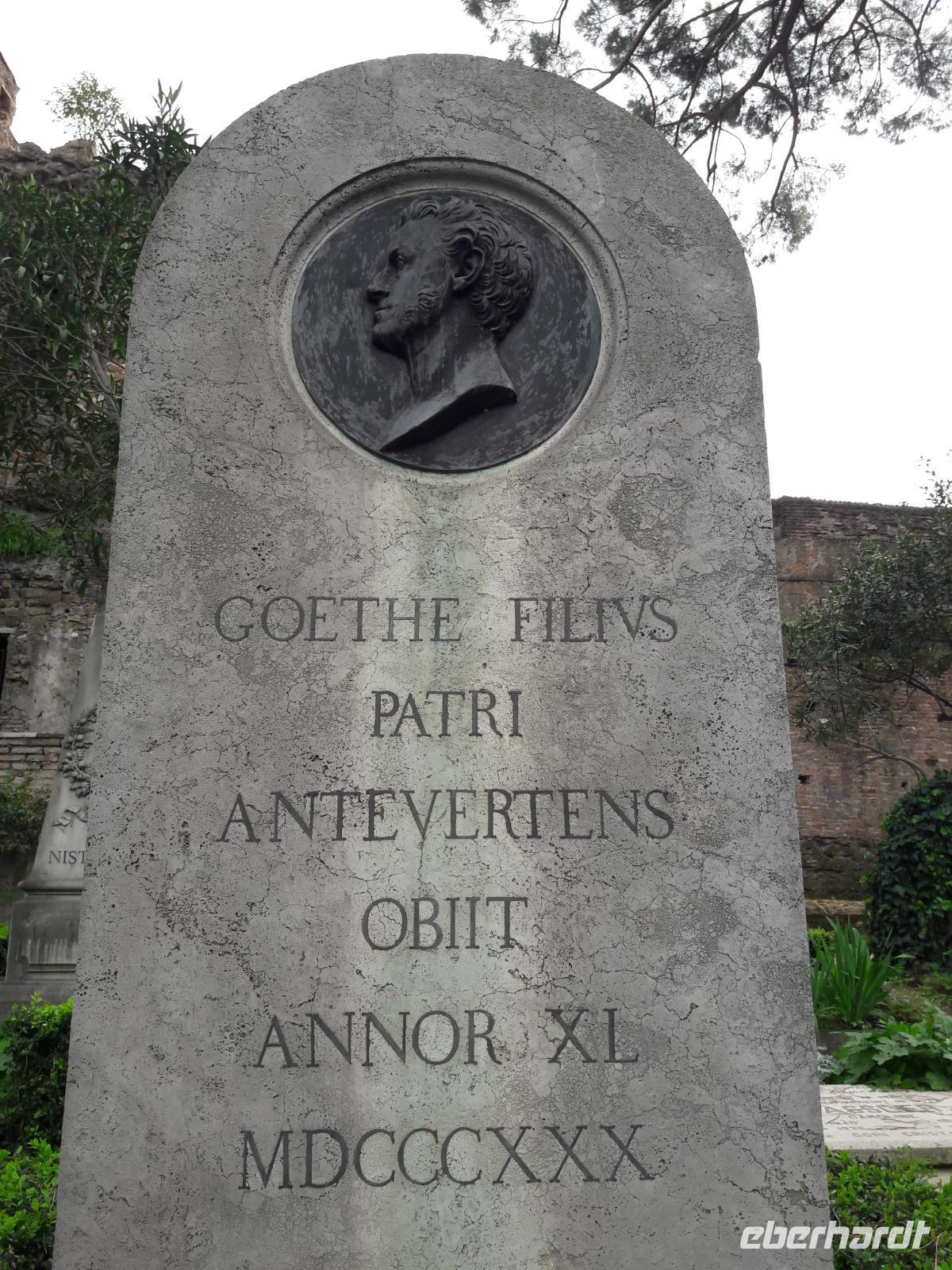 Gemeinsam fahren wir im Anschluss an die Mittagspause mit der Metro, dem sichersten und schnellsten Verkehrsmittel Roms, zum Protestantischen Friedhof. Vorbei an der Cestius Pyramide, die sich der römische Beamte Caius Cestius als Grabmal im Stil der damaligen Ägypten-Mode (12.v. Chr.) hatte errichten lassen, erreichen wir einen der stimmungsvollsten Orte Roms, den Cimitero Acattolico. Nach dem Menschengetümmel im FORUM ROMANUM und im KOLOSSEUM genießen wir die hier herrschende, wohltuende Atmosphäre. Wir bummeln durch die sehr gepflegte Anlage und entdecken dabei - neben zahlreichen unbekannten griechischen, russischen, englischen und deutschen Gräbern - auch die einiger, uns bekannter „Prominenter". Hier ruhen u.a. die englischen Romantiker Keats und Shelley, die Gattin von Axel Munthe, einem vor allem in Neapel und Capri sehr geschätzten, schwedischen Arzt und hier ruht auch Gottfried Semper. Neben ihm gilt unser besonderes Interesse natürlich dem Grab von Goethes Sohn August („Gustl"). Für den schlicht wirkenden Grabstein hat J. W. v. Goethe den Grabspruch „Goethe filius patri antevertens" (Goethes Sohn, dem Vater vorangehend) gewählt.