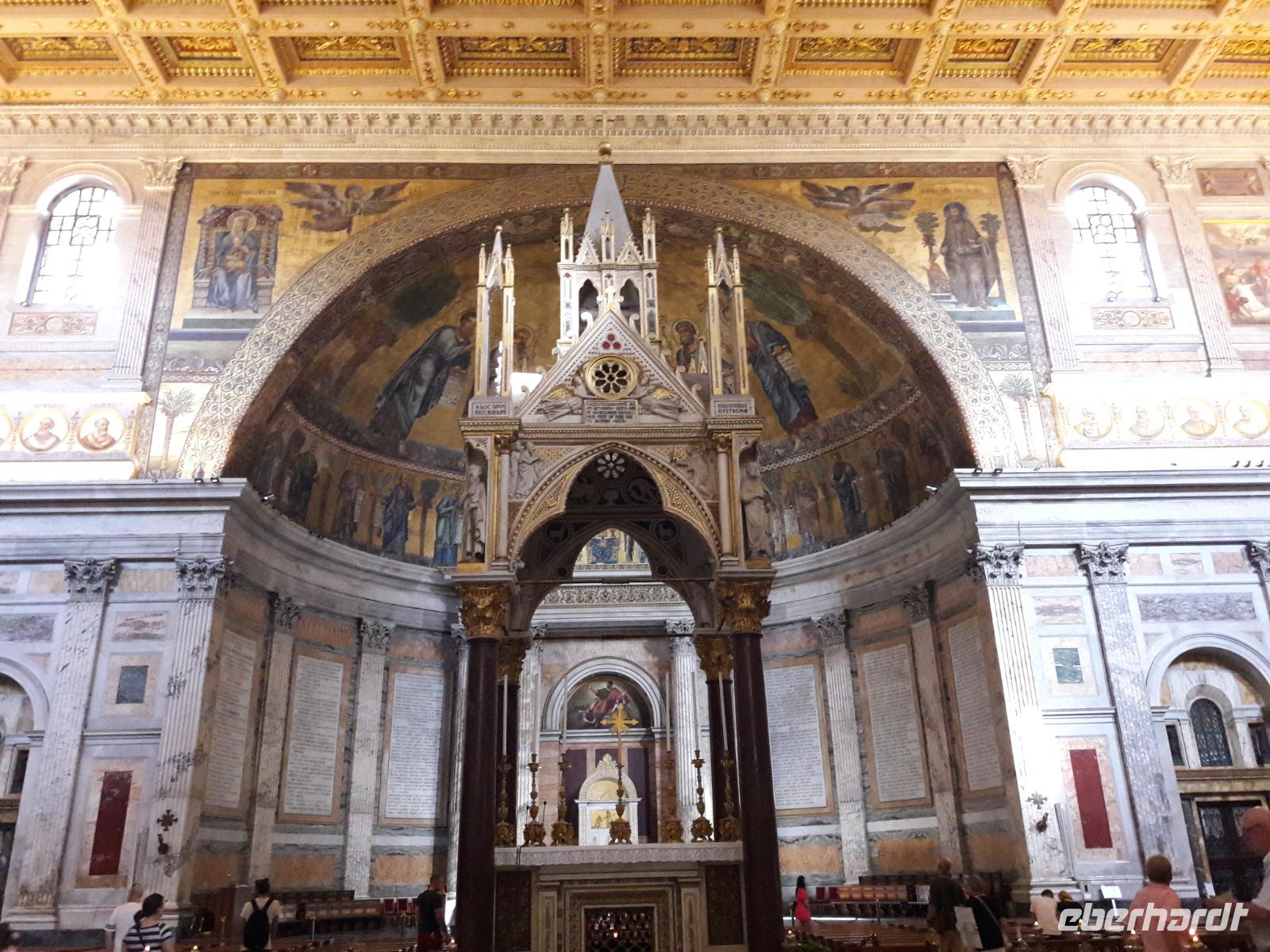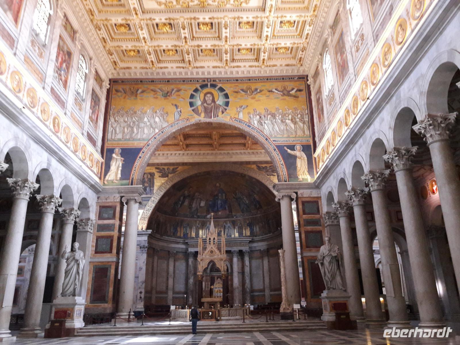 Hier, an dieser Stelle, soll der Hl. Paulus 67 n. Chr. enthauptet worden sein. Kaiser Konstantin ließ ihm zu Ehren im 4. Jahrhundert eine Basilika errichten, die später von den Benediktinermönchen erweitert wurde. Diese Basilika soll seinerzeit an Pracht sogar die Basilika von Alt-Sankt-Peter übertroffen haben. Leider hat ein Brand im Jahr 1823 die Kirche weitestgehend zerstört. Gerettet wurden nur wenige Fragmente, so u.a. das Apsismosaik aus dem 13. Jahrhundert und die aus dem 11. Jahrhundert stammende Bronzetür, die sogenannte Heilige Pforte. Der 1854 abgeschlossene Wiederaufbau ist eine Rekonstruktion der frühchristlichen Basilika, hinzu kam 1925 noch das monumentale Säulenatrium.