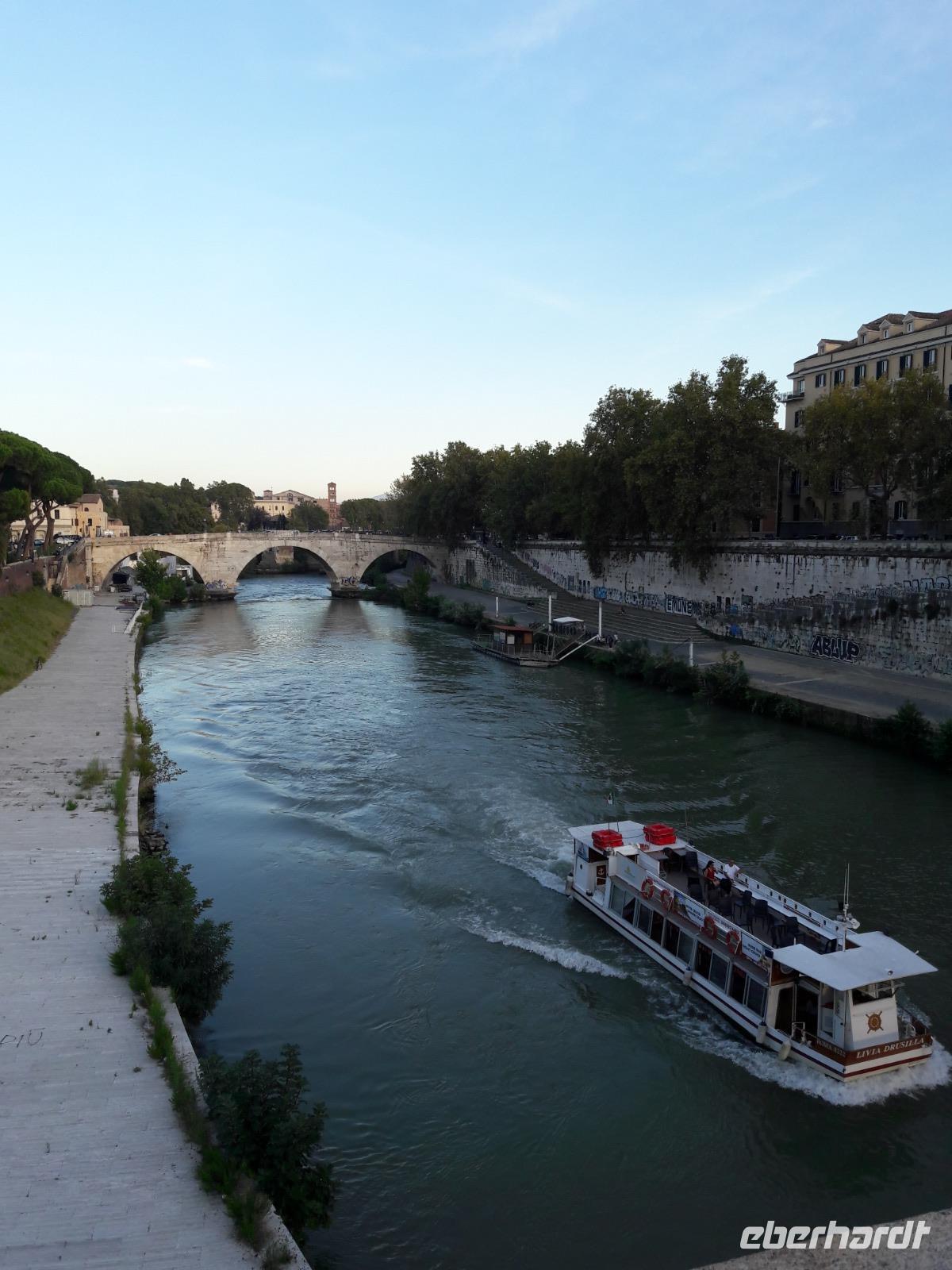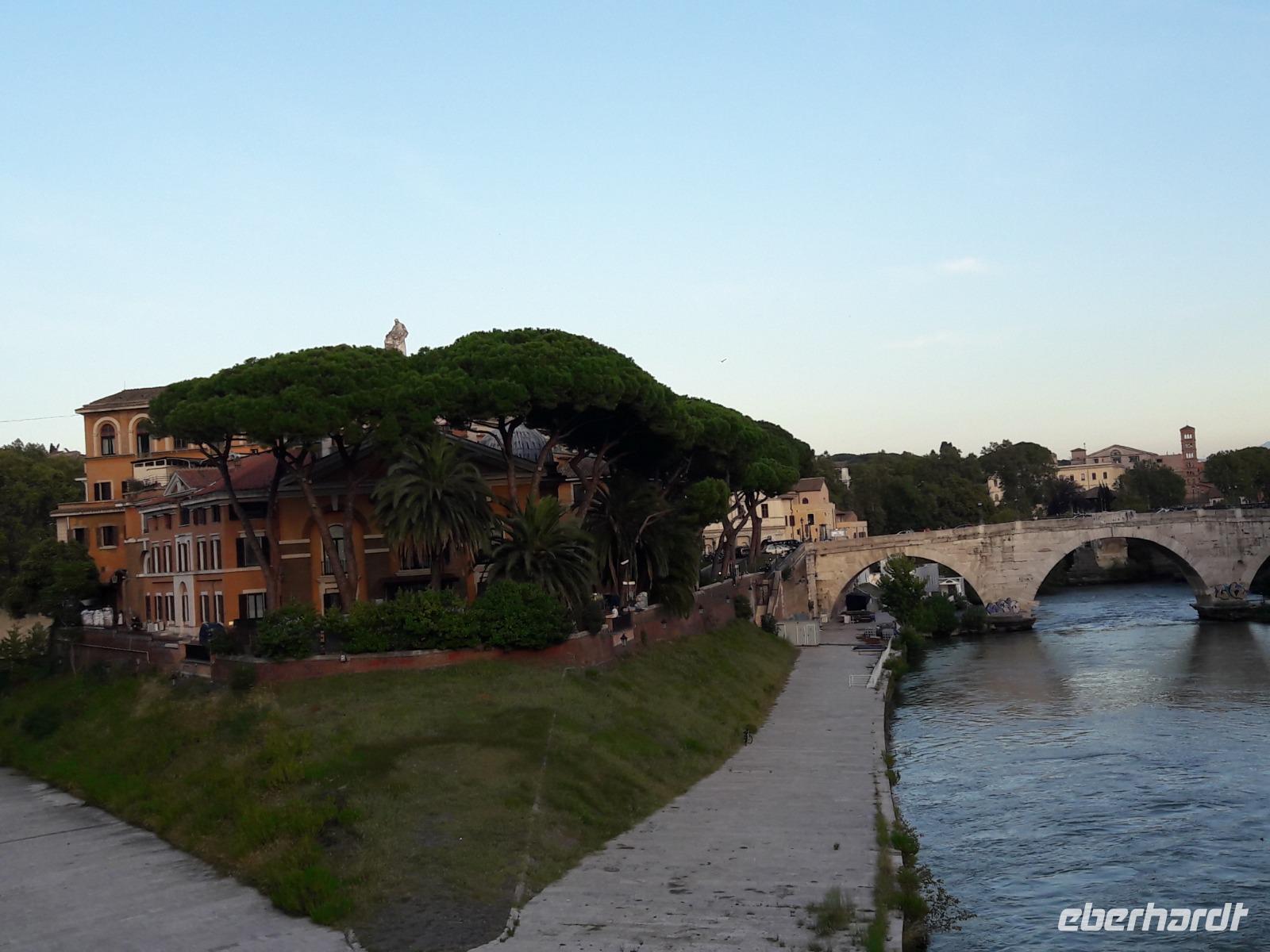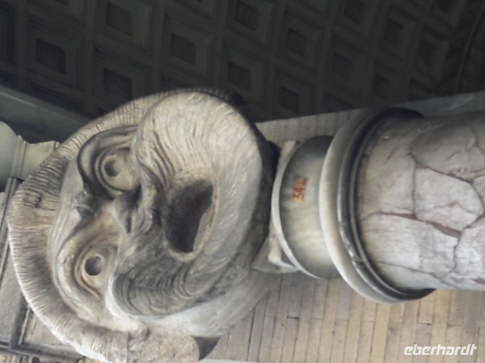 Danach entlässt uns Norbert wieder in die Freizeit, begleitet aber den Großteil der Gruppe noch ein Stück des Weges. Inspiriert durch den Film „Ein Herz und eine Krone" mit Audrey Hepburn und Gregory Peck, wollen wir unbedingt zur „Bocca della Verità" (Mund der Wahrheit). Auf unserem Weg tangieren wir noch die Area Sacra Argentina (hier befinden sich noch Überreste der ältesten Tempel Roms - ca. 400 v. Chr.) und das Jüdische Viertel. Viel Vergnügen bereitet uns das Trinken an den sogenannten „Nasen", wie die Trinkbrunnen in Rom genannt werden. Kurz vor Toresschluss erreichen wir noch die Bocca. Jetzt wird es sich zeigen, wer die Wahrheit sagt oder wer ein Lügner ist... Wir sind happy, denn bei keinem von uns schnappt der antike Lügendetektor in der Vorhalle der Kirche „Santa Maria in Cosmedin" zu. Wir werfen auch noch schnell einen Blick in das schlichte Innere der Kirche und erfreuen uns noch kurz an dem hübschen Mosaikfußboden. Dann trennen sich die Wege. Einige fahren - völlig geschafft - mit dem Bus Richtung Hotel, die anderen (wieder der harte Kern) bummeln noch mit mir über die Tiberinsel nach ??? ... natürlich nach Trastevere.