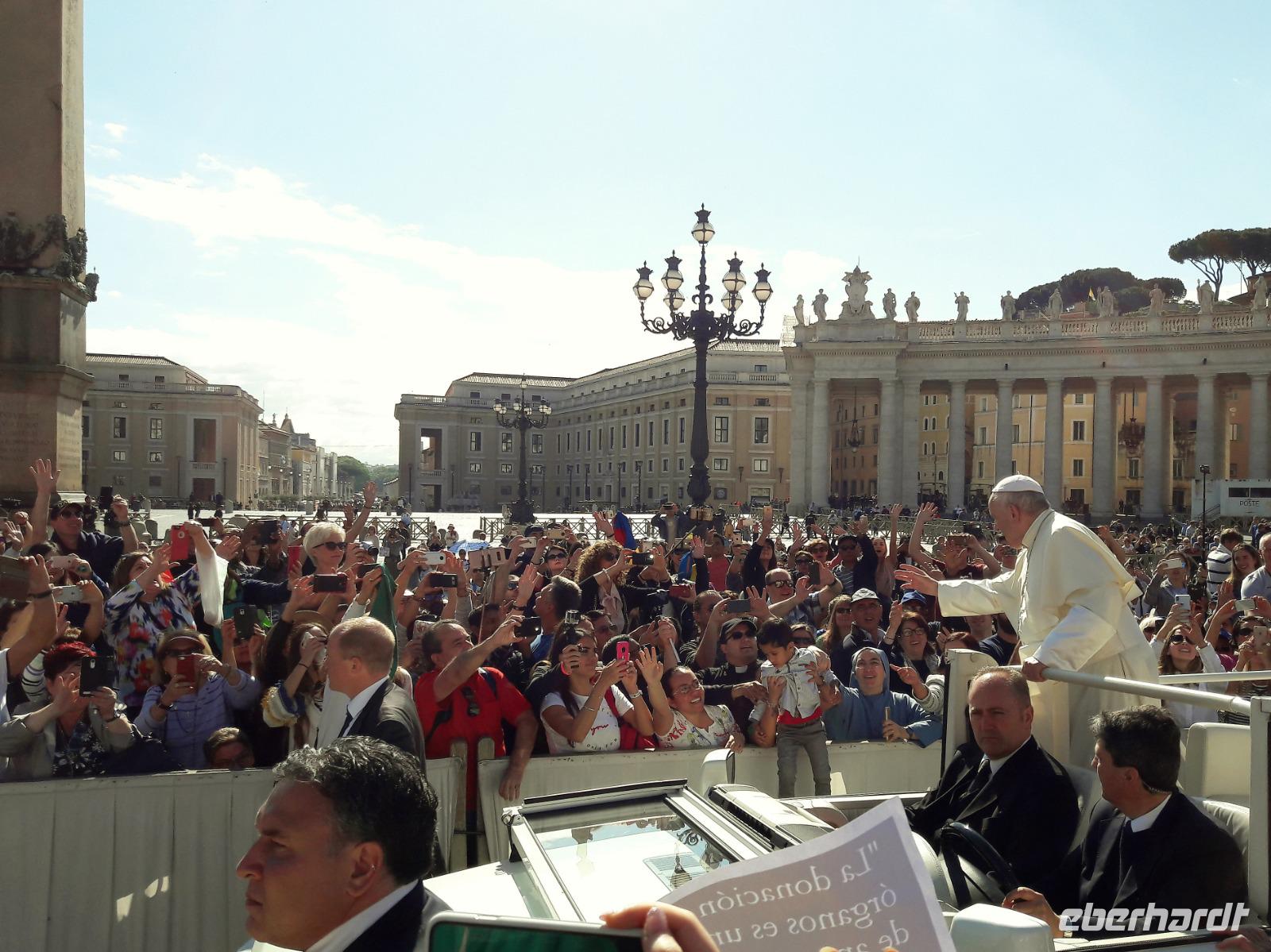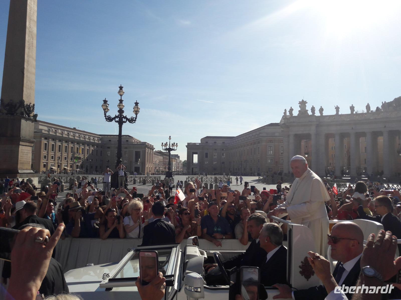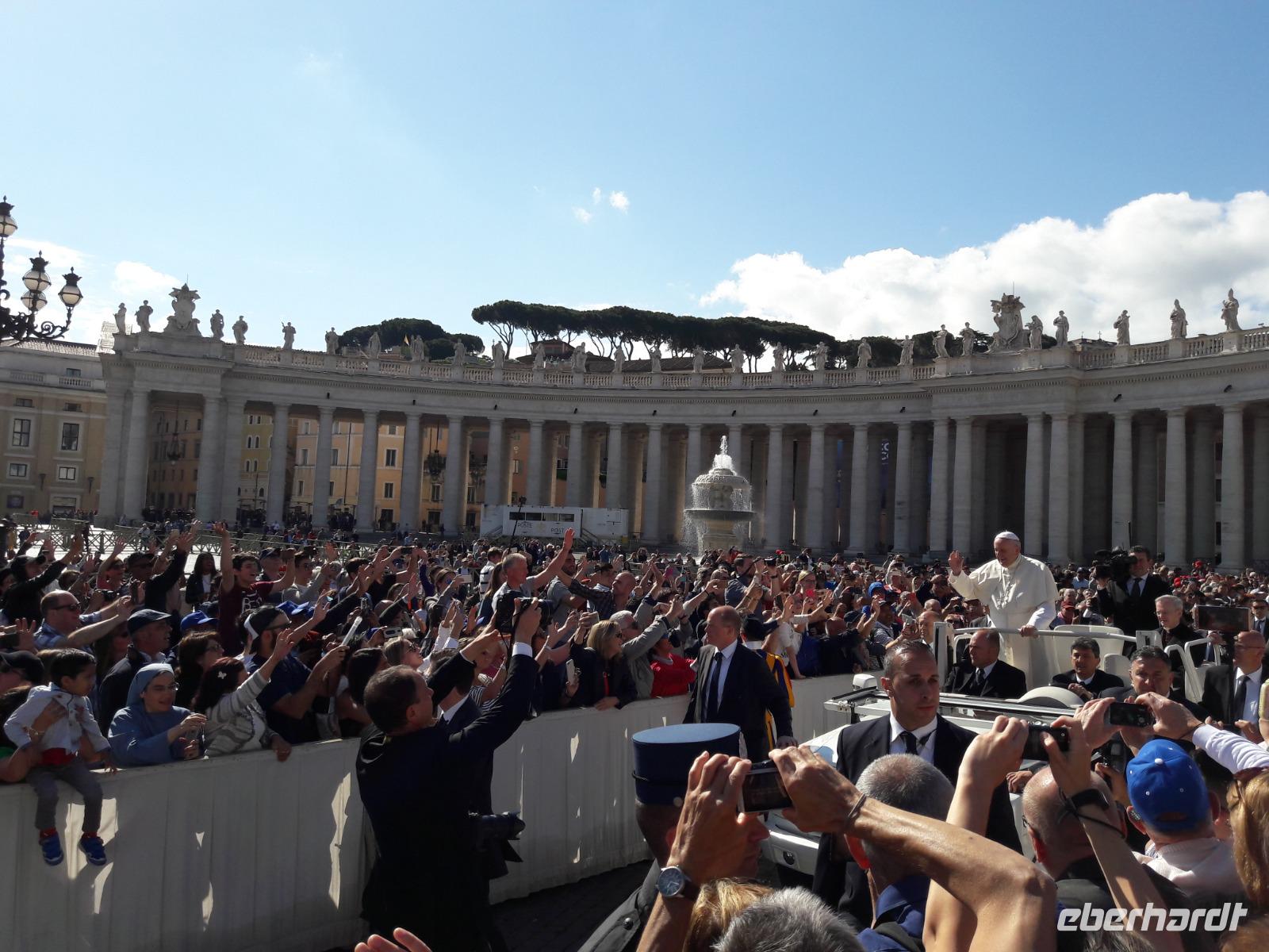 Wir haben Glück und finden einen geeigneten Platz. Während Norbert uns gut unterhält, spüren wir plötzlich eine gewisse Unruhe in den Reihen, eine Bewegung der Massen setzt ein. Und dann kommt er in seinem Papa-Mobil. Freundlich winkend und - wie so oft - ein mildes Lächeln im Gesicht umrundet er die ihm zujubelnde Menschenmenge. Und er kommt auch noch ein zweites Mal! Immer wieder schüttelt er Hände, nimmt Kinder auf den Arm - ja, es stimmt, er ist tatsächlich ein Papst zum Anfassen. Bevor er uns seinen Segen erteilt, werden erst einmal die Herkunftsorte der Anwesenden vorgelesen und mit Freude vernehmen wir auch „Kesselsdorf". Recht beeindruckt und mit ein paar Schnappschüssen in der Tasche machen wir uns am Ende der Audienz wieder auf den Weg. Wir verlassen den Platz aller Plätze und ohne es groß zu bemerken, verlassen wir beim Überschreiten einer weißen Linie auch den Vatikanstaat. Wir sind wieder in Italien, genauer gesagt in Rom - und das wollen wir heute noch ein wenig näher unter die Lupe nehmen.