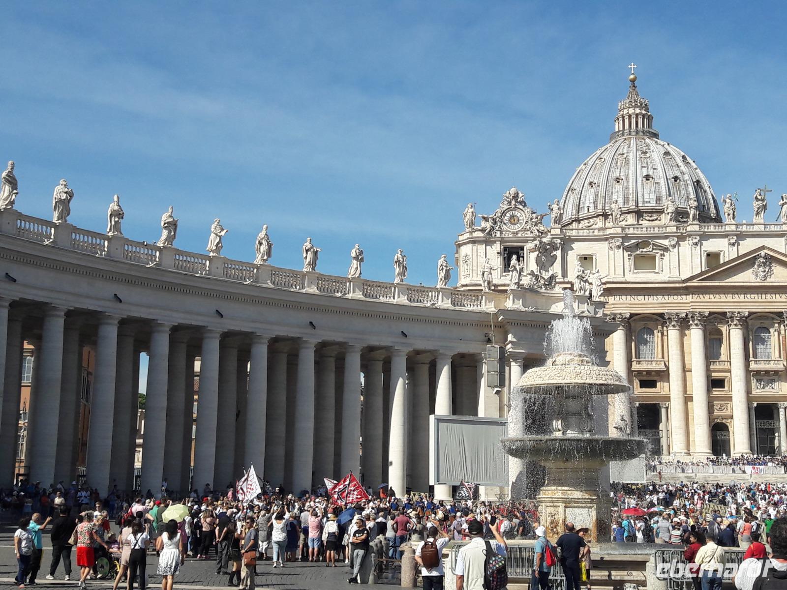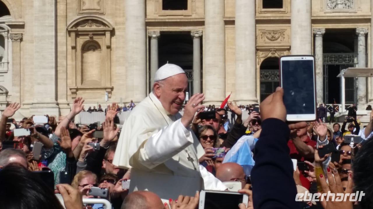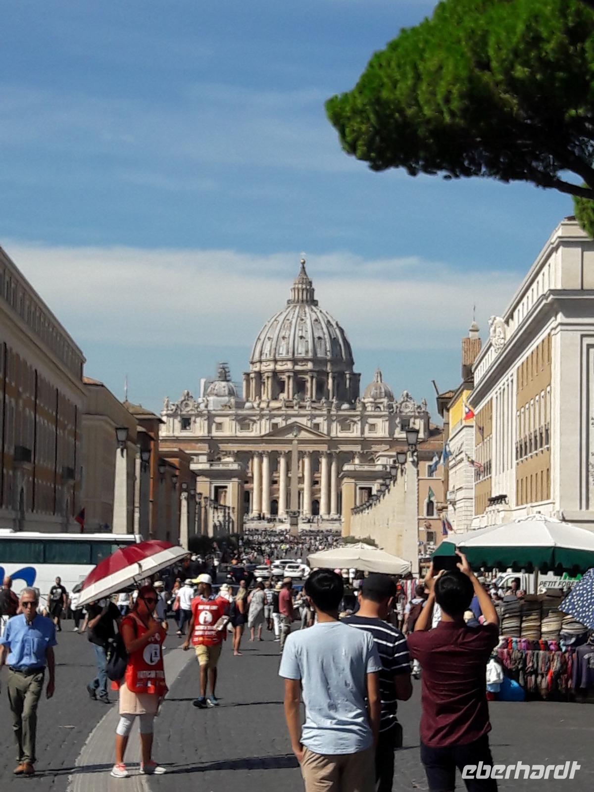 Wir haben Glück und finden einen geeigneten Platz. Während Norbert uns gut unterhält, spüren wir plötzlich eine gewisse Unruhe in den Reihen, eine Bewegung der Massen setzt ein. Und dann kommt er in seinem Papa-Mobil. Freundlich winkend und - wie so oft - ein mildes Lächeln im Gesicht umrundet er die ihm zujubelnde Menschenmenge. Und er kommt auch noch ein zweites Mal! Immer wieder schüttelt er Hände, nimmt Kinder auf den Arm - ja, es stimmt, er ist tatsächlich ein Papst zum Anfassen. Bevor er uns seinen Segen erteilt, werden erst einmal die Herkunftsorte der Anwesenden vorgelesen und mit Freude vernehmen wir auch „Kesselsdorf". Recht beeindruckt und mit ein paar Schnappschüssen in der Tasche machen wir uns am Ende der Audienz wieder auf den Weg. Wir verlassen den Platz aller Plätze und ohne es groß zu bemerken, verlassen wir beim Überschreiten einer weißen Linie auch den Vatikanstaat. Wir sind wieder in Italien, genauer gesagt in Rom - und das wollen wir heute noch ein wenig näher unter die Lupe nehmen.