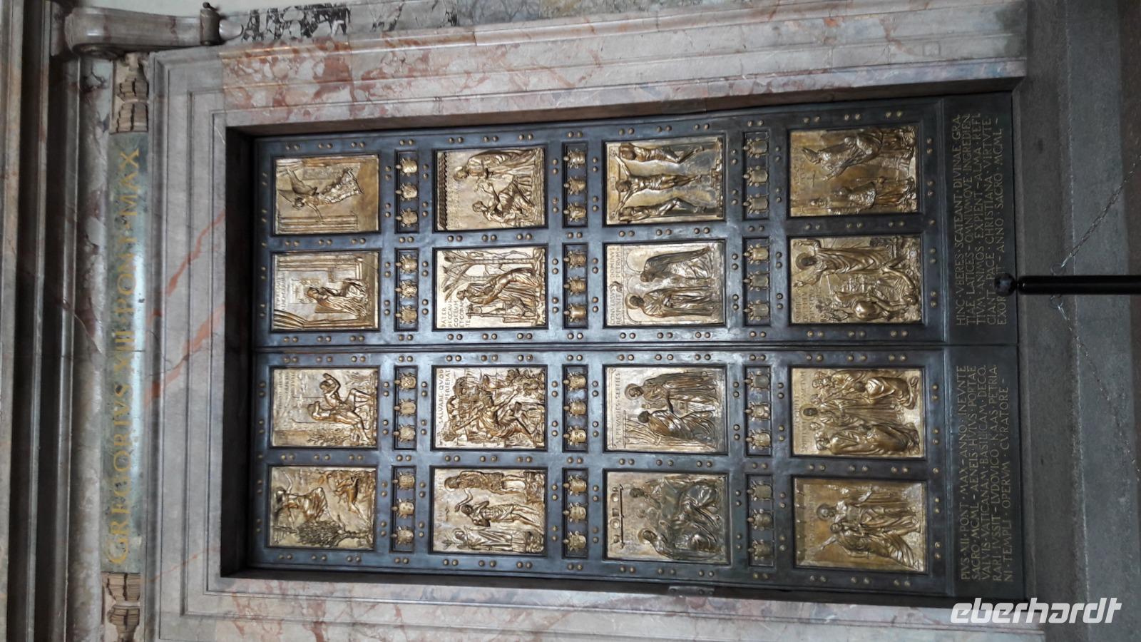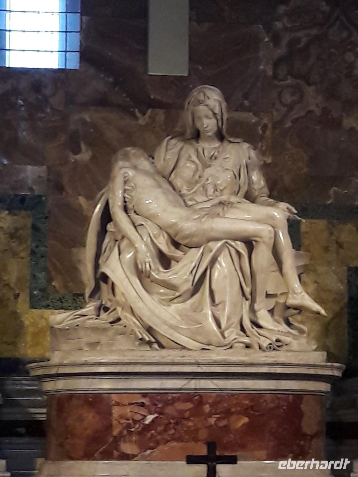 Danach gehen wir noch mit Sylvia - vorbei an der „Porta Santa" (sie ist nur zu Beginn eines Heiligen Jahres geöffnet), in den PETERSDOM. Der Innenraum, nahezu 190m lang, ist reich an unzähligen Meisterwerken - er hat 45 Altäre, 11 Kapellen und besteht aus drei Schiffen sowie einem Querschiff von 137,5 m Breite und einer 136,5 m hohen Kuppel (ganz locker könnte er den Kölner Dom in sich aufnehmen). Überall findet man Papststatuen und Grabmäler. Am meisten fasziniert mich immer wieder die „Pieta" von Michelangelo, sie ist sooooo schön, so ergreifend!