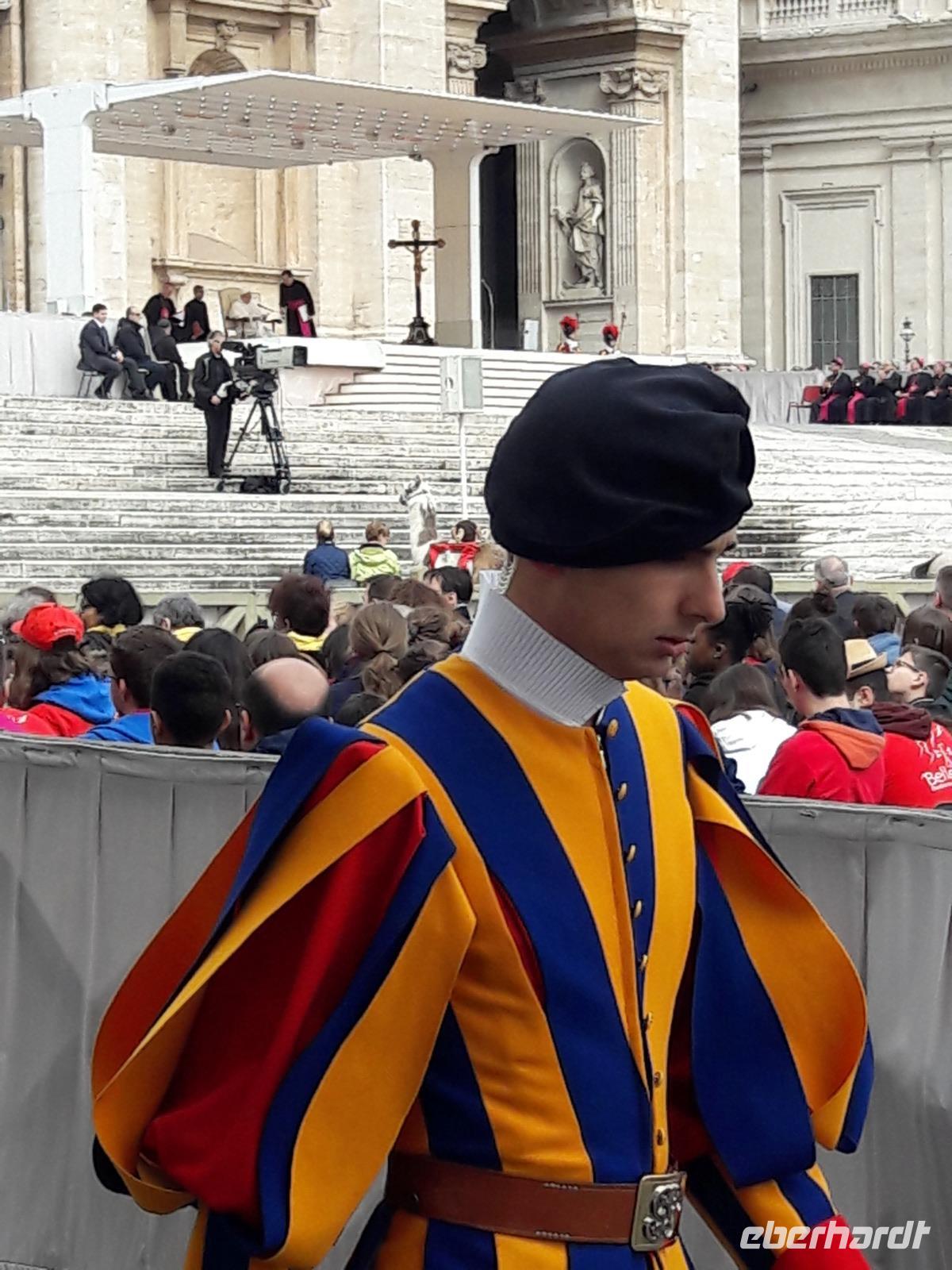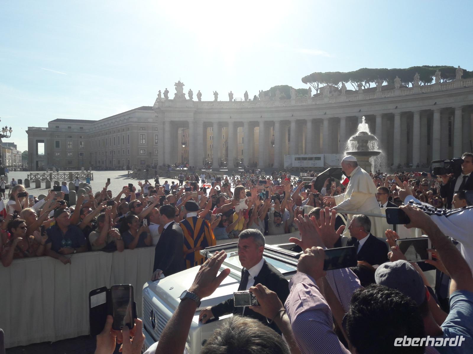 Am 12.09. ist soweit, wir werden den Papst „live" erleben und hoffentlich auch „hautnah" sehen. Bestens gelaunt machen wir uns auf den Weg zur Papstaudienz. Auf Schusters Rappen, das ist an diesem Morgen wieder „das sicherste Fortbewegungsmittel" (die Busse fahren, wie wir ja wissen, nur nach dem Zufallsprinzip), erreichen wir den Petersplatz. Bevor wir aber das „Himmelreich auf Erden" betreten, nehmen wir noch Norbert, einen ehemaligen Theologiestudenten, in unsere Gruppe auf. Er wird uns die letzten beiden Tage durch Rom begleiten. Gemeinsam absolvieren wir die Sicherheitskontrolle. Auf dem Platz herrscht bereits ein reges Treiben. Besucher, vorrangig Gläubige aus den verschiedensten Ländern der Welt, sind auf der Suche nach „dem richtigen Sitzplatz". Fast jeden beschäftigt nur die eine Frage... die Frage nach der richtigen Platzwahl.