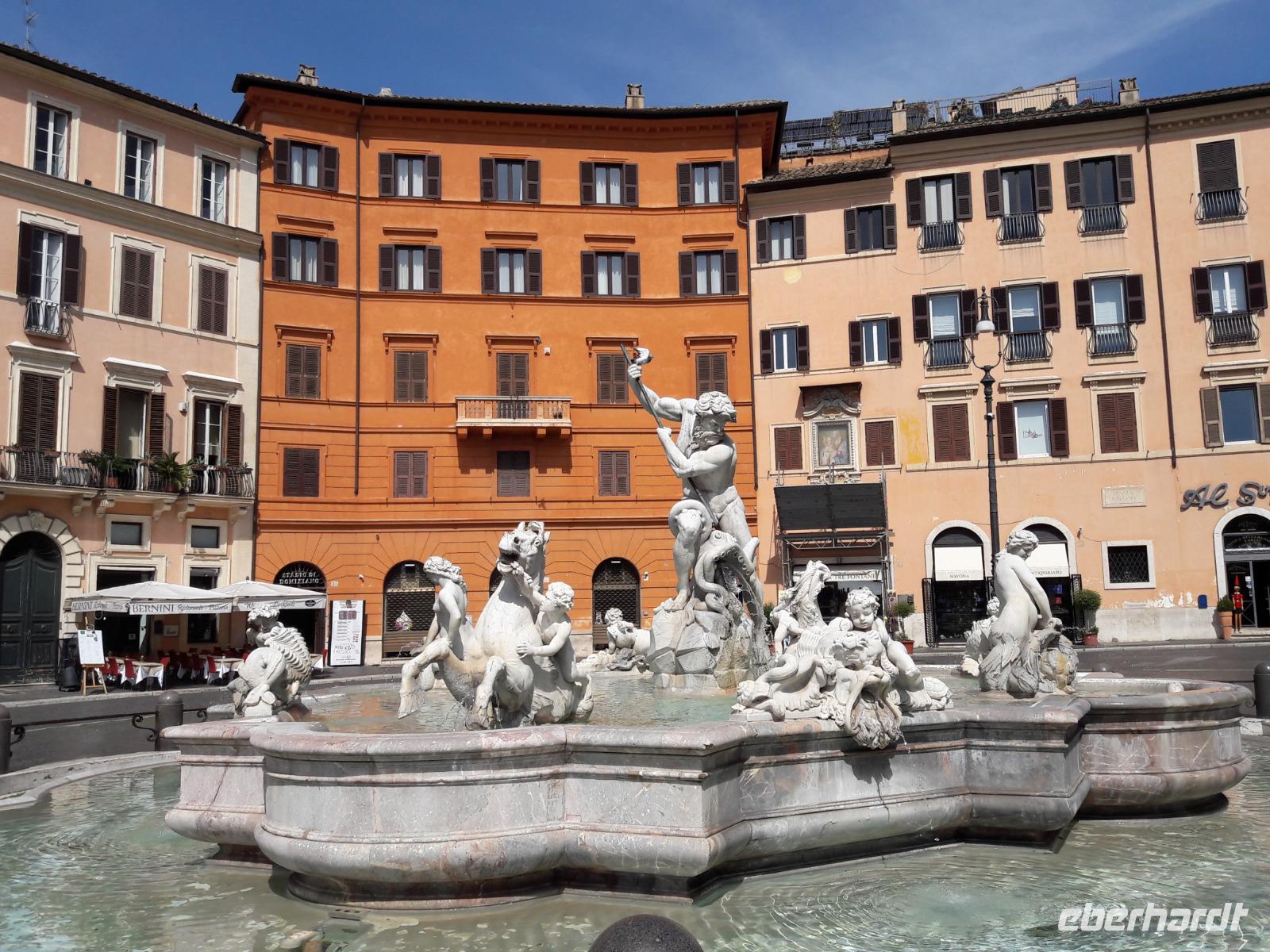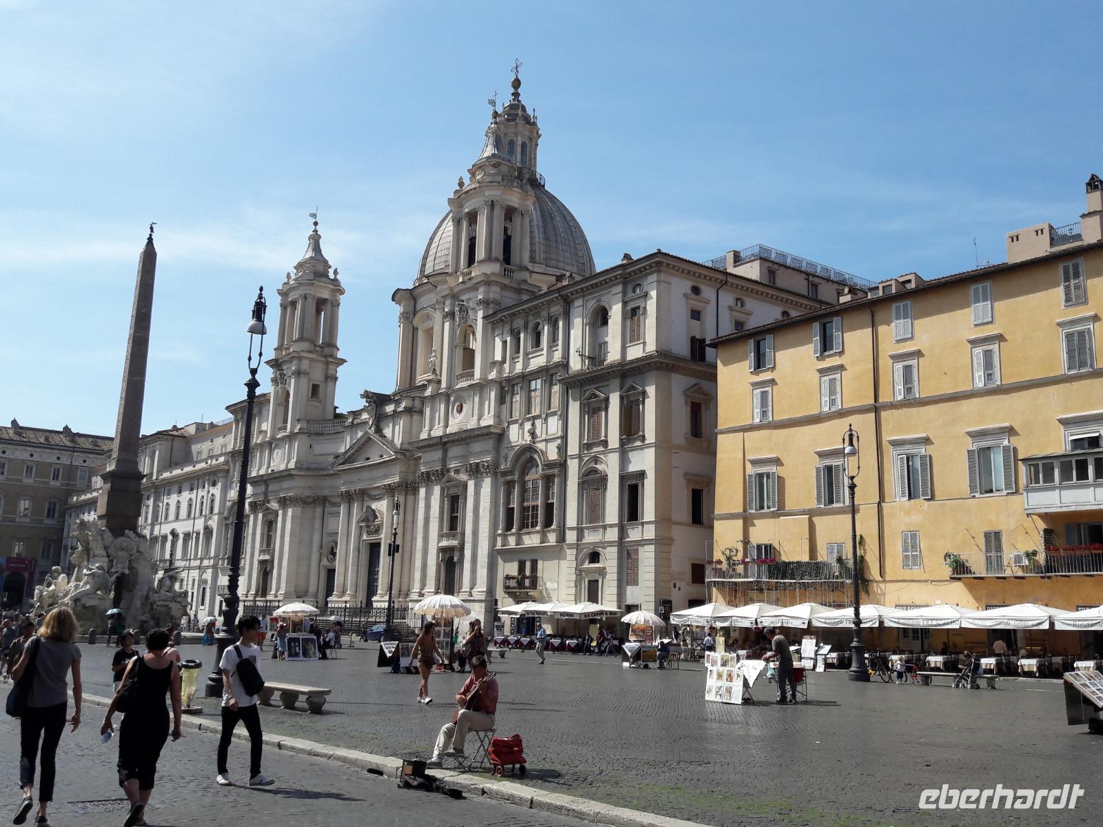 Über die von Mussolini angelegte Straße der Versöhnung erreichen wir die ENGELSBURG, das ehemalige Mausoleum des Kaiser Hadrian. Die Engelsburg, die schon bald in die antike Stadtbefestigung einbezogen wurde, diente den Päpsten später u.a. als Festung, Zufluchtsort, aber auch als prachtvolle Residenz. Zudem wurde sie als Schatzkammer, später aber auch als Gefängnis genutzt. Heute freut sie sich als Museum über jeden Besucher. Leider bleibt uns dieses Mal keine Zeit für einen Abstecher. Den heben wir uns auf für ein nächstes Mal - oder??? Wir schreiten über die Engelsbrücke, die schönste Brücke Roms, überqueren so den Tiber, bummeln durch enge Gassen und Gässchen und erreichen kurze Zeit später die PIAZZA NAVONA - den Platz, "wo alle Brünnlein fließen". Na ja, eigentlich sind es ja nur drei - aber was für welche! Im Stile des Barock erbaut, dominieren sie den Platz, der ursprünglich von Kaiser Domitian als Stadion erbaut worden war. Ein wunderbares Ensemble bildet die von Borromini erbaute Kirche S. Agnese in Agone (wir werfen schnell einen Blick hinein und sind angenehm überrascht) mit dem Vier-Ströme-Brunnen. Der Brunnen, ein Meisterwerk von Bernini, dem „Rom-Stararchitekten" der Barockzeit, stellt die vier größten Flüsse der damals bekannten Erdteile dar. Der NIL stellvertretend für Afrika, die DONAU für Europa, der RIO DE LA PLATA für Amerika und der GANGES für Asien.