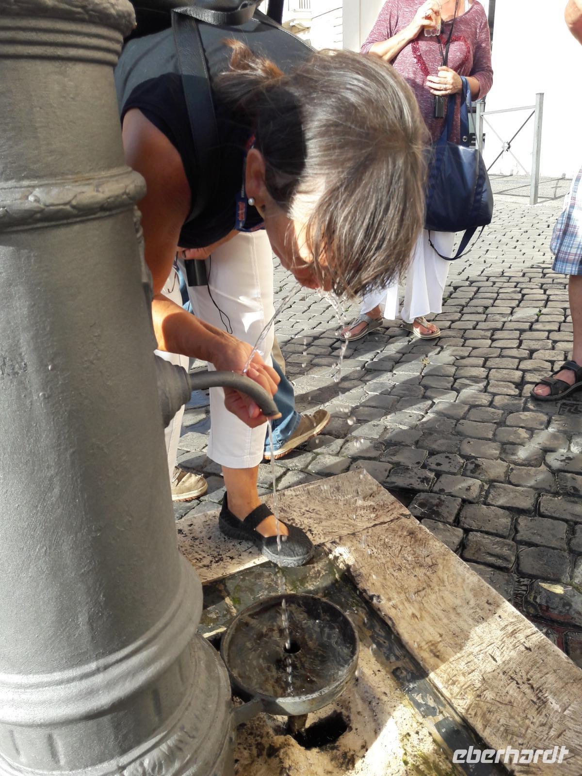Im Lied „wo alle Brünnlein fließen..." heißt es doch weiter „da soll man trinken..." Das wollen wir auf jeden Fall auch. Doch wir entscheiden uns nicht für das sogenannte „Wohnzimmer der Römer", wie man die Piazza gern nennt, sondern eher für das „Blumenfeld" oder besser noch für die „Blumenwiese" (Campo die Fiori). Nach dem Genuss eines Wassers (?), eines Gläschen Vinos oder, oder, oder fühlen wir uns wieder gestärkt und aufnahmebereit für Norberts Ausführungen. Wir sind gespannt, was er uns an diesem Nachmittag noch alles zeigen wird.