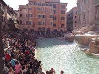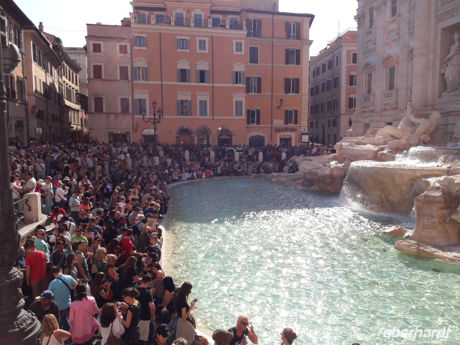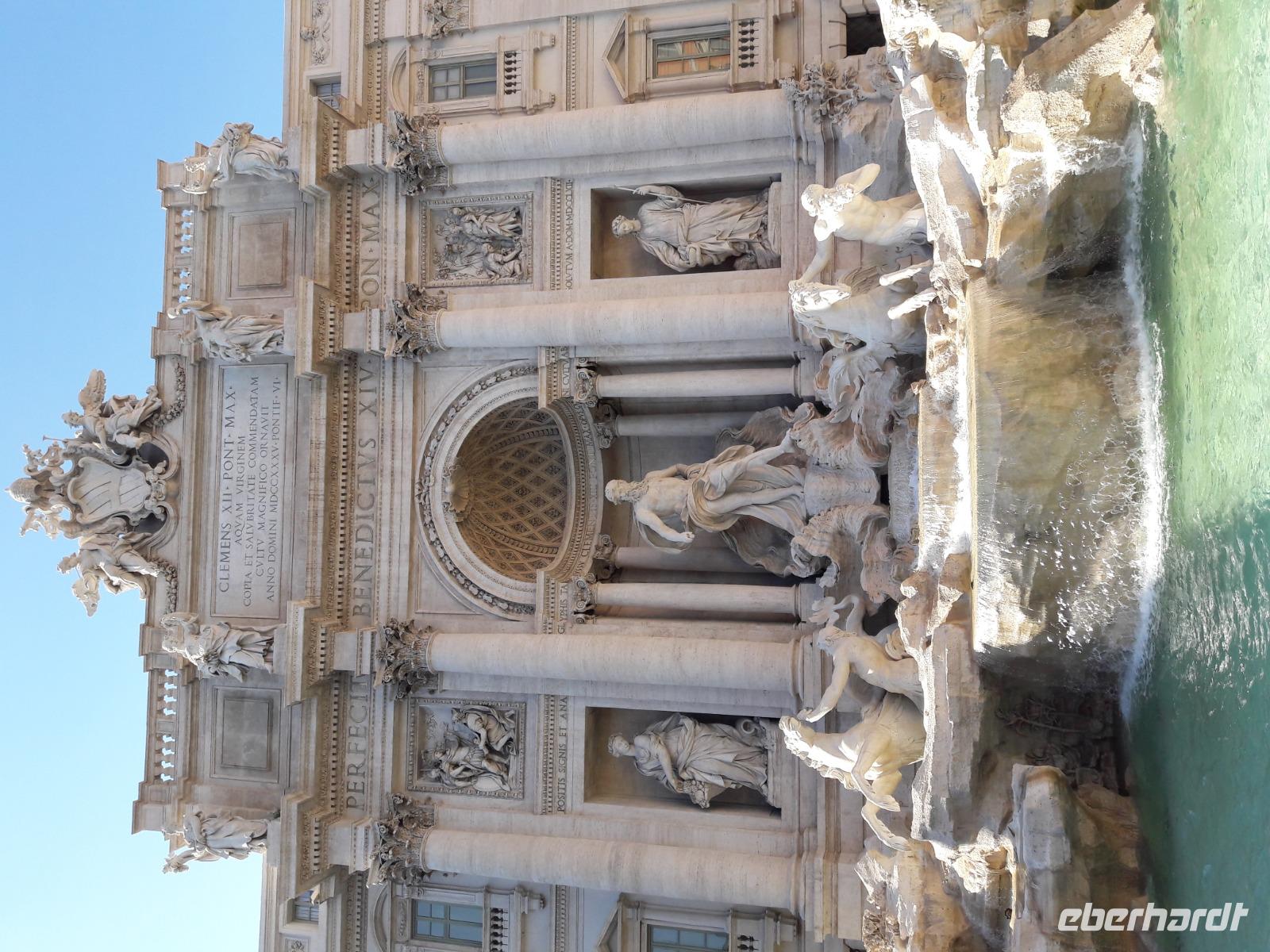 Nach dem Frühstück, das wie immer sehr vergnüglich verläuft, fahren wir mit dem Bus bis zum Marcello Theater, wo uns Norbert bereits erwartet. Mit ihm spazieren wir entlang der Piazza Venezia. Der Platz, der sowohl von dem neoklassizistischen Nationaldenkmal MONUMENTO NAZIONALE VITTORIO EMANUELE II. (im Volksmund auch „Schreibmaschine" oder „Hochzeitstorte" genannt) als auch von dem Verkehrschaos, das von allen Seiten auf ihn zuschießt, beherrscht wird , ist einfach nur nervenaufreibend und wir sind froh, ihn bald verlassen zu dürfen. Wir schlängeln uns nochmals durch bisher unbekannte Straßen, dankbar für jede schattenspendende Gelegenheit. Stolz, vielleicht auch ein wenig wehmütig zeigt uns Norbert bei dieser Gelegenheit seine ehemalige Bildungsstätte und dann stehen wir auch schon vor einem der schönsten, zumindest bekanntesten, Brunnen Roms, dem TREVI-BRUNNEN.