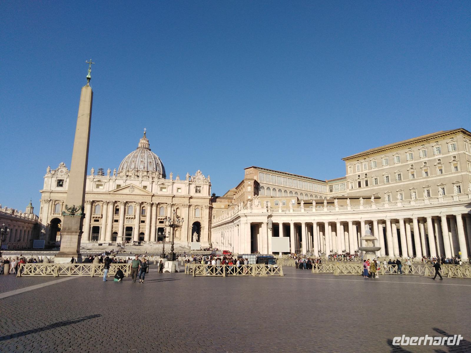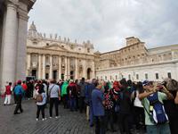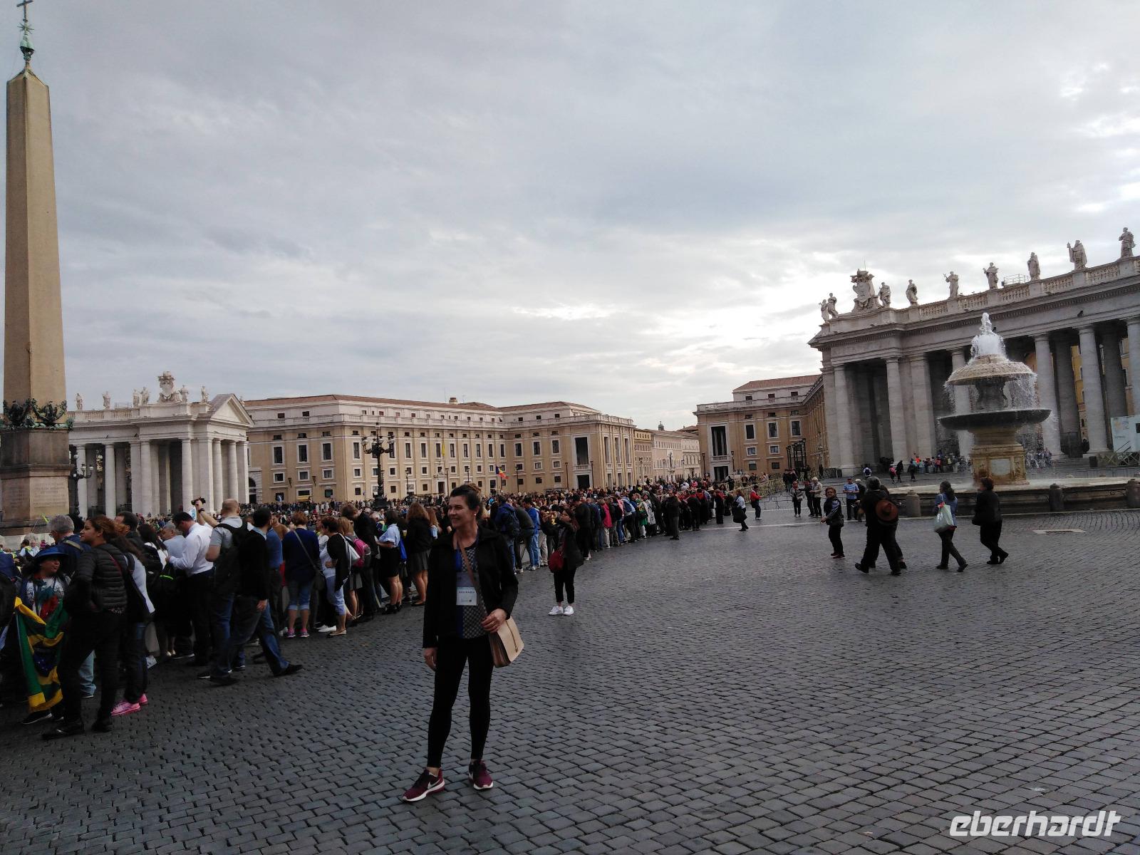 Schon um 7.45 Uhr traf sich unsere Gruppe im Foyer des Hotels, um pünktlich zur Audienz zu Papst Franziskus zum Petersplatz zu gelangen. Wir liefen vom Hotel zum Petersplatz und trafen dort auf Cristina. Nach 40 Minuten, wir hatten uns in die Pilgergruppen eingereiht, konnten wir den Petersplatz erreichen, natürlich nicht ohne gründliche elektronische Kontrollen über uns ergehen zu lassen.