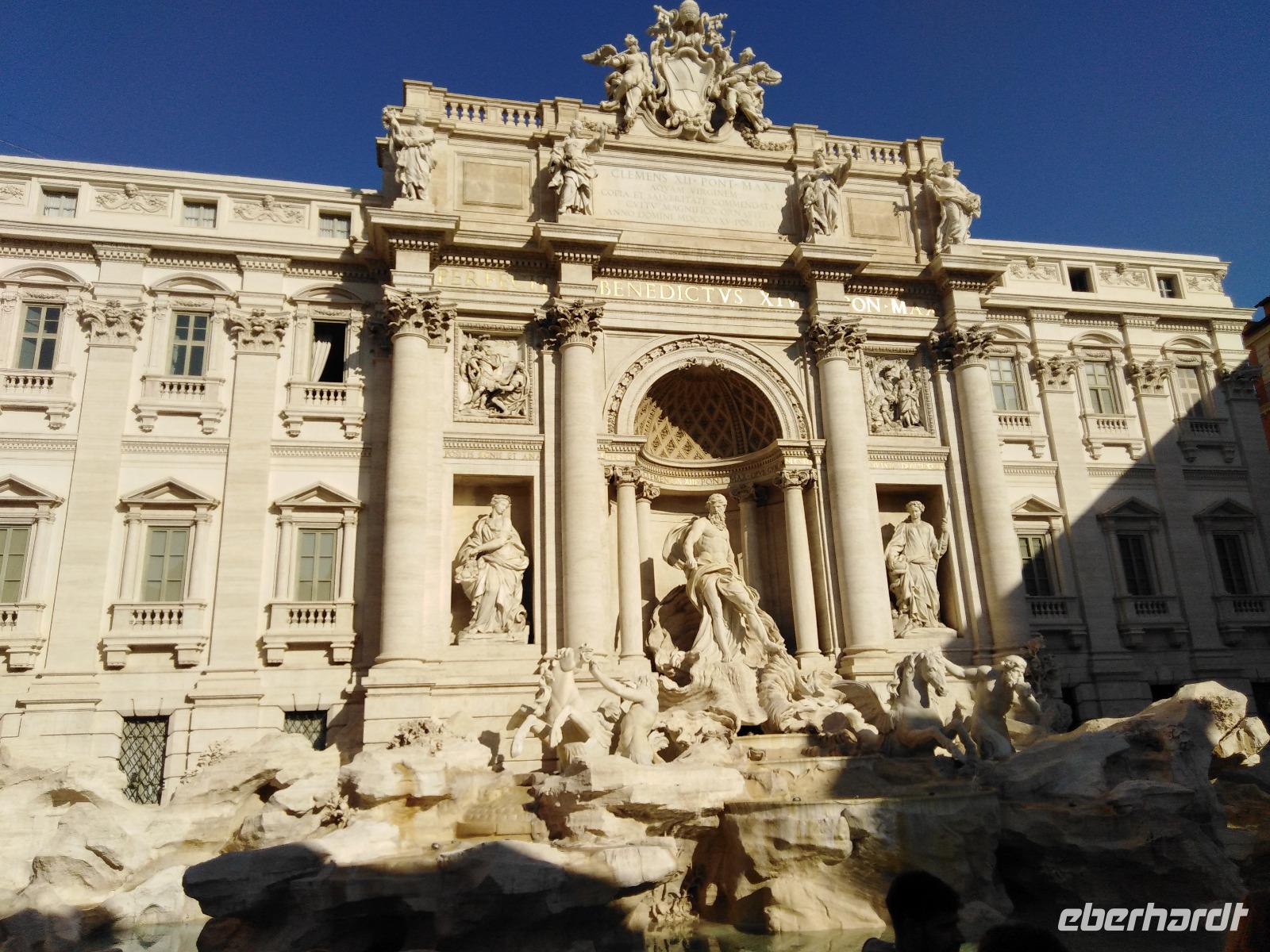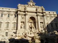 Nach dem Frühstück gelangten wir 9.45 Uhr am Trevi-Brunnen an, dort empfing uns schon Cristina. Zu dieser Tageszeit befanden sich noch wenige Besucher am Brunnen, gerade wurde das in den Brunnen geworfene Geld von der römischen Stadtverwaltung sichergestellt. Auch die sich in den Brunnen ergießenden Fontänen waren noch nicht in Betrieb. Allmählich aber begann sich der Platz zu füllen und die Wasser zu fließen. In der Mitte unter einem dreiachsigen Triumphbogen residiert Okeanus, auf einem Muschelwagen stehend, der von Seepferdchen und Tritonen gezogen wird. Noch heute kontrolliert er die Münzen, die in den Brunnen geworfen werden. Jeder möchte schließlich in die Stadt zurückkehren - irgendwann.