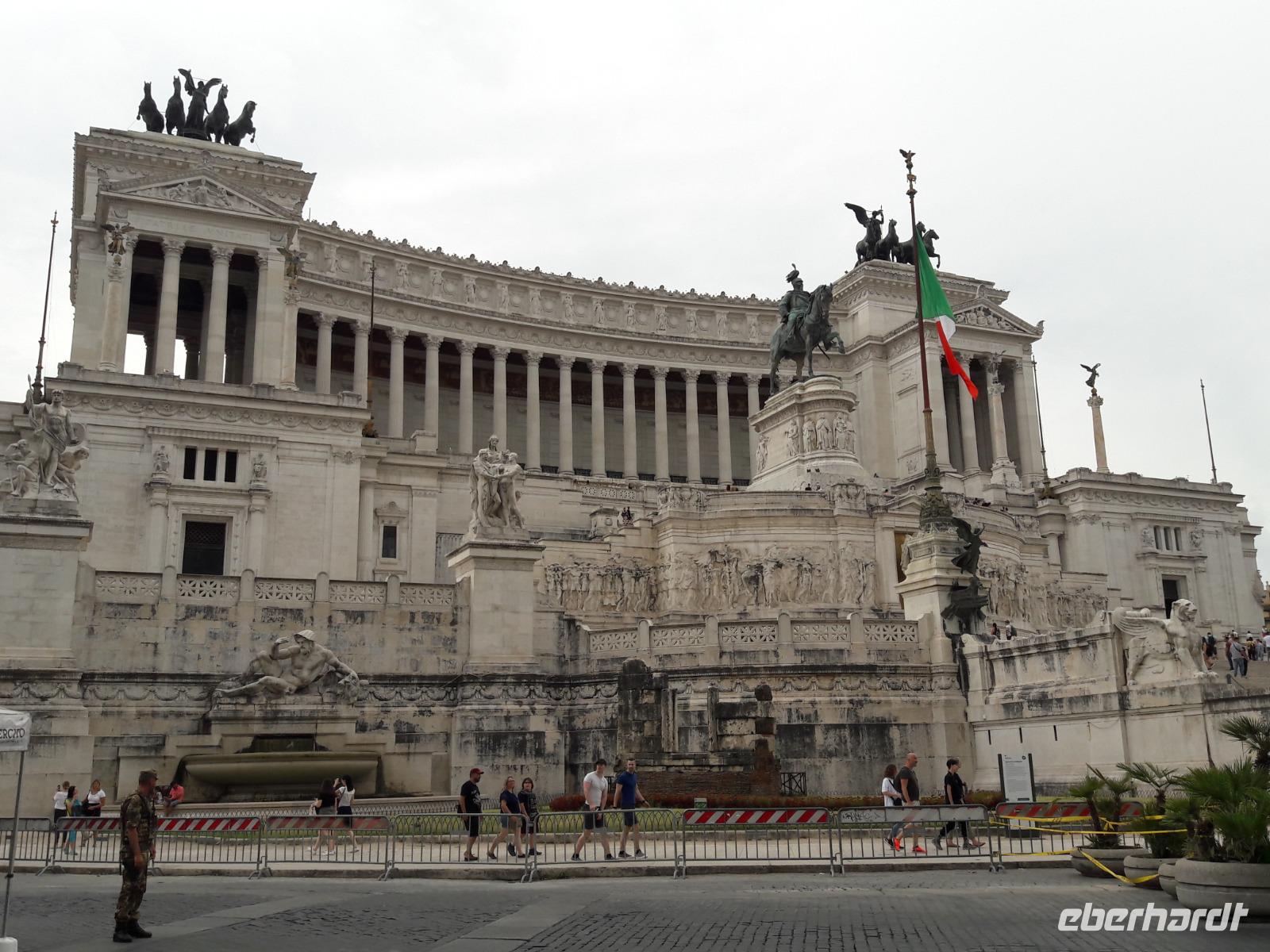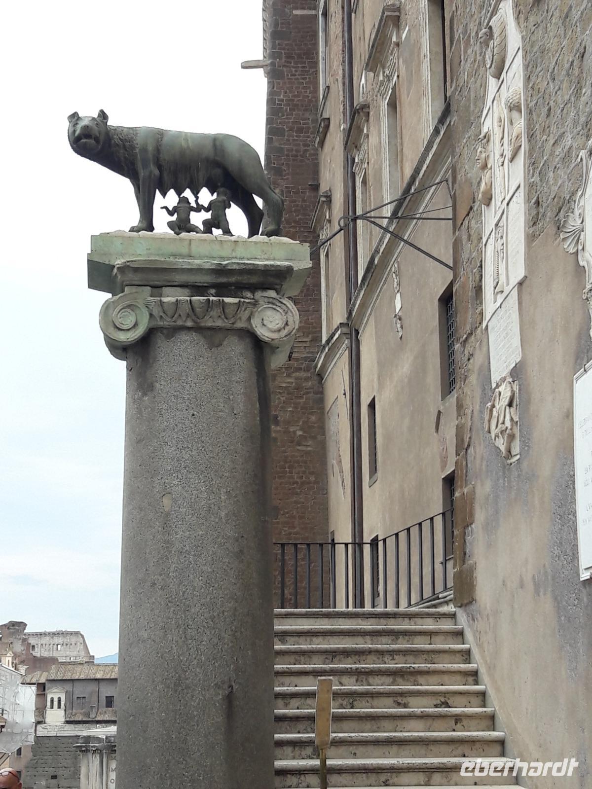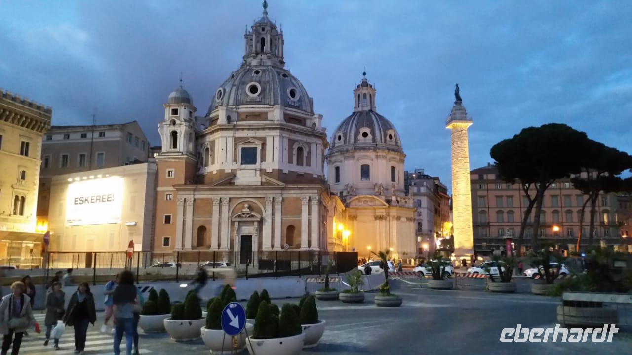 So ganz nebenbei werfen wir auch einen Blick auf die gegenüberliegende Trajanssäule und die ehemaligen Trajansmärkte, das sogenannte Einkaufscenter der Römer. Wir „huldigen" auch kurz dem bekanntesten römischen Imperator Julius Cäsar und spazieren hinauf auf den Kapitolshügel, den kleinsten der sieben Hügel, den Hügel der Götter und des Ruhms. Vorbei an der Wölfin mit den Romgründern Romulus und Remus erreichen wir die Piazza del Campidoglio, wo wir von Kaiser Marc Aurel (hoch zu Ross) begrüßt werden. Über die Cordonata (Rampentreppe) kommen wir zur Piazza Venezia. Der Platz wird vom pompösen, neoklassizistischen Nationaldenkmal „Monumento Nazionale Vittorio Emanuele II. (heute im Volksmund nur kurz „Schreibmaschine" oder „Hochzeitstorte" genannt) ebenso beherrscht wie von dem Verkehrschaos, das von allen Seiten auf ihn zuschießt. Ab hier gehen wir „getrennte Wege". Während Sie sich noch ein wenig durch das Gewimmel der Stadt kämpfen, spaziere ich zurück zum Hotel und begrüße die aus Stuttgart eingeflogenen Gäste.