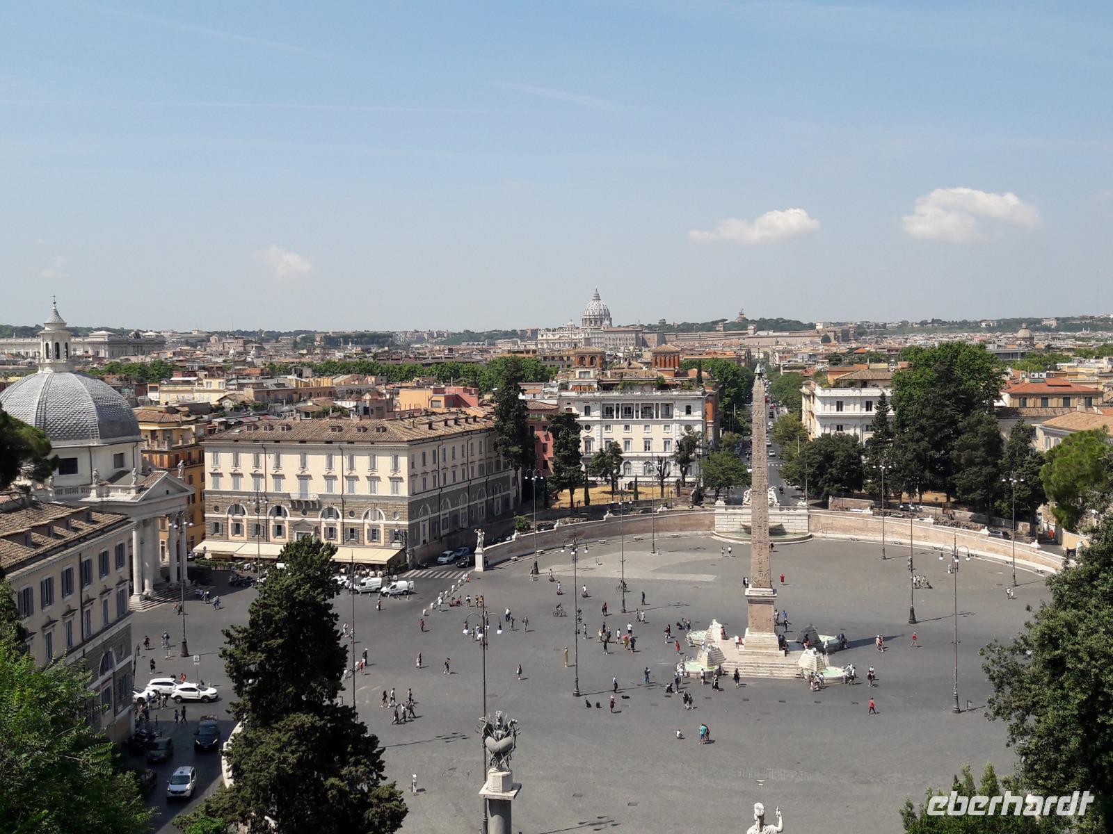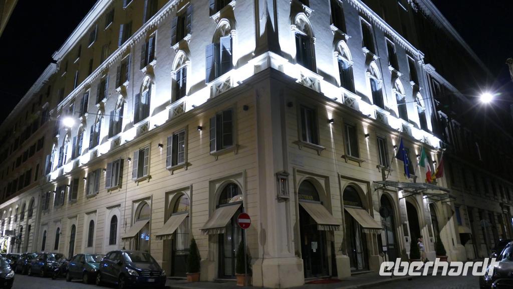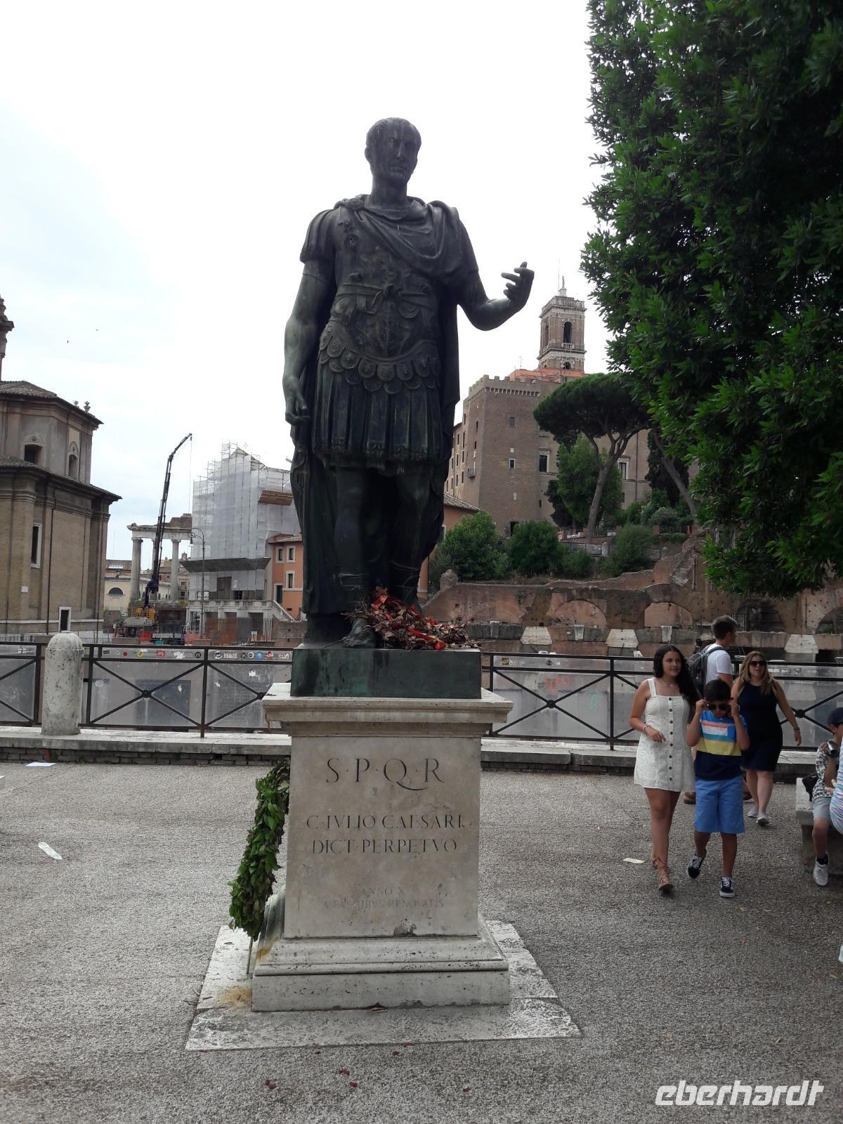 So ganz nebenbei werfen wir auch einen Blick auf die gegenüberliegende Trajanssäule und die ehemaligen Trajansmärkte, das sogenannte Einkaufscenter der Römer. Wir „huldigen" auch kurz dem bekanntesten römischen Imperator Julius Cäsar und spazieren hinauf auf den Kapitolshügel, den kleinsten der sieben Hügel, den Hügel der Götter und des Ruhms. Vorbei an der Wölfin mit den Romgründern Romulus und Remus erreichen wir die Piazza del Campidoglio, wo wir von Kaiser Marc Aurel (hoch zu Ross) begrüßt werden. Über die Cordonata (Rampentreppe) kommen wir zur Piazza Venezia. Der Platz wird vom pompösen, neoklassizistischen Nationaldenkmal „Monumento Nazionale Vittorio Emanuele II. (heute im Volksmund nur kurz „Schreibmaschine" oder „Hochzeitstorte" genannt) ebenso beherrscht wie von dem Verkehrschaos, das von allen Seiten auf ihn zuschießt. Ab hier gehen wir „getrennte Wege". Während Sie sich noch ein wenig durch das Gewimmel der Stadt kämpfen, spaziere ich zurück zum Hotel und begrüße die aus Stuttgart eingeflogenen Gäste.