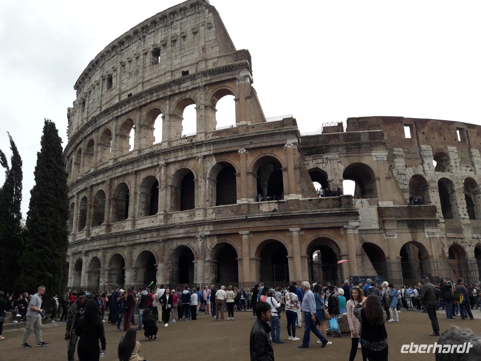 Nachdem wir die Flughafenabfertigung und den Bustransfer zum Hotel „Empire Palace" problemlos gemeistert haben, verabreden wir uns zu einer ersten kleinen Spritztour. Aber nicht, ohne uns vorher erst einmal richtig zu stärken. Gut gelaunt und voller Neugierde machen wir uns anschließend auf den Weg. Mit der Metro fahren wir bis zur Station Kolosseum. Wir sind sofort überwältigt, die einen vom Anblick des Kolosseums, die anderen von den zahlreichen Menschen, die hier - Ameisen gleich - sich hin und her bewegen. Das ist es also, das Kolosseum, das größte Amphitheater der Römerzeit (die Zuschauerangaben schwanken zwischen 50 und 80.000), errichtet in nur acht Jahren! 80 n. Chr. war es fertig und wurde von Kaiser Titus eingeweiht. Nur acht Jahre Bauzeit, das ist kaum zu glauben. Dafür dauerte die Einweihungsfeier nicht nur einen Tag, sondern ganze 100! Nach Neros relativ schrecklicher Regierungszeit wollte man dem Volk wieder etwas bieten. Mit „Panem et circenses" (Brot und Spiele), den Veranstaltungen, die öffentlich und kostenlos waren, versuchten die Kaiser ihre absolute Macht zu erhalten. Allerdings gefiel nicht jedem Römer diese Art der Volksbelustigung.