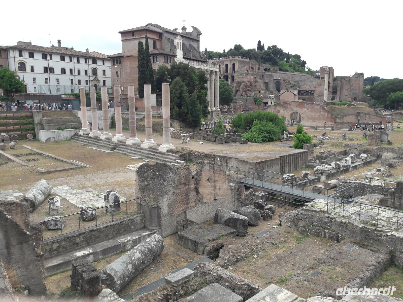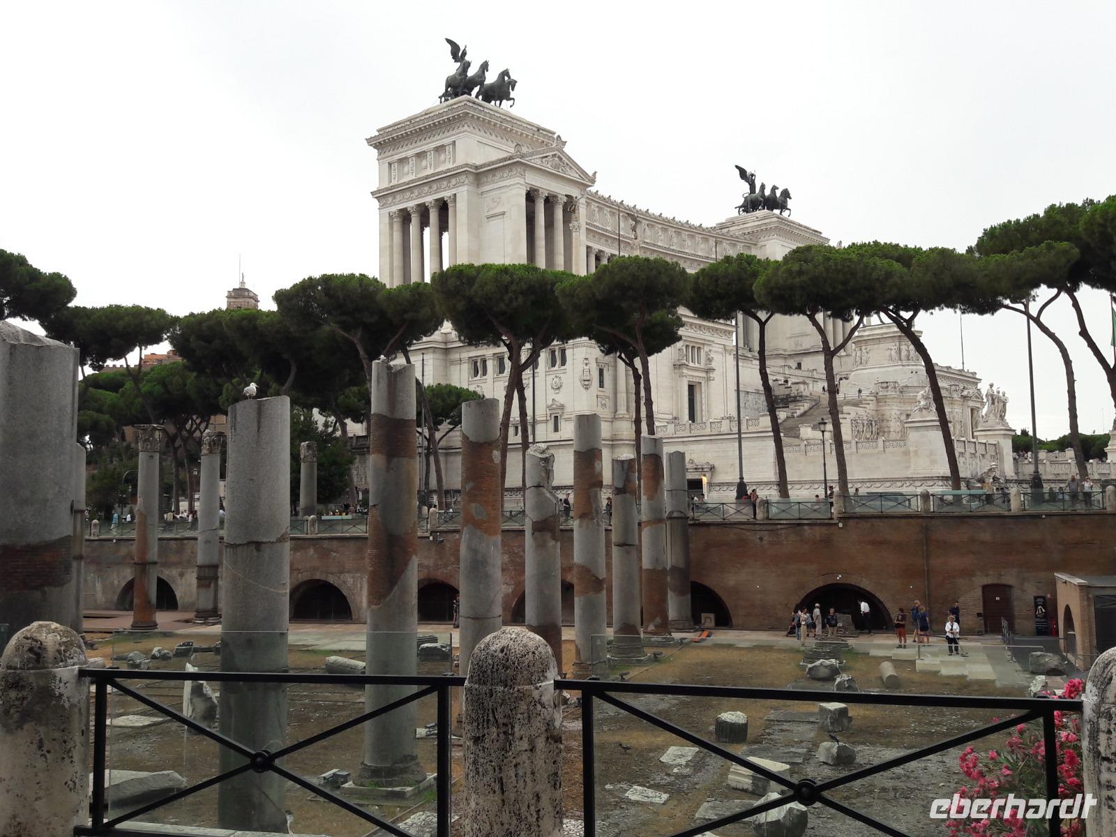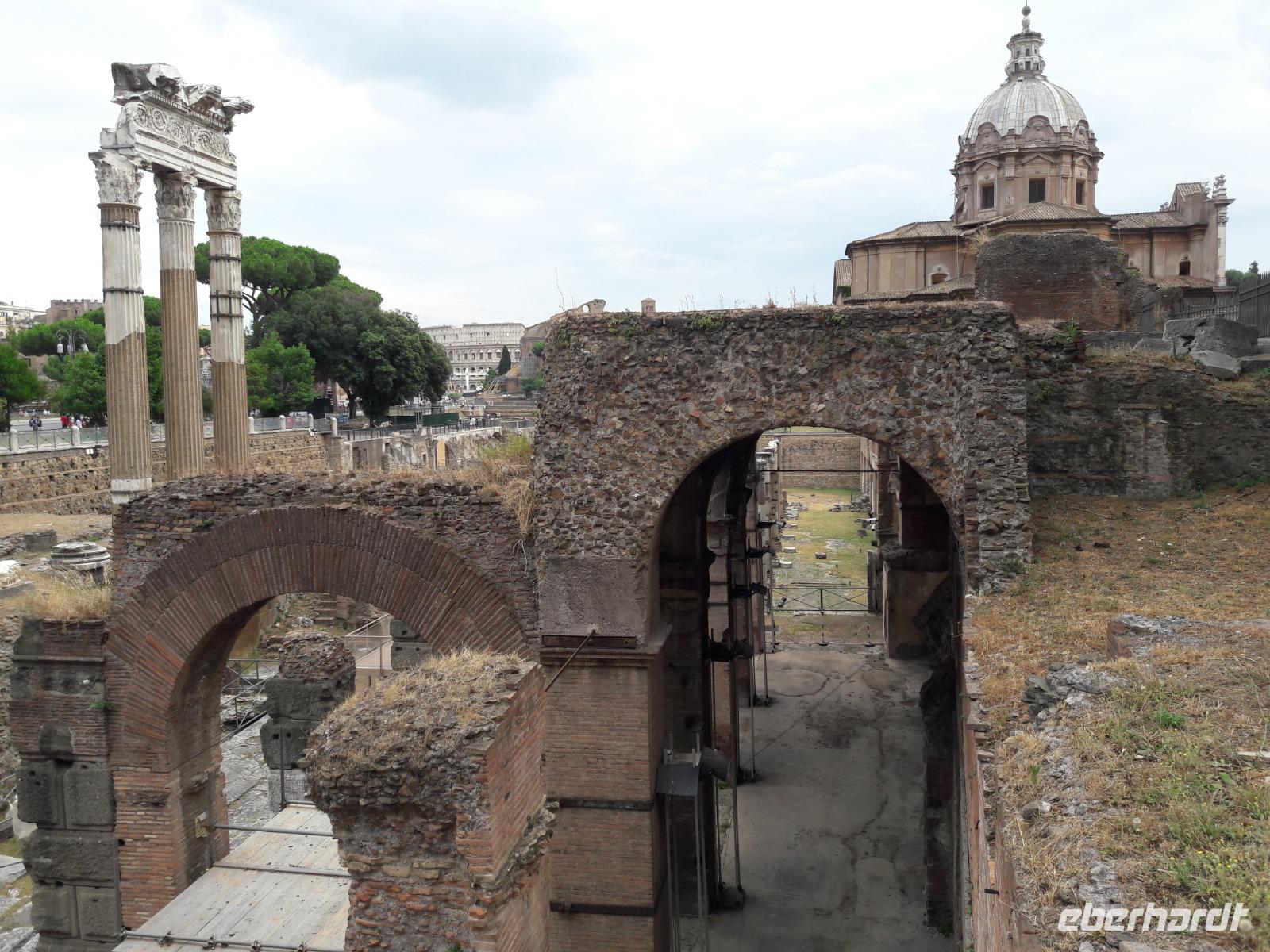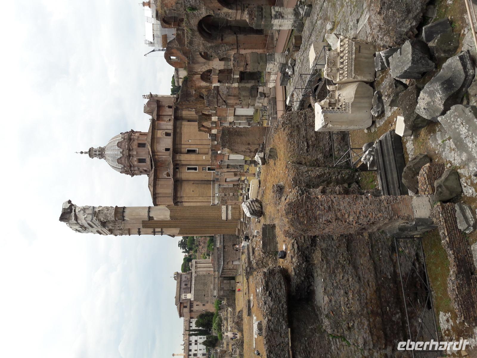 Nachdem wir einige Schnappschüsse von diesem Koloss sowie dem in der Nähe stehenden Konstantinbogen gemacht haben, spazieren wir weiter entlang der Via die Fori Imperiali, einer 1932 errichteten Straße durch die archäologische Hauptzone der Stadt. Immer wieder werfen wir dabei einen Blick in das Forum Romanum, das vor allem zur Zeit der Römischen Republik das Herz des politischen, religiösen und kulturellen Lebens der Stadt war. Hier, zwischen den Hügeln Kapitol und Palatin, spielte sich quasi das Alltagsleben ab. Heute ist es ein Park mit Ruinen aus verschiedenen Epochen des römischen Reiches.