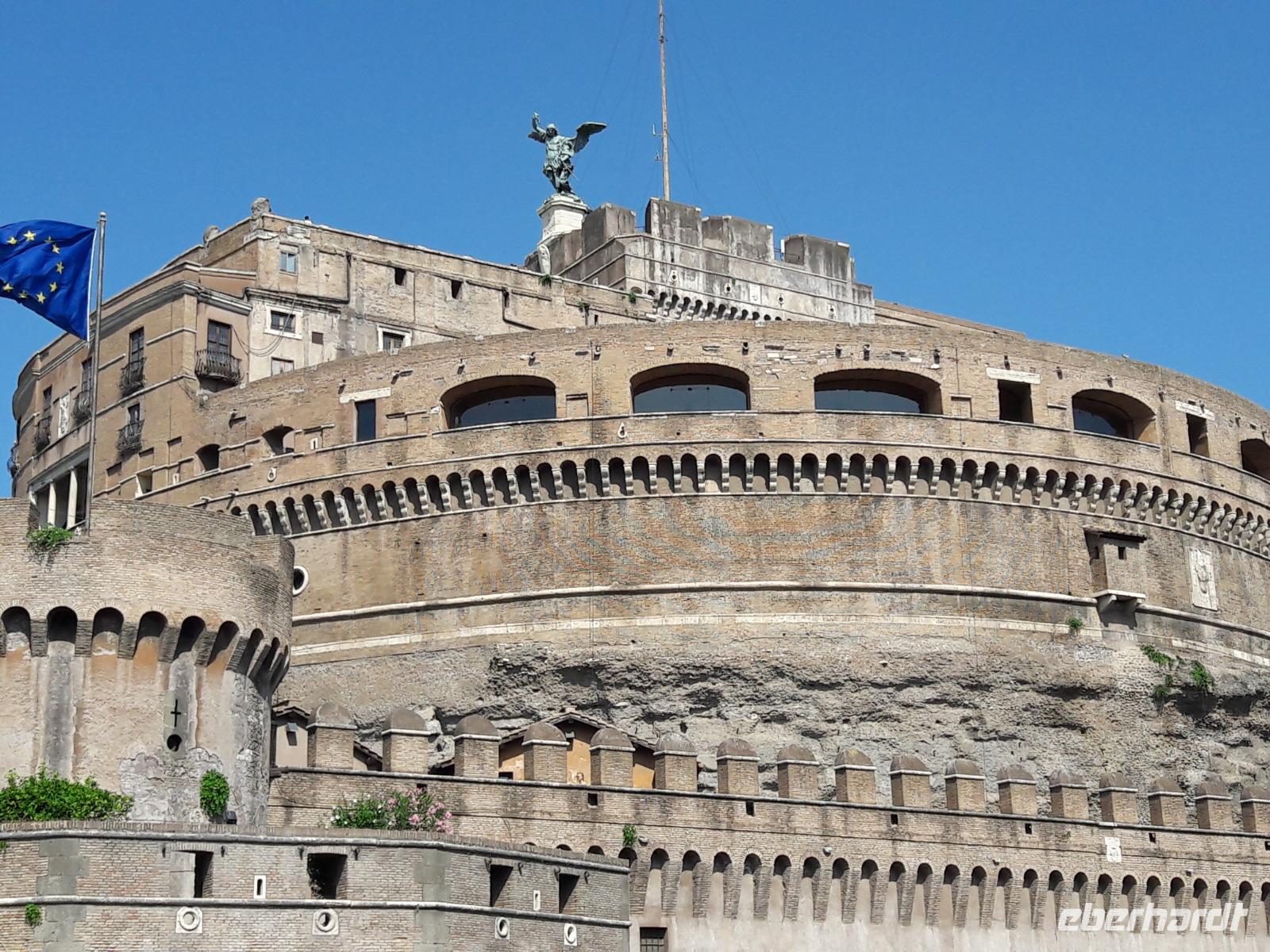 Müssen wir es tatsächlich noch lernen? Freuen wir uns nicht schon die ganze Zeit auf diese sagenumwobene und geschichtsträchtige Stadt!? Hat uns der Spaziergang am Anreisetag nicht neugierig gemacht? Oh ja, wir freuen uns! Nachdem uns die Sonne wachgekitzelt hat, wir uns gestärkt haben, fahren wir mit dem Bus zur Piazza Cavour. Beeindruckt von dem grandiosen Anblick des Justizpalastes übersehen wir fast Sylvia, unserer Stadtführerin für die nächsten vier Tage, die auf einer Bank noch etwas die Seele baumeln läßt. Gemeinsam spazieren wir zur Engelsburg, dem ehemaligen Mausoleum des Kaisers Hadrian. Das Hadrianeum erhielt seinen heutigen Namen nach dem Engel, der Papst Gregor 590 n. Chr. über dem Mausoleum erschien.