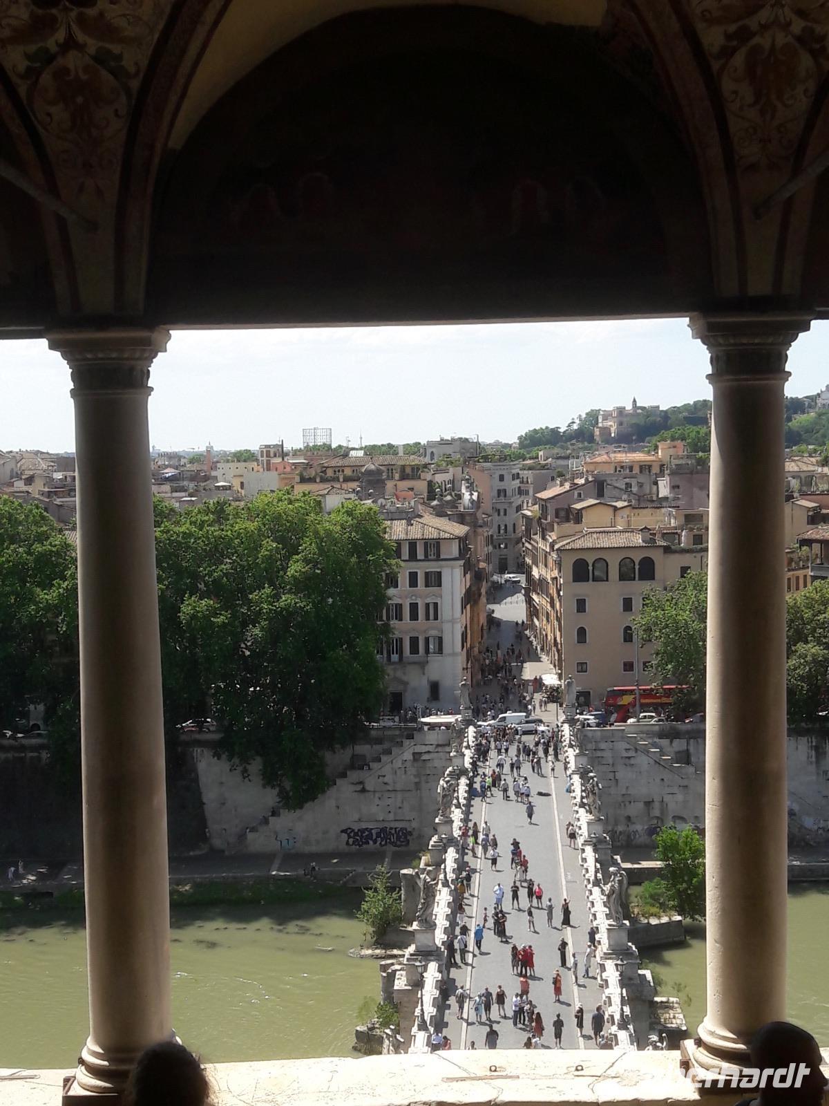 Indem er das Schwert in die Scheide steckt, soll er das Ende der gerade wütenden Pest angekündigt haben. Die Bronzenachbildung dieses Engels ist auf der Spitze des Mausoleums weithin sichtbar. Von der Plattform unterhalb des Engels genießen wir im Anschluß an die sehr inhaltsreiche Führung durch die „Burg", die im Laufe der Zeit Grabmal der Kaiser, Festung, Fluchtburg, Gefängnis, aber auch prachtvolle Papstresidenz war, den traumhaft schönen Blick (es ist einer schönsten) auf „Mamma Roma". Abschließend werfen wir auch noch einen „sehnsüchtigen" und „träumerischen" Blick auf die funkelnden Steine und außergewöhnlichen Gewänder der Bulgari - Ausstellung, die gegenwärtig in den Räumen der Engelsburg integriert ist.