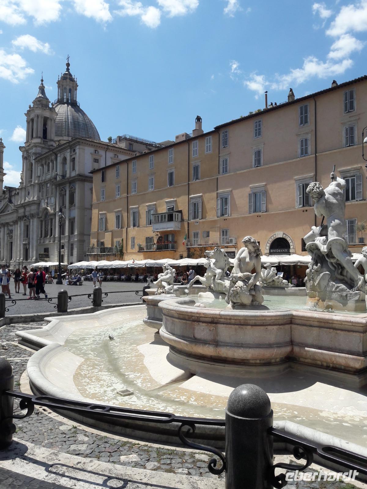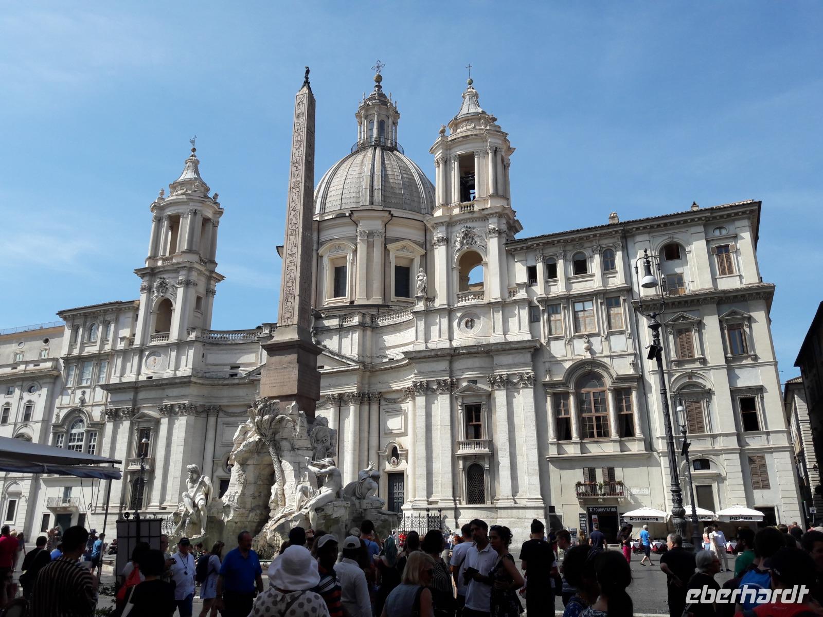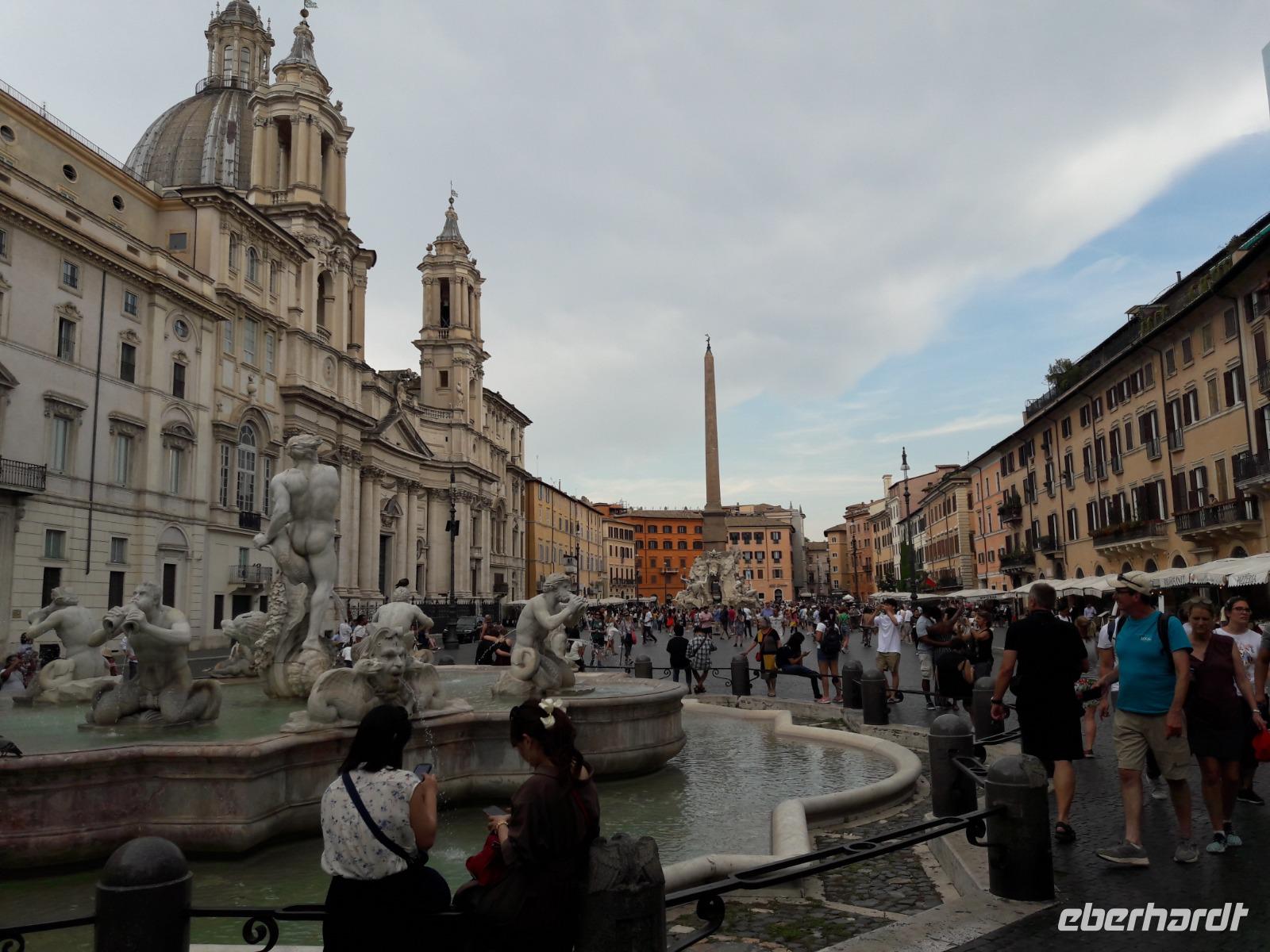 Wir spazieren über die Engelsbrücke, die schönste Brücke Roms und überqueren somit den Tiber, einst die Lebensader der Stadt. Trotz sengender Hitze bummeln wir weiter durch enge Gassen und Gässchen und erreichen kurze Zeit später die Piazza Navona - den Platz,„wo alle Brünnlein fließen". Na ja, eigentlich sind es nur drei, aber was für welche! Im Stile des Barocks erbaut, dominieren sie den Platz, der einst auf einem darunterliegenden Stadion des Kaisers Domitian gebaut wurde (deshalb die ovale Form). Ein wunderbares Ensemble bildet die von Borromini erbaute Kirche S. Agnese in Agone (wir werfen schnell einen Blick hinein und sind angenehm überrascht) mit dem Vier-Ströme-Brunnen. Der Brunnen, ein Meisterwerk von Bernini, dem „Rom-Stararchitekten" der Barockzeit, stellt die vier größten Flüsse der damals bekannten Erdteile dar. Der NIL stellvertretend für Afrika, die DONAU für Europa, der RIO DE LA PLATA für Amerika und der GANGES für Asien.