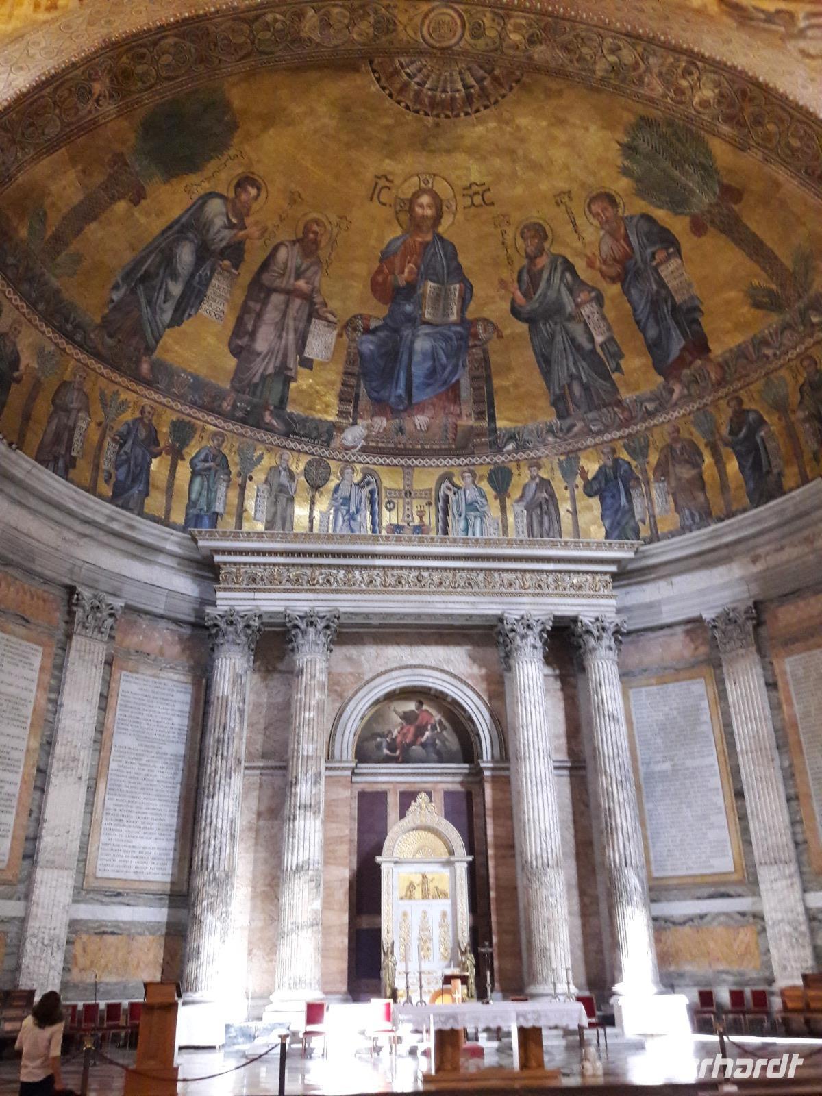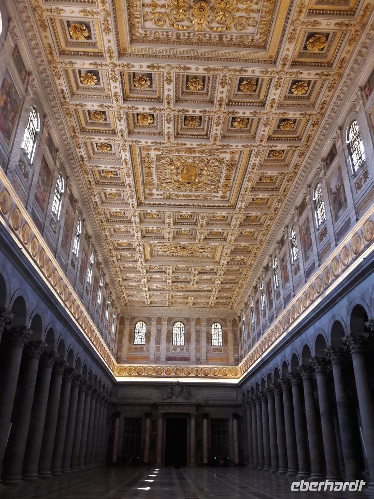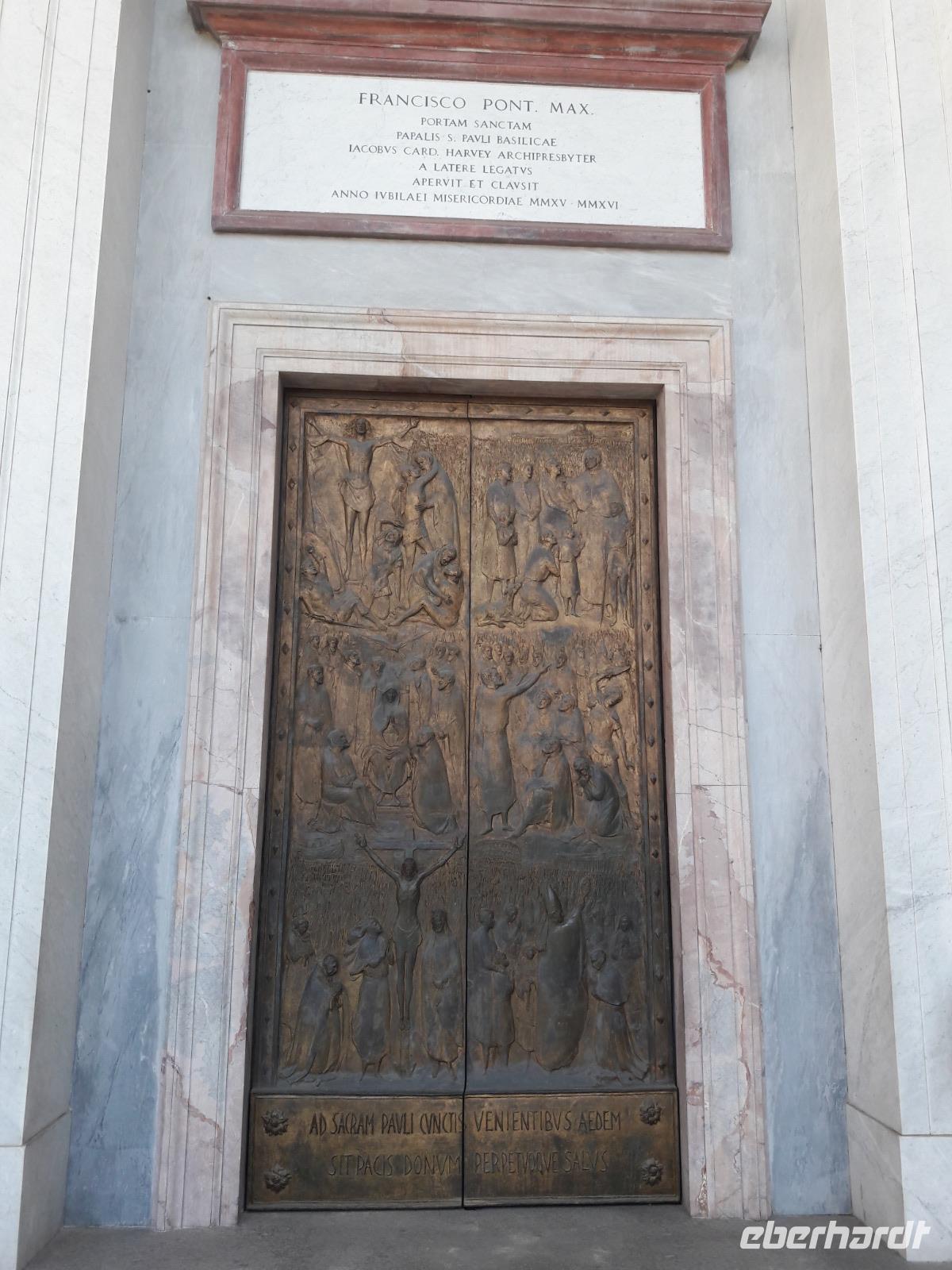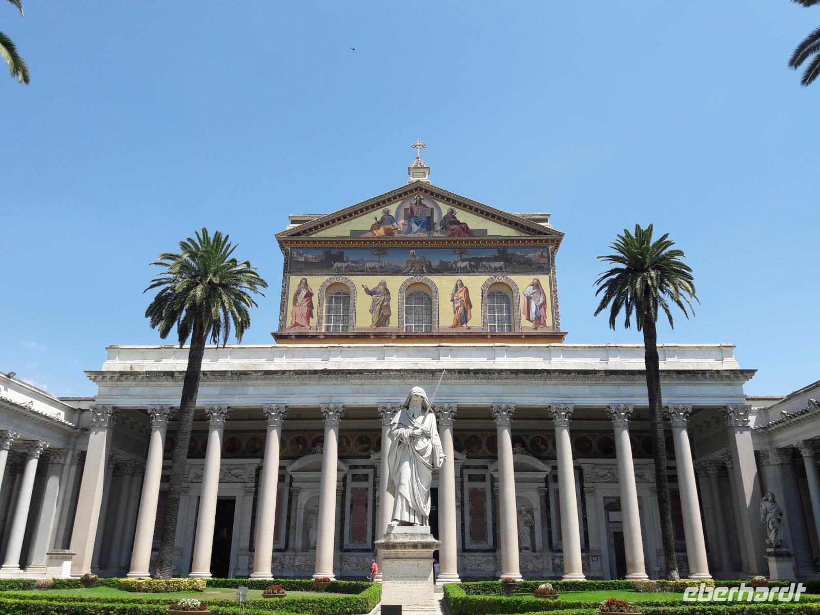 Hier, an dieser Stelle, soll der Hl. Paulus 67 n. Chr. enthauptet worden sein. Kaiser Konstantin ließ ihm zu Ehren später - im 4. Jahrhundert - eine Basilika errichten, die nachträglich von den Benediktinermönchen erweitert wurde. Diese Basilika soll seinerzeit an Pracht sogar die Basilika von Alt-Sankt-Peter übertroffen haben. Leider hat ein Brand im Jahr 1823 die Kirche weitestgehend zerstört. Gerettet wurden nur wenige Fragmente, so u.a. das Apsismosaik aus dem 13. Jahrhundert und die aus dem 11. Jahrhundert stammende Bronzetür, die sogenannte Heilige Pforte. Der 1854 abgeschlossene Wiederaufbau ist eine Rekonstruktion der frühchristlichen Basilika, hinzu kam 1925 noch das monumentale Säulenatrium.