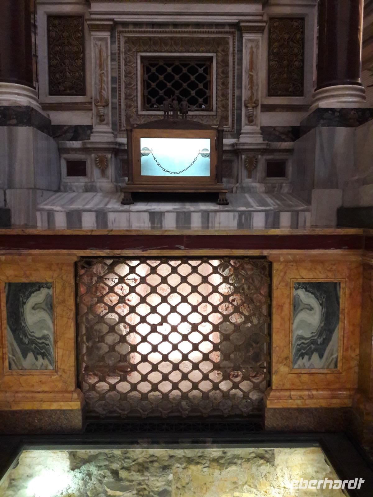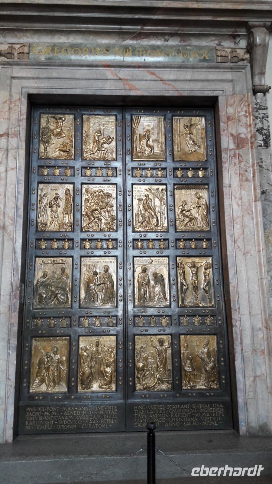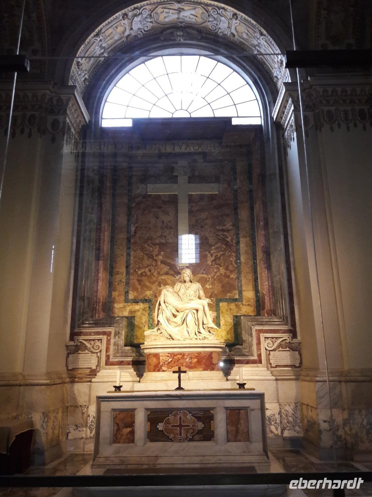 Danach gehen wir noch mit Sylvia - vorbei an der „Porta Santa" (sie ist nur zu Beginn eines Heiligen Jahres geöffnet), in den Petersdom. Der Innenraum, nahezu 190m lang, ist reich an unzähligen Meisterwerken - er hat 45 Altäre, 11 Kapellen und besteht aus drei Schiffen sowie einem Querschiff von 137,5 m Breite und einer 136,5 m hohen Kuppel (ganz locker könnte er den Kölner Dom in sich aufnehmen). Überall findet man Papststatuen und Grabmäler. Am meisten fasziniert mich immer wieder die „Pieta" von Michelangelo, sie ist sooooo schön, so ergreifend!