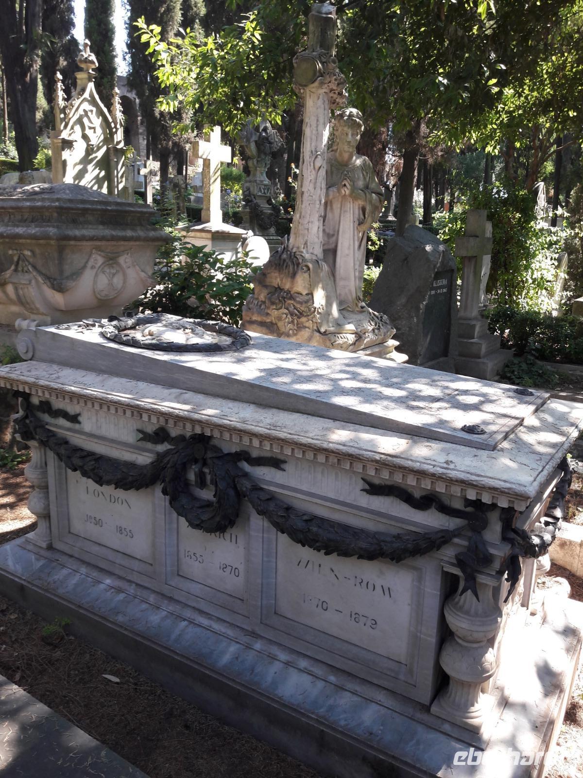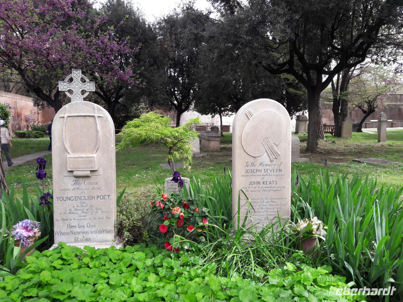 Ägypten Mode (12 v. Chr.) hatte errichten lassen, erreichen wir einen der stimmungsvollsten Orte Roms, den Cimitero Acattolico. Hier finden wir nicht nur schattige Fleckchen, sondern eine richtig wohltuende Atmosphäre. Wir bummeln durch die sehr gepflegte Anlage und entdecken dabei - neben zahlreichen unbekannten griechischen, russischen, englischen und deutschen Gräbern - auch die einiger, uns bekannter Prominenter. Hier ruhen u.a. die englischen Schriftsteller Keats und Shelley, die Gattin von Axel Munthe, einem vor allem in Neapel und auf Capri sehr geschätzten schwedischen Arzt, aber auch „ unser" Gottfried Semper hat hier seine letzte Ruhestätte gefunden. Neben ihm gilt unser besonderes Interesse natürlich dem Grab von Goethes Sohn August („Gustl"). Für den schlicht wirkenden Grabstein hat J. W. v. Goethe den Grabspruch „Goethe filius patri antevertens"