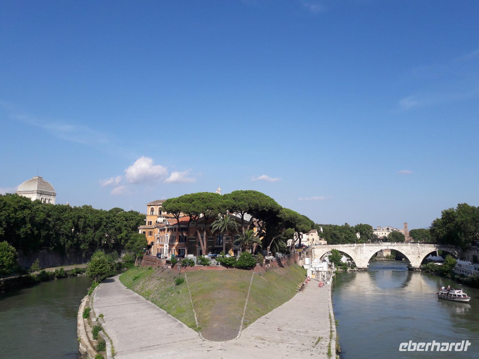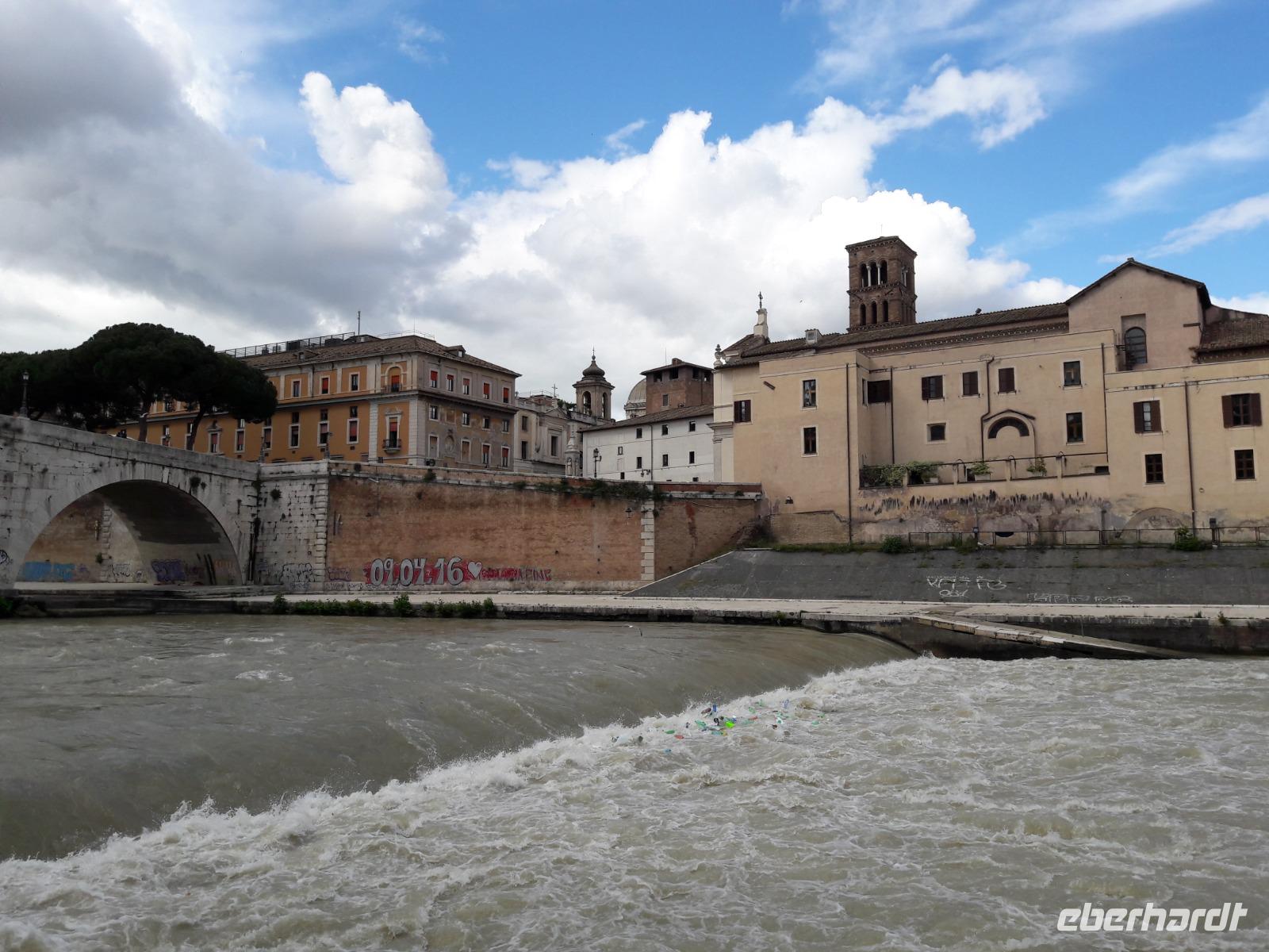 Auch wenn es vielleicht etwas seltsam klingen mag, so verlassen wir dennoch den Friedhof mit einem Gefühl der Zufriedenheit und der inneren Ruhe. Auf Grund des sehr umfangreichen Programms und der wirklich „außerirdischen" Temperaturen zieht es nahezu alle Gäste nur noch zum Hotel bzw. in eine naheliegende Trattoria. Nur zwei Gäste verspüren noch Lust und Laune, mit mir auf eine weitere Entdeckungstour zu gehen. In Sylvias „Privattaxi" werden wir zur kleinen Kirche „Santa Maria in Cosmedin" chauffiert. Dort in der Vorhalle wartet noch der sogenannte „Lügendetektor", der Mund der Wahrheit (Bocca della Veritá) auf uns. Jetzt wird sich zeigen, wer die Wahrheit sagt oder wer ein Lügner ist...Glücklicherweise behalten wir drei unsere beiden Hände und so können wir auch noch ganz gelassen einen Blick in das Innere der Kirche, besonders auf den hübschen Mosaikfußboden, werfen. Über die Tiberinsel, wo wir ein ganz, ganz leckeres Basilikumeis schleckern (hm, hm, hm), erreichen wir Trastevere - das etwas andere Rom. Die Trasteverini behaupten gern, dass ihr Bezirk älter sei als Rom und sie bezeichnen sich stolz als die „Romani de Roma" - die wahren, echten Römer. Unsere Füße schaffen es gerade noch zur ältesten Marienkirche Roms, der Kirche „Santa Maria in Trastevere". Für einen Augenblick gönnen wir unseren geschundenen Füßen eine Erholungsphase und bestaunen die wunderschöne Innenausstattung. Der Weg hat sich gelohnt. Danach kennen wir nur noch einen Weg, den Heimweg...und der fällt uns an diesem Abend schon sehr schwer. Kein Wunder, denn am nächsten Tag erfahren wir, dass wir an diesem Tag - bei sengender Hitze - ca. 17/18 km gelaufen sind. Meine Hochachtung!