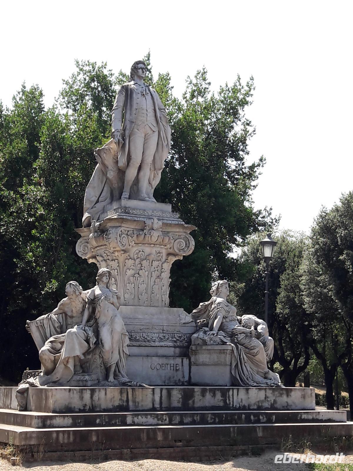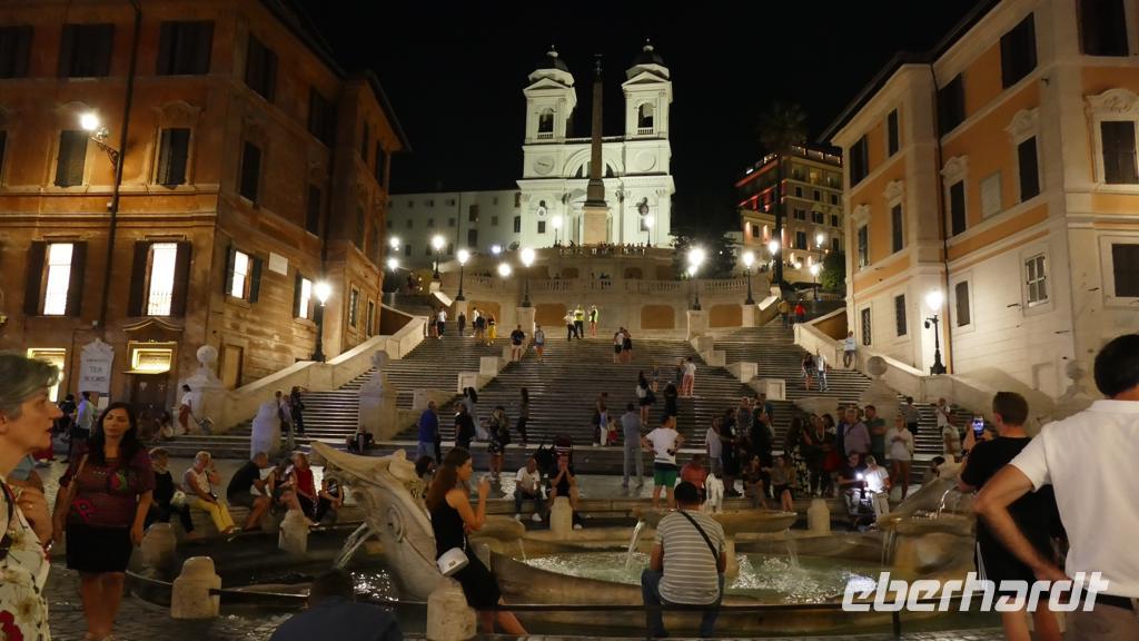 Für zwei Stunden dürfen wir uns hier tummeln und die Kunstwerke, die vorwiegend der kunstbesessene Kardinal Scipione Borghese mit „allen Mitteln" an Land gezogen hat, in Augenschein nehmen. Äußerst beeindruckend sind die wunderschönen Skulpturen des Gian Lorenzo Bernini, so u.a. „Der Raub der Prosperina" und „Apoll und Daphne". Aber auch die von Canova als siegreiche Venus dargestellte Gattin (Pauline) des Camillo Borghese ist ein richtiger „Hingucker". Insgesamt gesehen ist der Besuch der Galleria ein gelungener Einstieg in den Tag, zugleich aber auch ein absoluter Höhepunkt unserer Reise. Anschließend bummeln wir mit Sylvia noch ein bisschen durch die Villa Borghese, begrüßen unseren Geheimrat, den Herrn von Goethe und genießen bei musikalischer Untermalung den schönen Blick auf die Piazza del Popolo. Ganz entspannt laufen wir in Richtung Spanische Treppe. Unterwegs gibt es von Eberhardt noch eine kleine Überraschung, eine Abkühlung in Form eines ganz leckeren Eises. Dann schreiten wir die Treppe, die einst im Auftrag der Franzosen gebaut worden ist und eigentlich nach der, am oberen Ende befindlichen Kirche, benannt worden ist, herab. In Anlehnung an die angrenzende Piazza di Spagna wird die Scalinata delle Trinità (so lautet ihr richtiger Name) vielfach als Spanische Treppe bezeichnet. Die Treppe, die sich vor zwei Jahren einer „kosmetischen OP" unterzogen hat, erstrahlt nunmehr wieder in neuem Glanz. Hier - an und auf der Treppe - treffen sich Menschen aller Kontinente. Es gibt 138 Stufen zum Flirten - Lesen - Leute gucken oder einfach nur zum Ausruhen - aber bitte nicht zum Essen. Das ist strengstens verboten und wird von den wachsamen Augen der Gesetzeshüter geahndet. Ein Verstoß kann richtig teuer werden!
