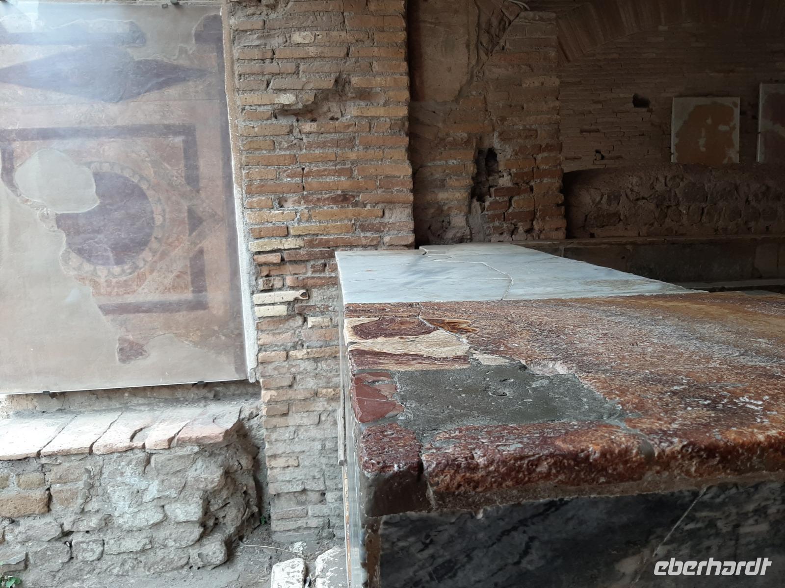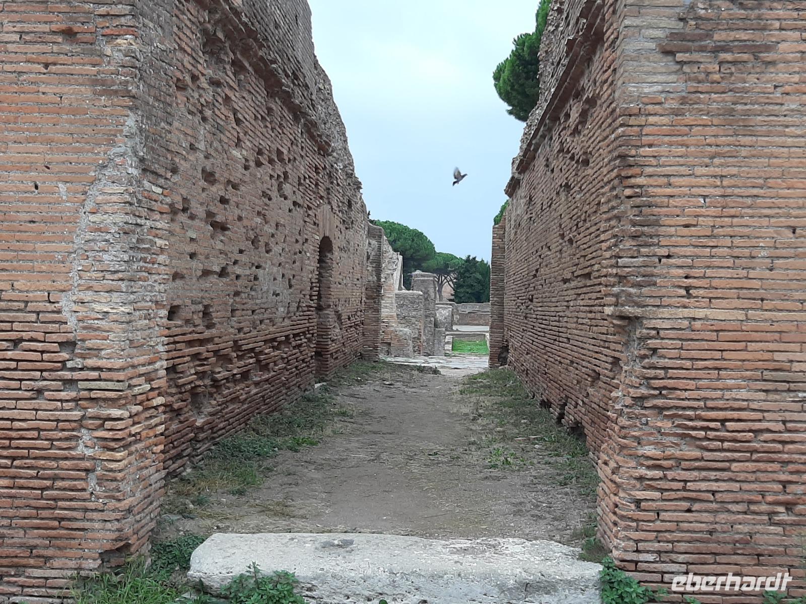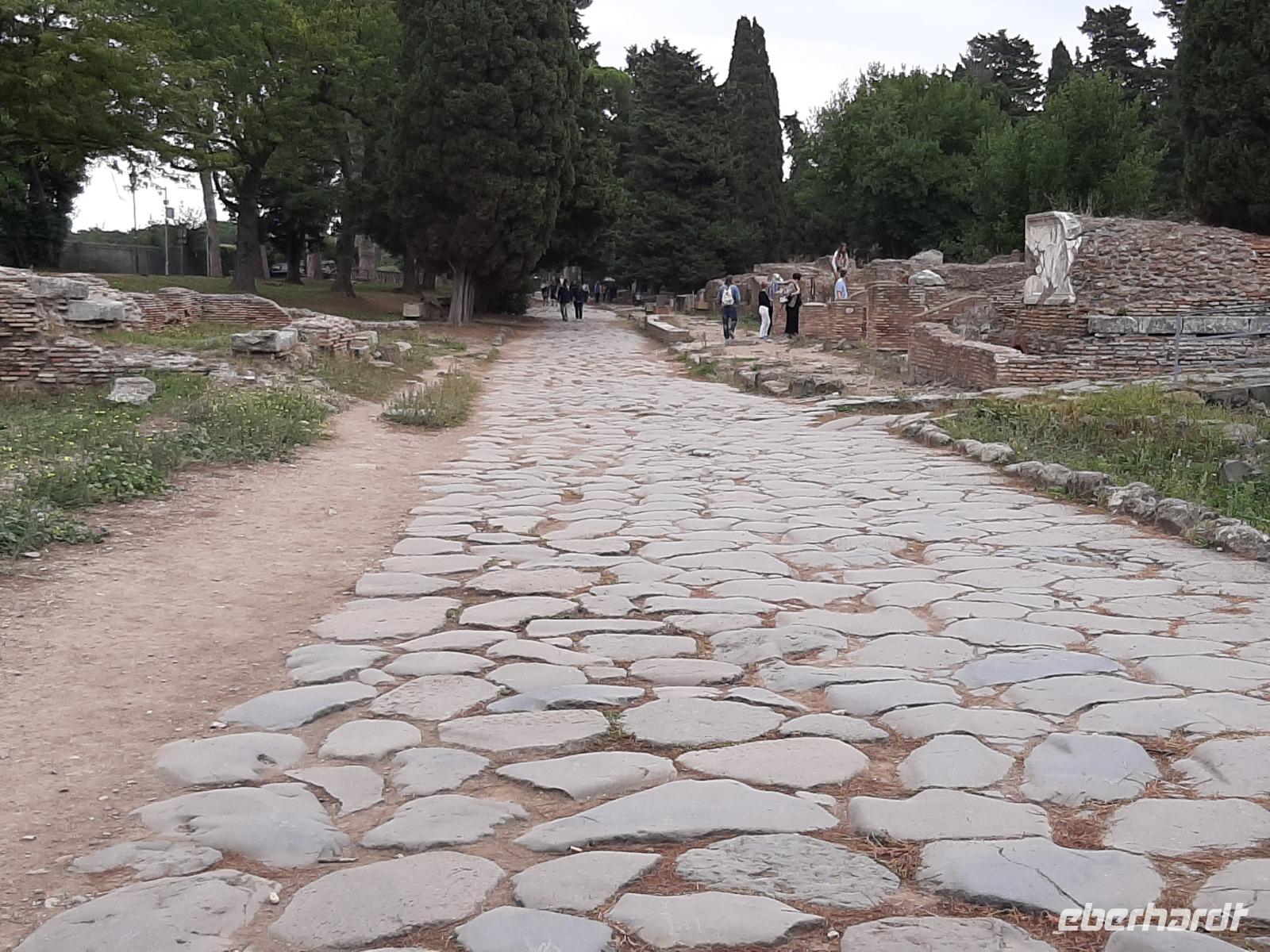 Nach dem wohlschmeckenden Frühstück vom Büffet, wenngleich der italienische Kaffee nicht ajedem deutschen Gaumen mundet, treffen wir uns an der Rezeption. Wir statten uns aus mit Stadtplänen, Audiogeräten und Tickets für die öffentlichen Verkehrsmittel Bus, Metro und S-Bahn und es geht los. Ein kurzer Fußweg zur nahegelegenen Bushaltestelle, mit dem Bus bis Piramide/Porta San Paolo, wo wir Sylvia treffen und dann mit der S-Bahn bis Ostia Anica, ca. 25 Kilometer südwestlich von Rom. Ostia Antica ist das Ausgrabungsgelände der antiken Stadt Ostia, der ursprünglichen Hafenstadt des antiken Rom. Der Name Ostia leitet sich von lateinisch ostium „Eingang; Mündung" ab, gemeint ist hier die Tibermündung. Ostia Antica gehört heute zu den bedeutendsten Ausgrabungsstätten der römischen Welt, vergleichbar ohne Weiteres mit Pompeji. Wir schlendern über Straßen mit originalen gewaltigen Pflastersteinen, durch alte Gassen zum Amphitheater, zum Markt, zur ehemaligen Ladenstraße mit den damaligen Versorgungseinrichtungen. Apropos Versorgung: wir versorgen uns auch, nämlich mit Regenschirmen und Regenumhängen im Souveniergeschäft. Der Regen hatte uns überrascht, war er doch nicht angekündigt. Nach dem Imbiss im Restaurant auf dem Gelände gehen wir zurück zur S-Bahn, um nach Rom zurückzufahren. Zwischen der heutigen Via Ostiense und dem Tiber befindet sich die Basilica Ostiense, die Pauluskirche von Rom, die wir nun besichtigen. Ihre exakte Bezeichnung lautet Kirche St. Paul vor den Mauern (San Paolo fuori le Mura). Sie trägt deshalb den Zusatz „vor den Mauern", weil sie sich etwa 2 km vor der antiken und bis heute erhaltenen aurelianischen Stadtmauer befindet. Schon der Standort strahlt besondere Kraft aus. Zwischen dem vierten und fünften Jahrhundert war sie errichtet, durch einen Brand im Jahre 1823 zerstört und dann originalgetreu rekonstruiert worden. Seit dem Abschluss der Lateranverträge 1929 ist sie eine exterritoriale Besitzung des Heiligen Stuhls und eine der sieben Pilgerkirchen von Rom. Die Basilika Sankt Paul vor den Mauern ist mit ihrer imposanten byzantinischen Struktur nach dem Petersdom im Vatikan die größte Papstbasilika Roms. Die Besichtigung mit einem ihrer Highlights, dem venezianischen Mosaik in der Apsis aus dem Jahre 1226 beindruckt sehr. Auf dem heutigen Besichtigungsprogramm steht anschließend der nichtkatholische Friedhof der Stadt Rom, der Cimitero accatolico, einer der berühmten Friedhöfe in Rom. Er liegt gleich in der Nähe der Porta San Paolo und der Cestius-Pyramide, wo wir uns am Morgen mit Sylvia getroffen hatten. Auf dem Friedhof befinden sich häufig Grabmäler, mit und ohne Verzierungen und Skulturen, von bekannten und berühmten Persönlichkeiten. Unter anderen suchen wir das Grabmal von Semper, dem berühmten Architekten der Semperoper sowie der Alten Synagoge in Dresden und das Grab von August von Goethe, einem der Söhne von Johann Wolfgang von Goethe, auf. Auch befinden sich die Gräber von zwei Söhnen Wilhem von Humboldts, seinerzeit preußischer Gesandter in Rom, hier auf dem Cimitero accatolico. Der Friedhof wirkt wie eine grünen Oase inmitten der pulsierenden Metropole, in der man spazieren und die Stille genießen kann. So tun wir es auch und lassen den Tag bis dahin in dieser beruhigenden Umgebung ausklingen. Der übrige Tag steht den Gästen individuell zur Verfügung; einige Gäste fahren erst einmal ins Hotel zurück, andere sind in kleinen Gruppen ohne Pause weiter unternehmungsfreudig und sind in der Stadt noch unterwegs.