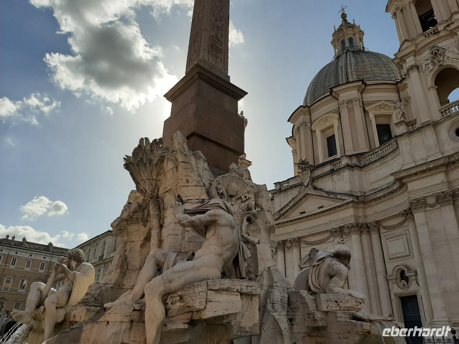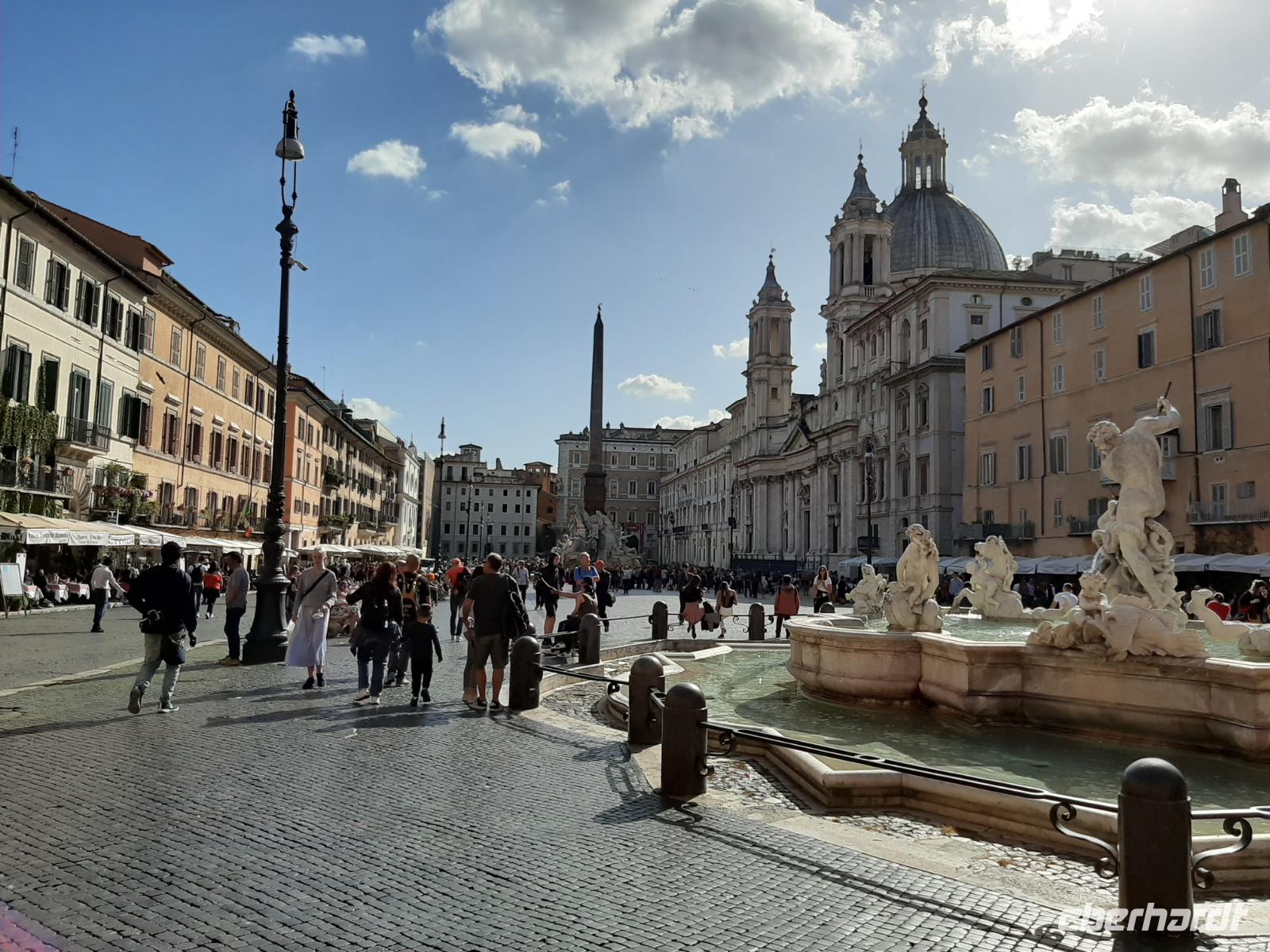 Heute stehen der Besuch der Papstaudienz auf dem Petersplatz, die Besichtigung der Engelsburg sowie ein Sadtspaziergang bis zur Piazza Navona auf dem Plan. Gleich nach dem Frühstück brechen wir auf, denn wir wollen den Anfang möglichst nicht verpassen. Der Anfang ist, wenn der Papst durch die Besucherreihen auf dem Petersplatz fährt und man die Chance hat, ihn aus der Nähe zu sehen zu bekommen. Zu Fuß machen wir uns auf den Weg direkt zum Peterspaltz, um mögliche Unwägbarkeiten im Straßenverkehr galant zu umschiffen. So weit so gut. An den Sicherheitskontrollen jedoch müssen wir so lange anstehen, dass wir, als wir endlich durch die Kontrollen durch sind, genau diesen Anfang nun doch verpasst haben: der Papst sitzt schon unter seinem weißen Baldachin vor dem Petersdom und hat bereits begonnen, die Audienz in verschiedenen Sprachen zu zelebrieren. Bildschirme helfen, die relativ große Entfernung zu ihm zu verkürzen; die Stimme des Papstes ist mithilfe von Lautsprechern deutlich zu hören. Wir beobachten das Treiben der Pilgerer aus verschiedenen Ländern und dass der Papst später auch Gäste persönlich begrüßt auf der Tribüne des Petersplatzes. Nach Beendigung der Audienz und nachdem sich der „Rummel" etwas gelegt hatte, schlendern wir gemeinsam zur Engelsburg, Castel Sant' Angelo, gelegen unweit des Petersplatzes direkt am Tiberufer. Bei der Innenbesichtigung macht uns Sylvia mit der Geschichte der Burg bekannt: von Kaiser Hadrian für sich als selbst als Mausoleum erbaut, verwandelten es die Päpste ab dem 9. Jahrhundert in eine Fluchtburg. In gefährlichen Zeiten flüchteten die Päpste durch den Passeto, einen bis heute bestehenden, den Vatikan mit der Engelsburg verbindenden Fluchtweg, hierher. Auch wurde der trutzige Bau als Kerker genutzt; heute dient die Engelsburg als Museum. Von oben, wo sich auch ein Cafe, in dem wir eine Mittagspause "mit Aussicht" einlegen, befindet, öffnet sich ein prächtiger Blick auf Rom. Die meisten der besonderen Sehenswürdigkeiten lassen sich von hier und natütlich auch von der noch weiter oben befindlichen Aussichtsterasse ausmachen. Wir stehen hier direkt neben der riesengroßen Figur auf der Spitze der Burg, die den Erzengel Michael darstellt. Mit überwältigenden Eindrücken verlassen wir die Burg und kommen zur Engelsbrücke. Sie gilt als die schönste Brücke, die den Tiber überquert, nicht zuletzt aufgrund der zehn Engelsstatuen, die sich auf ihr befinden. Die Brücke diente schon im Mittelalter als kürzeste Verbindung zum Vatikan. Auch heutzutage noch ist sie einer der wichtigsten Zugänge zur Stadt. Das Besondere an ihr sind die zehn Engelsstatuen, die im 17. Jahrhundert von Bernini (1598 - 1680) hinzugefügt wurden, daher rührt auch der Name „Engelsbrücke". Es sind nicht mehr alle Statuen original, zwei der Engel, sind Kopien, ihre Originale stehen in einer Kirche in Rom. Den Eingang der Brücke zieren Statuen der Apostel Petrus und Paulus. Auf der Brücke sind immer viele Menchen unterwegs und Fotomotive gibt es hier genügend. Noch weiter führt uns Sylvia durch die Stadt. Wir gehen durch die Via die Coronari, die wenige hundert Meter entfernt beginnt. Es ist eine schmale Straße, heute Fußgängerzone, die bekannt war für ihre vielen Antiquitätenhändler und Restauratoren, die hier ansässig waren und ihre Geschäfte betrieben hatten. Auch wenn heute nur noch wenige Antiquitätenhändler ihr Geschäft betreiben, vielmehr die Restaurants vor allem um die Gunst der Touristen buhlen, kann man sich das damalige Leben in dieser Straße gut vorstellen. Unser nächstes Ziel ist wiederum gleich in der Nähe: die Piazza Navona. Die ovale Form des Platzes entspricht bis heute der Form der Arena, die vor der Jahrtausendwende hier errichtet wurde. Drei Brunnen befinden sich auf diesem Platz: zwischen Mohren- und Neptunbrunnen befindet sich Berninis Vierströmebrunnen (Fontana die Fiumi) mit den allegorischen Darstellungen von Nil, Ganges, Donau und Rio della Plata. So wie wir flanieren Besucher aus aller Welt über die Piazza, die gute Stube der Stadt. Kostet hier das Bier oder ein Eis auch mehr als anderswo, das Verweilen ist es manchem der Gäste Roms wert. Die Führung durch Sylvia endet nun und es ist wieder Gelegeneheit, Unternehmingen „auf eigene Faust" zu starten. Einige Gäste machen sich auf zum Kolosseum und Forum Romanum, die beide nicht Programmbestandteil dieser Reise sind und fußläufig von der Piazza Navona gut zu erreichen sind. Zu Abend essen einge Gäste zusammen im Stadtteil Trastevere mit seinen urigen Kneipen. Andere fahren ins Hotel zurück und essen in einem Ristorante/Pizzeria unweit des Hotels eine köstliche Pizza aus dem Steinofen oder etwas ganz typisch Römisches: Kutteln.