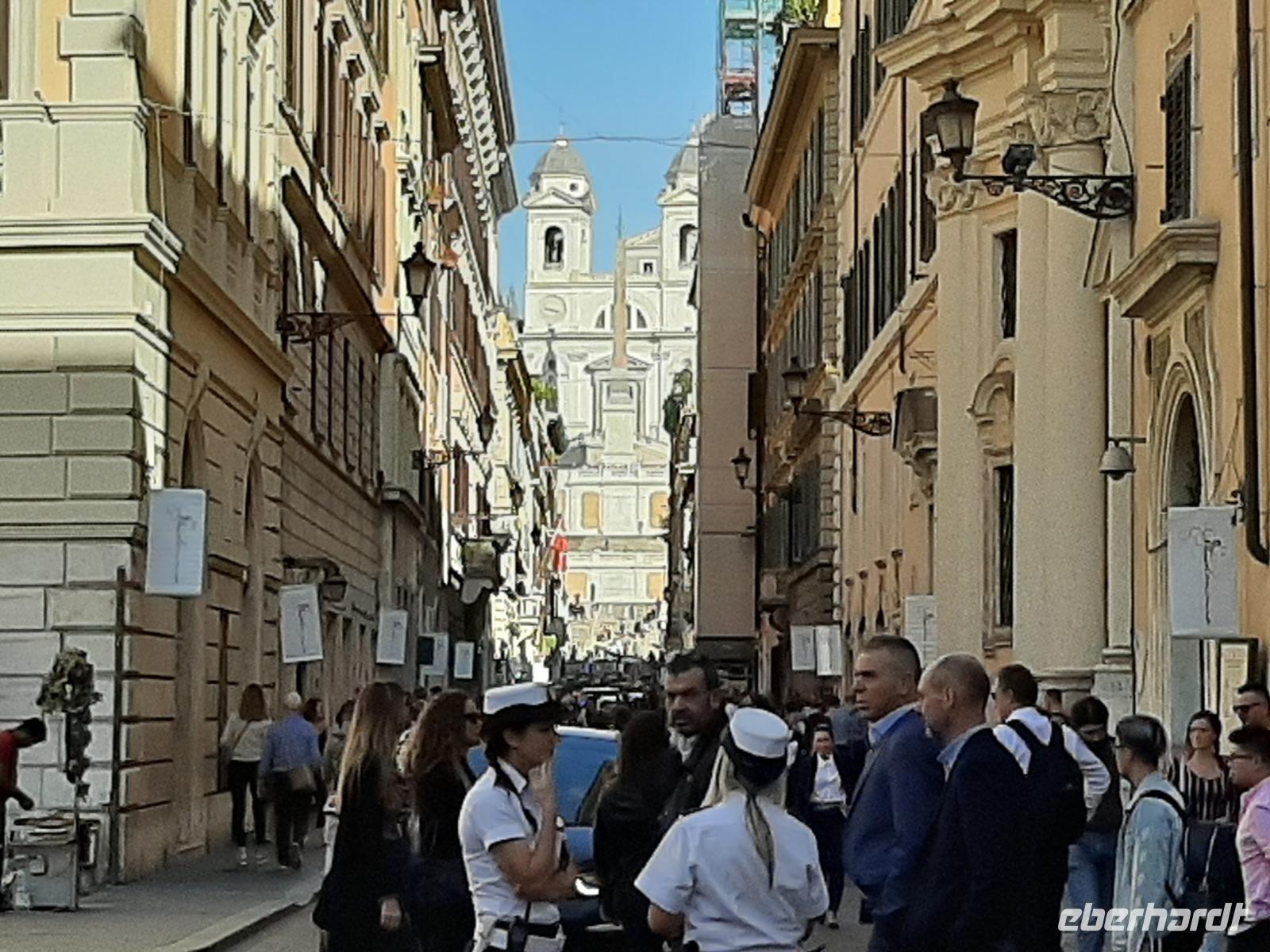 Der Startpunkt für den heutigen Tag ist relativ weit entfernt von unserem Hotel. Deshalb ziehen wir es vor, heute mit öffentlichen Verkehrsmitteln zu fahren. Mit dem Bus fahren wir bis Teatro Marcello. Da wir gut in der Zeit liegen, gönnen wir uns einen Abstecher zum Kapitolshügel. Von dort, hinter dem Rathaus schauen wir direkt auf das Forum Romanum und das dahinter befindliche Kolosseum. Jene Gäste, die es noch nicht aus der Nähe gesehen haben, fassen den Entschluss, das heute am Nachmittag unbedingt noch nachholen zu wollen. Auf der Piazza Venecia steigen wir in einen kleineren Bus um und fahren bis zur Piazza del Popolo. Unweit befindet sich der Eingang zur Villa Borghese befindet. Das italienische Wort "Villa" bedeutet nicht etwa großes Haus, sondern großer Garten. Villa Borghese ist ein großer landschaftlich gepflegter Garten in dem sich zahlreiche Gebäude wie die Galleria Borghese mit ihrem Museum, Tempel und Brunnen befinden. Wir spazieren durch den Park, der von den Römern in ihrer Freizeit gerne genutzt wird, vorbei am Goethedenkmal bis zur Galeria. Wieder treffen wir Sylvia und beginnen die Besichitigung der Villa. Schon im 17. Jahrhundert wurde der Ort berühmt für seine Kunstsammlungen und zählt heute zu den bekanntesten und wertvollsten privaten Kunstsammlungen der Welt. In der Sammlung können Werke von Meistern wie Bronzino Caravaggio, Leonardo da Vinci, Raffael, Rubens, Tizian, Guido Reni und Canova besichtigt werden. Eine von Napoleons nackter Schwester inspirierte Skulptur gehört heute nach vielen Empörungen in damaliger Zeit zu den Höhepunkten des Museums. Nach der Besichtigung sind wir uns einig: diese Ausstellung ist etwas ganz Besonderes. Das Ambiente im Gebäude, mitsamt den herausragenden Gemälden und Skulpturen, einschließlich der sachkundigen Erläuterungen von unserer örtlichen Reiseleiterin haben uns sehr beeindruckt. Ohne Zweifel gehört der Besuch der Villa Borghese dazu, will man Rom, so wie wir, intensiver erleben. Wie setzen unser Programm fort, indem wir mit dem Bus fahren, ein Stück zu Fuß bis zum Trevi-Brunnen gehen und hier auch unsere Mittagspause verbringen. Anschließend führt uns das Programm zur Spanischen Treppe und zum Pantheon. Das Pantheon ist eines der charakteristischsten römischen Gebäude im Zentrum Roms und gleichzeitig eines der wenigen vollständig erhaltenen des alten Rom. Das Ende der heutigen Besichtigungstour ist gleichzeitig der Schlusspunkt des Besichtigungsprogramms mit Sylvia während unserer Reise. Wir bedanken uns bei ihr und verabschieden uns herzlich. Es verbleiben den Gästen noch einige Stunden Freizeit an diesem Nachmittag, in denen sie ihren ganz persönlichen Interessen nachgehen können, bevor Abschied zu nehmen ist von Rom.