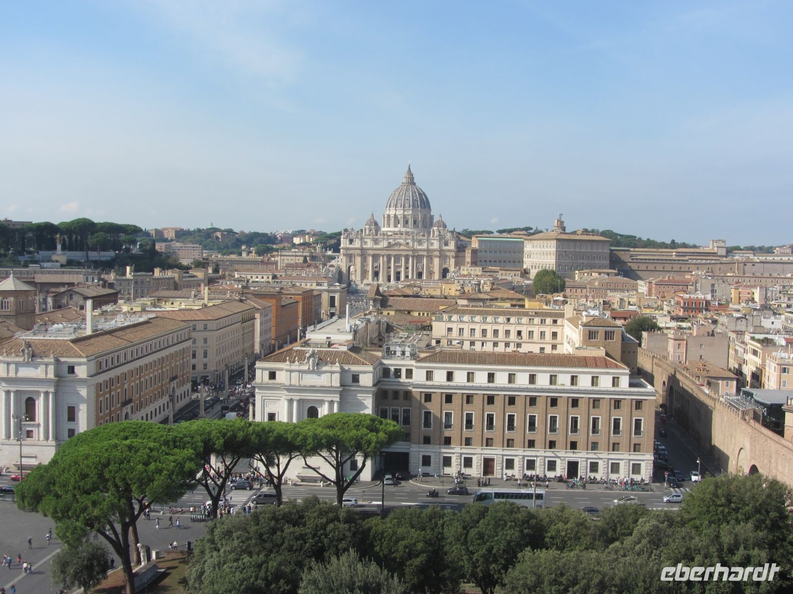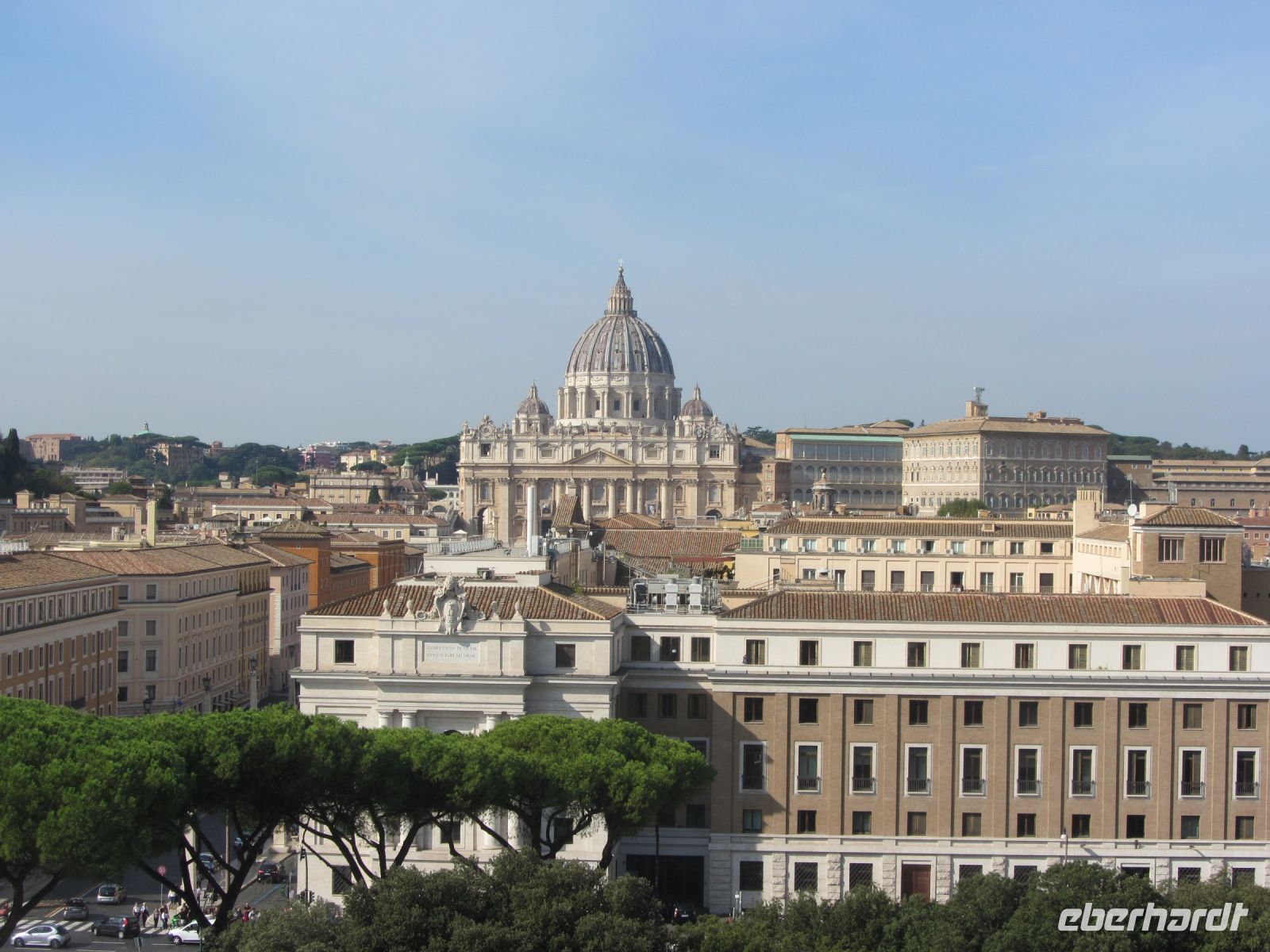 Ausgerechnet beim Besuch der vatikanischen Gärten regnet es und das kräftig. Wir vertrauen darauf, dass wir auch wieder trocken werden und lassen uns durch die großen Gärten führen, immer begleitet vom Blick auf die Kuppel des Petersdoms, die in ihrer Größe kaum zu fassen ist. Ein Renaissancegarten, ein Garten mit Pflanzen aus der Bibel und teilweise uralte Bäume mit ausladenden Kronen verschaffen uns einen guten Eindruck von der grünen Oase im Kirchenstaat.
