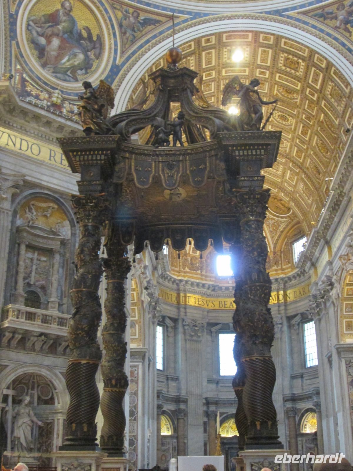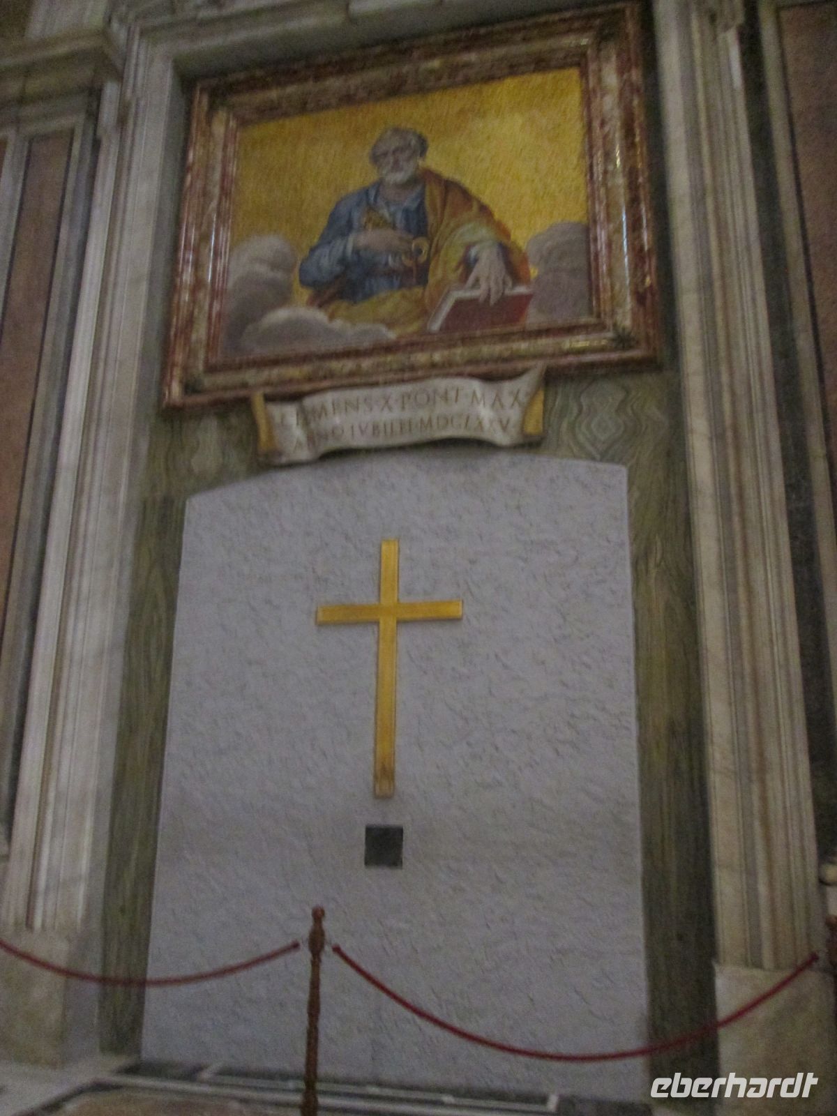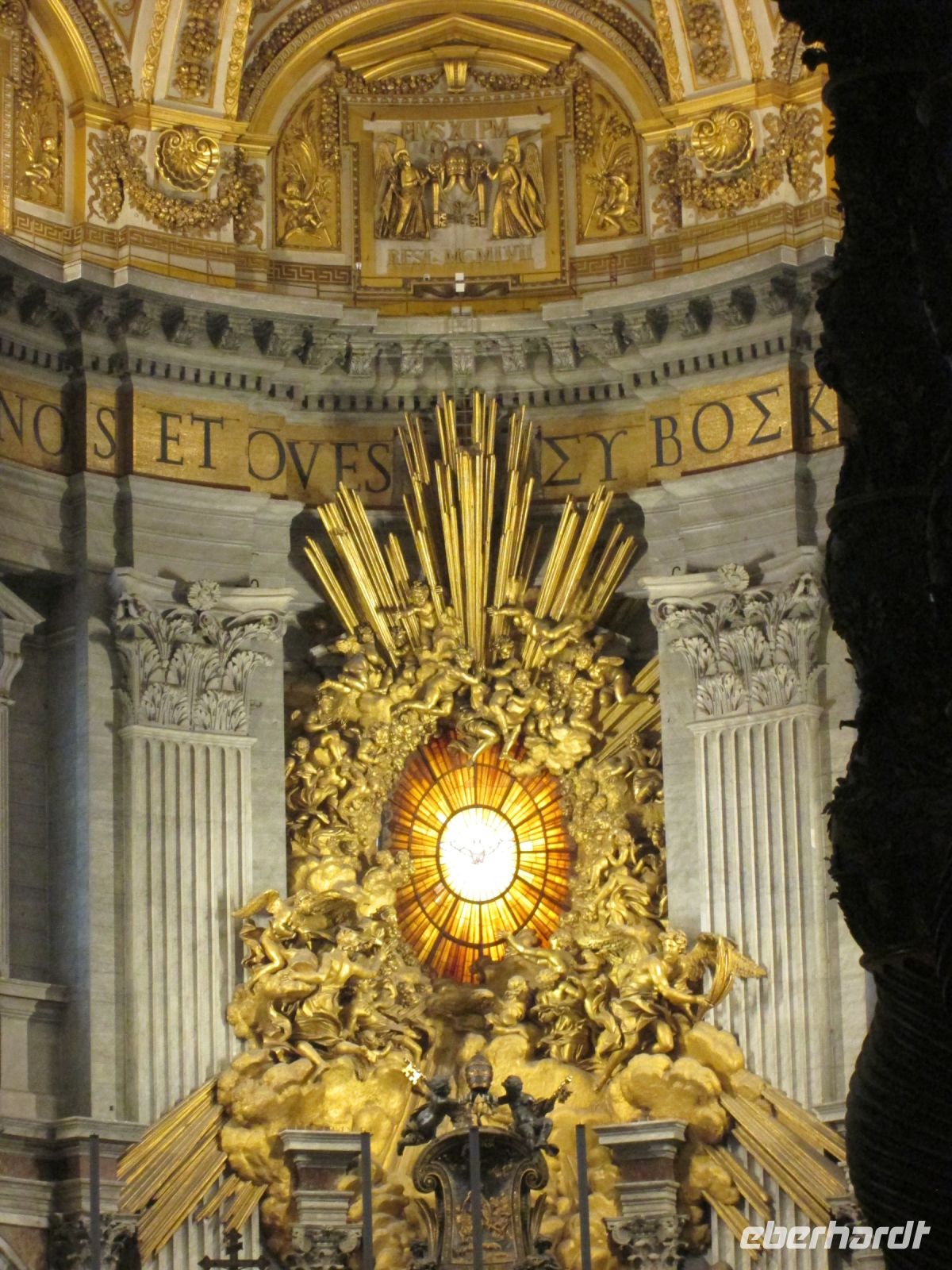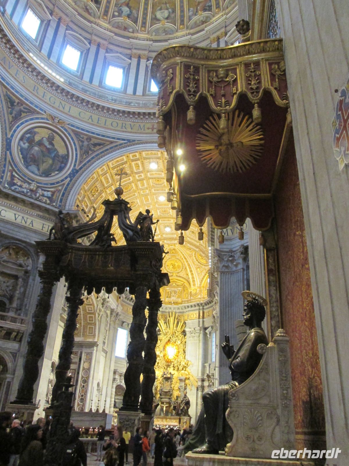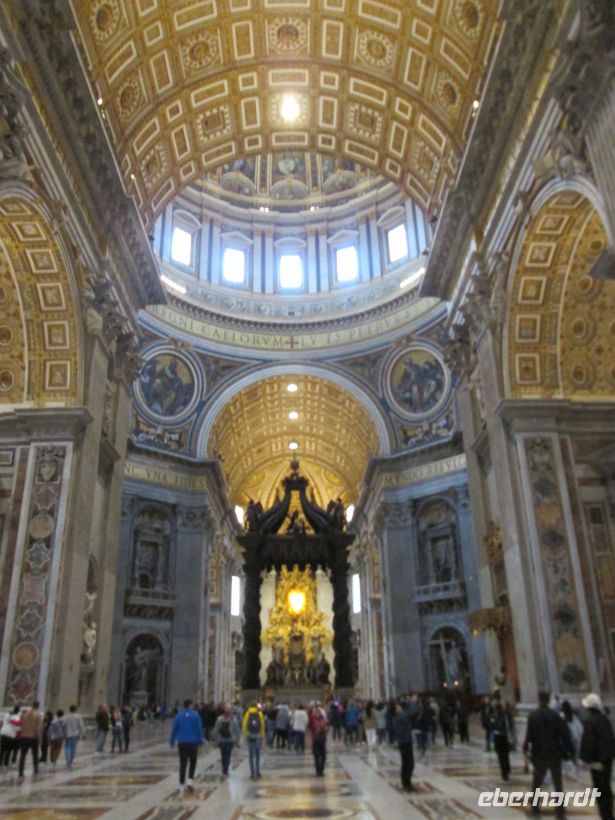Mit einer Länge von 186,36 Metern übertrifft der Petersdom z.B. den Kölner Dom um mehr als 51 Meter. Diese Längenangaben findet man im marmornen Fußboden im Hauptschiff. Das Innere ist so großartig ausgestaltet, dass eine kurze Beschreibung durchaus schwer fällt. Man würde den vielen anderen Mosaiken, Statuen, Gräbern, etc. nicht gerecht werden, wenn man nur einige von ihnen hier erwähnt.