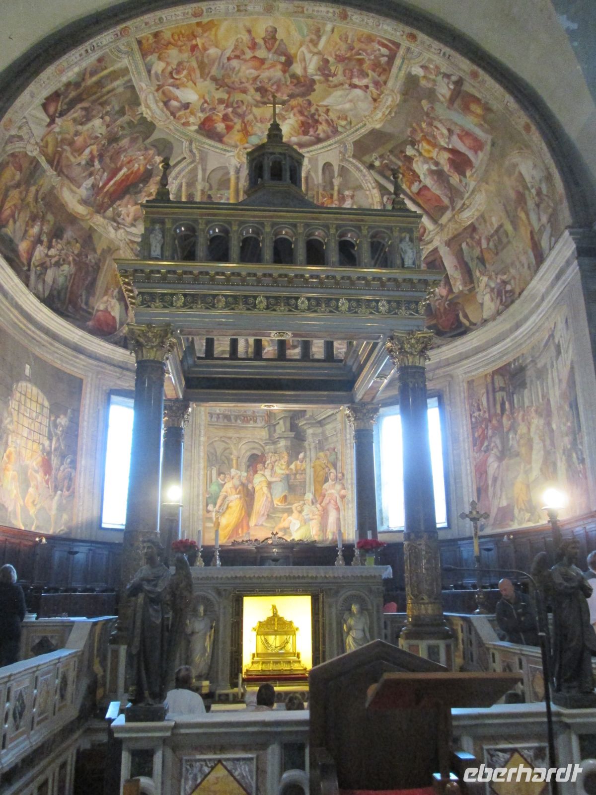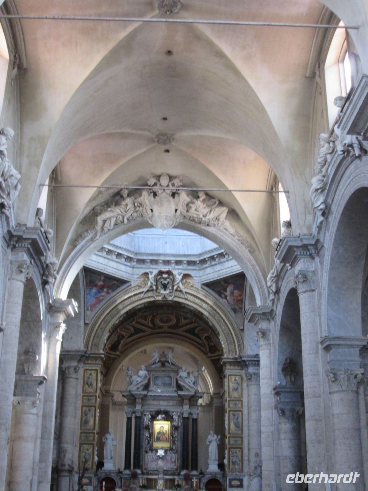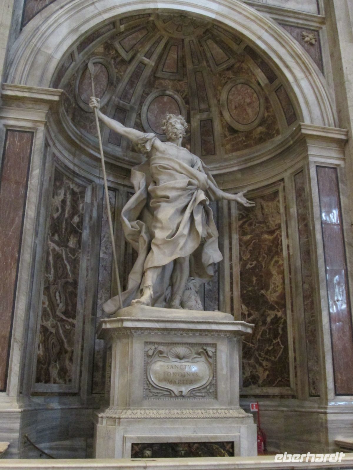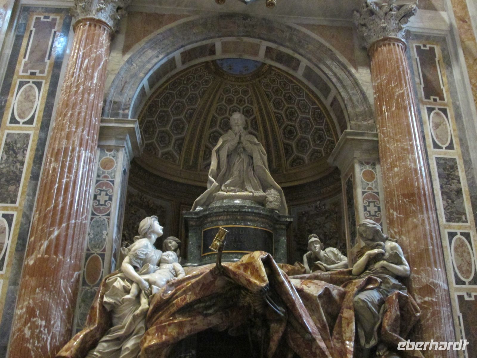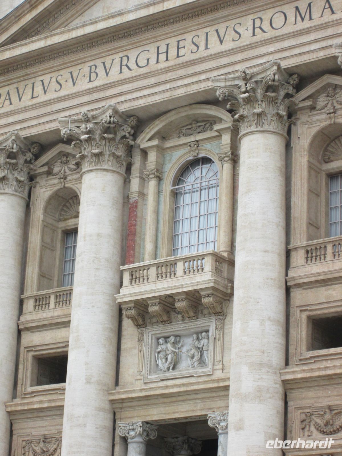 Mit einer Länge von 186,36 Metern übertrifft der Petersdom z.B. den Kölner Dom um mehr als 51 Meter. Diese Längenangaben findet man im marmornen Fußboden im Hauptschiff. Das Innere ist so großartig ausgestaltet, dass eine kurze Beschreibung durchaus schwer fällt. Man würde den vielen anderen Mosaiken, Statuen, Gräbern, etc. nicht gerecht werden, wenn man nur einige von ihnen hier erwähnt.