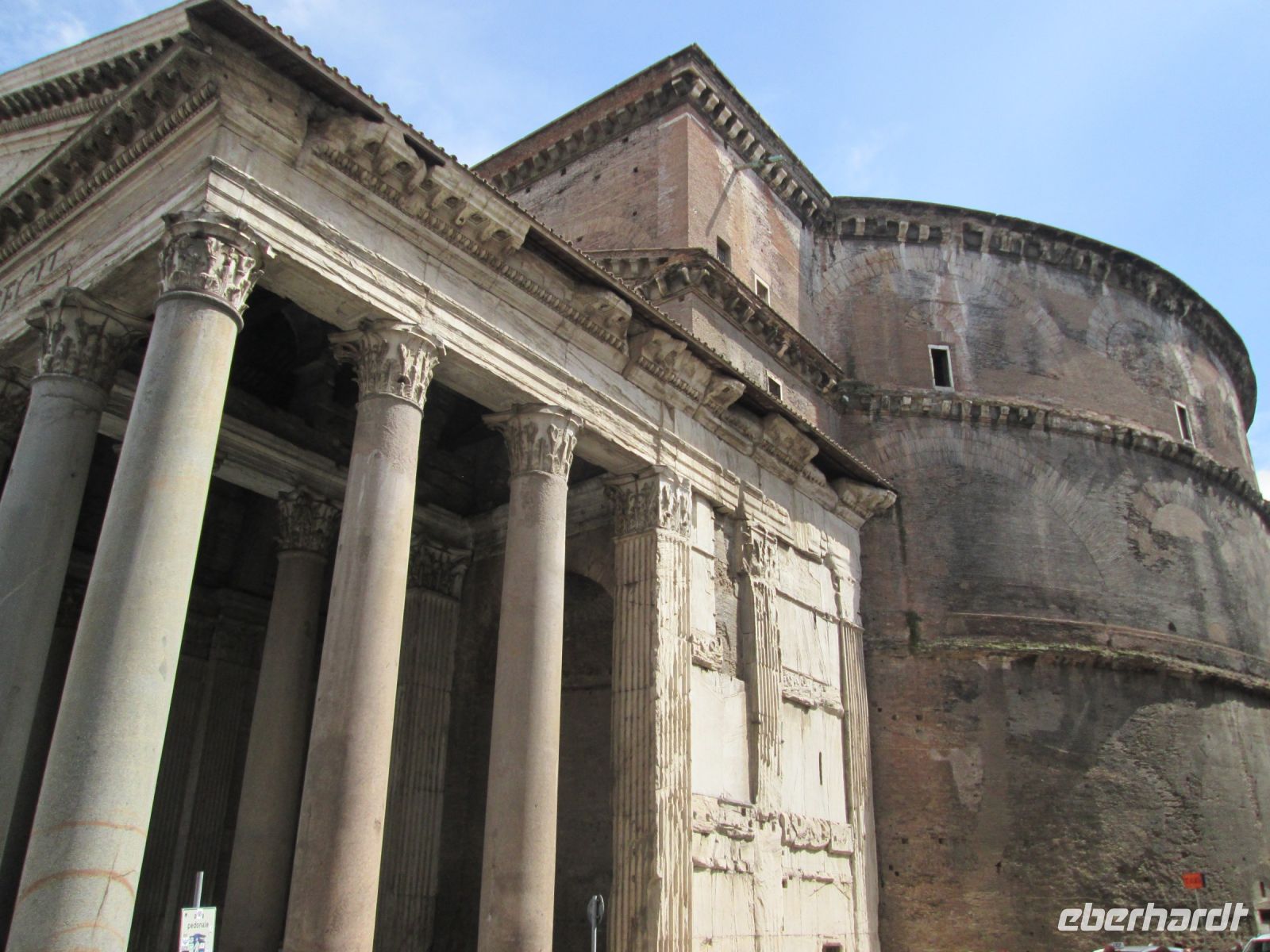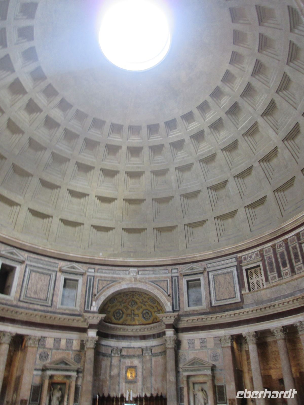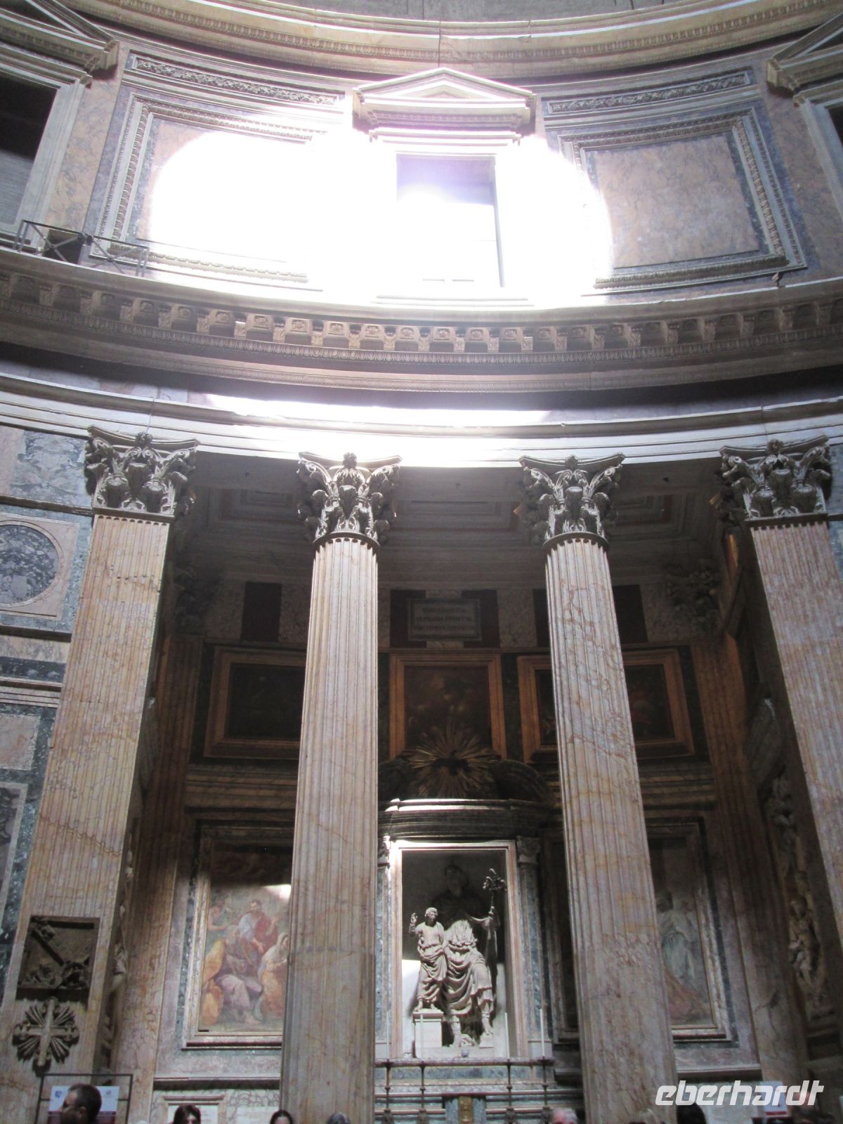 Mit dem Hadrianeum und dem gewaltigen Pantheon befanden wir uns in die antike Zeit zurück versetzt. Wieder einmal wurde bestaunt, was man vor etwa 2100 Jahren erschaffen hatte. Und was heute noch existiert! Das Pantheon wurde als "Tempel aller Gottheiten" im Jahre 27 vor Christus erbaut, oft verändert, und heute präsentiert es sich uns als Kirche mit Gräbern bekannter Persönlichkeiten, z.B. die der beiden italienischen Könige Vittorio Emanuele II. und Umberto I. sowie des Malers Raffaello Sanzio, besser bekannt als Raffael. Ihn kennt wohl jedermann aufgrund eines seiner Meisterwerke, der "Sixtinischen Madonna", heute in Dresden. Diesem Maler und Architekten sollten wir am Folgetag in den großartigen Vatikanischen Museen, wo er auch z.B. die Stanzen, die Gemächer für Papst Julis II. ausgeschmückt hat, wieder begegnen. Das sicher Prachtvollste am Pantheon ist aber die Kuppel mit ihrer mittigen Öffnung und ihrem Durchmesser von insgesamt 43 Metern. Diese Kuppel war Vorbild z.B. für Filippo Brunelleschi, den Erbauer der Kuppel der Kathedrale Santa Maria del Fiore in Florenz.