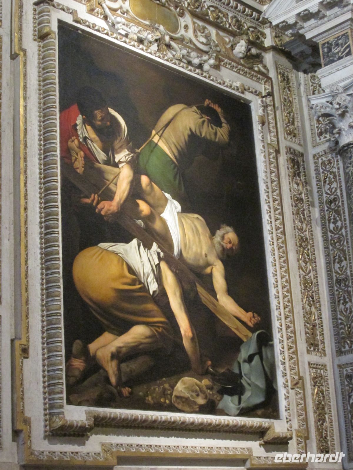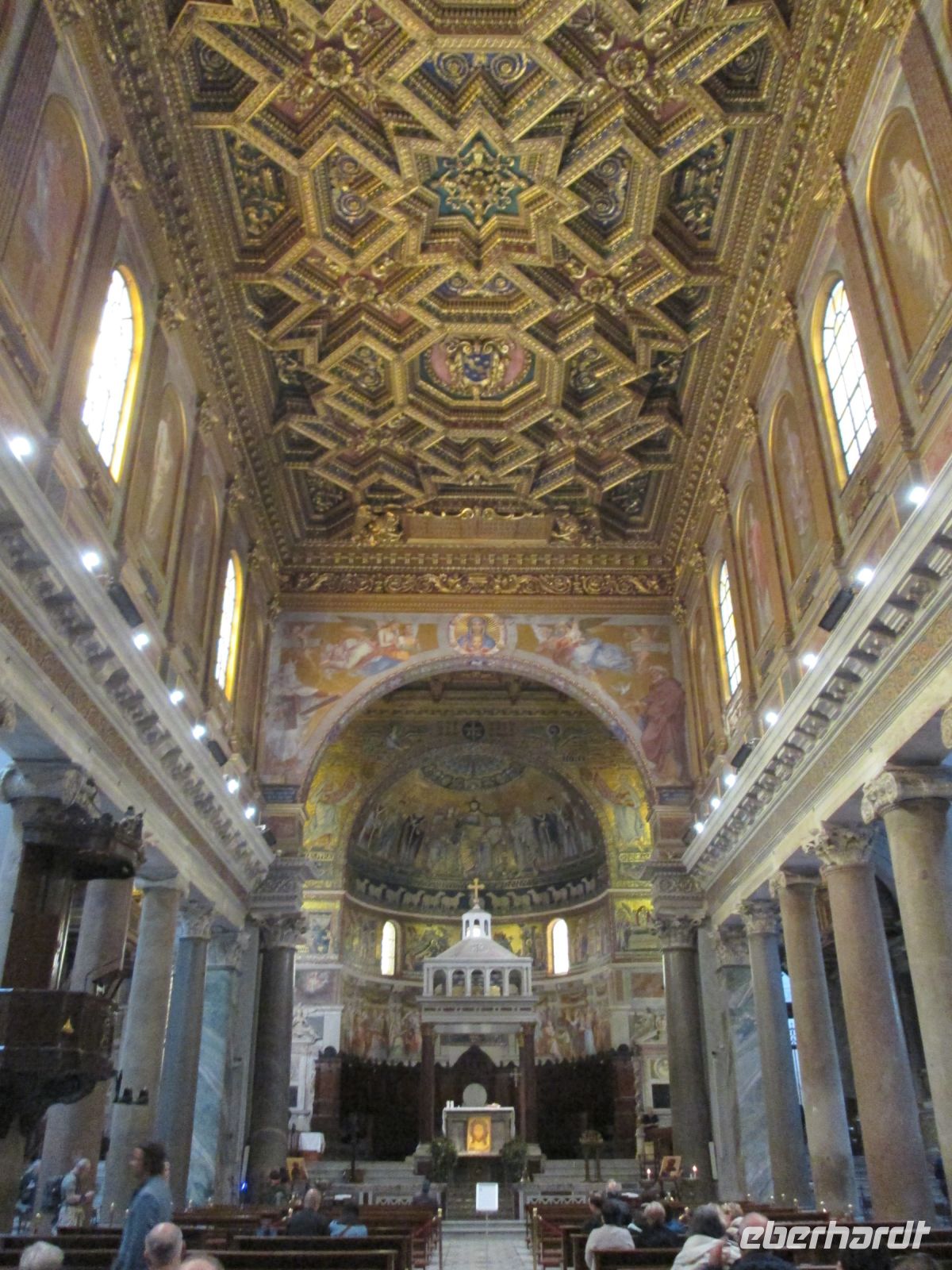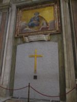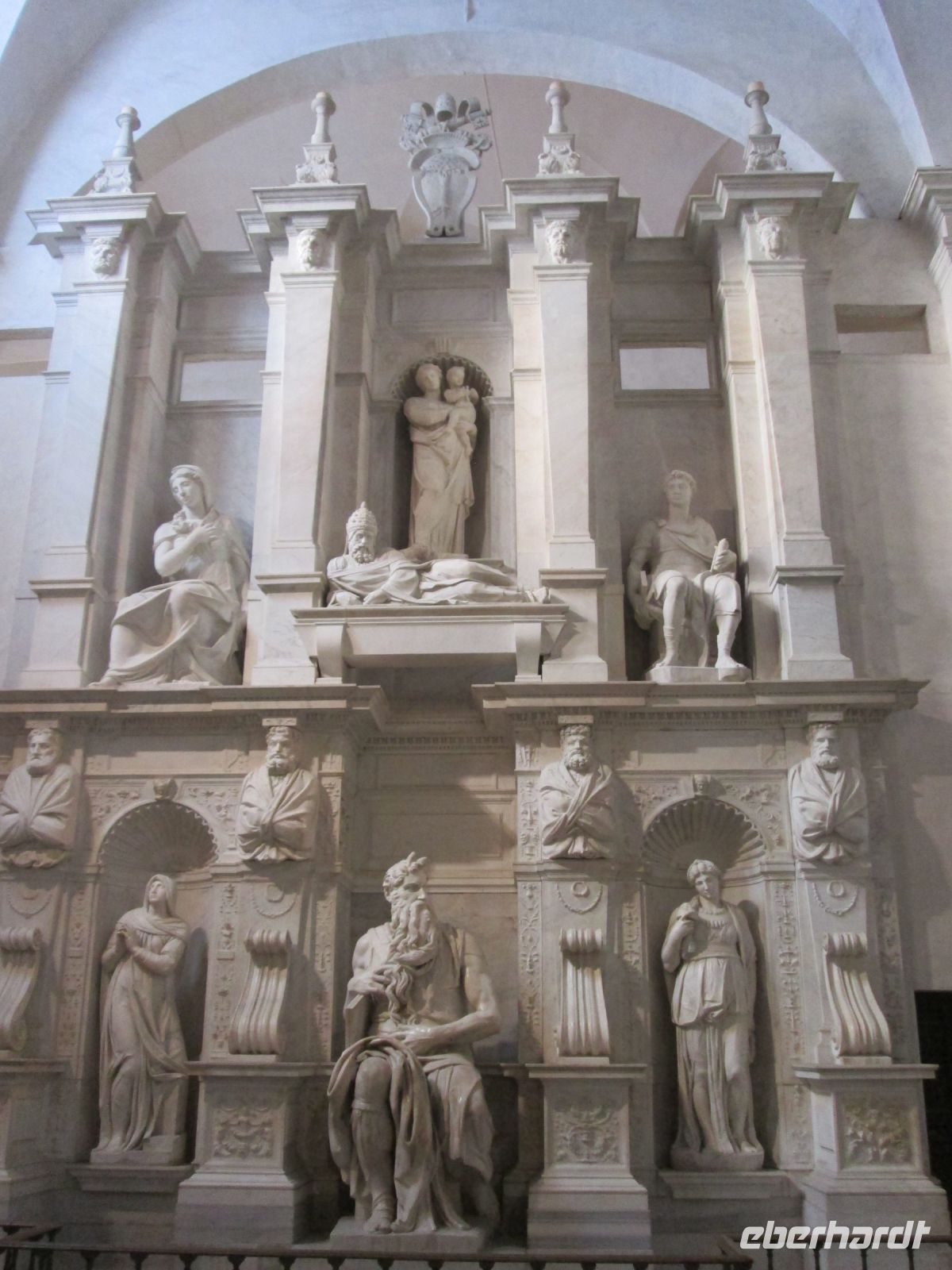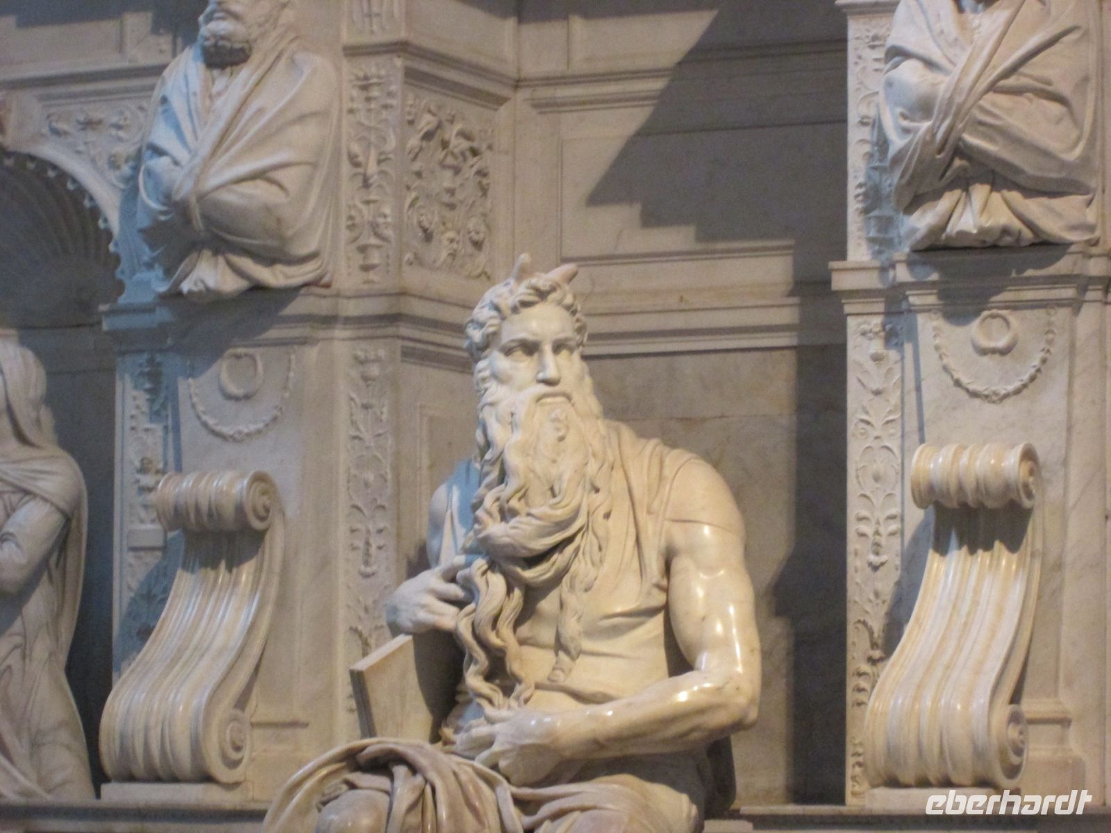 Unsere Besichtigung begannen wir mit einer dem Hotel nahegelegenen Kirche: San Pietro in Vincoli. Vincoli bedeuten Ketten. Genau diese, mit denen Petrus gefesselt war, ließ Kaiserin Eudoxia im 5. Jahrhundert an die Stelle bringen und errichtete dieser Reliquie zu Ehren die Kirche. Es gab mehrere Umbauten, auf die z.B. im Inneren auch Holzbalken hinweisen, bis schließlich das Gotteshaus das heutige Aussehen im 16. Jahrhundert erhielt. Ein weiteres Meisterwerk von Michelangelo ist das Grabmal Julius' II. Michelangelo schuf aber nur den unteren Teil mit Moses in der Mitte . Er wurde nach Sankt Peter gerufen und konnte das Grabmal nie vollenden, was für ihn eine "Tragödie" war.