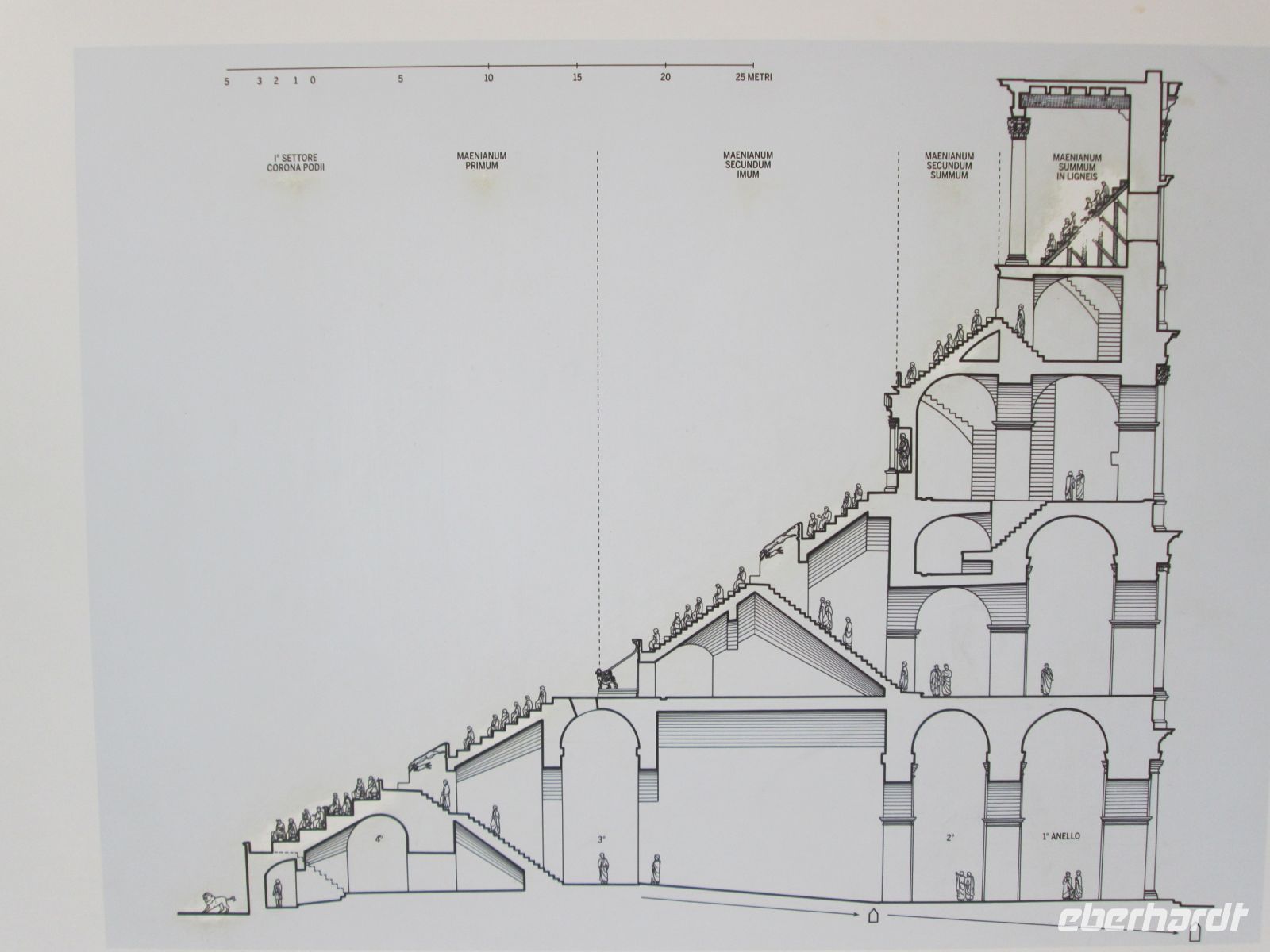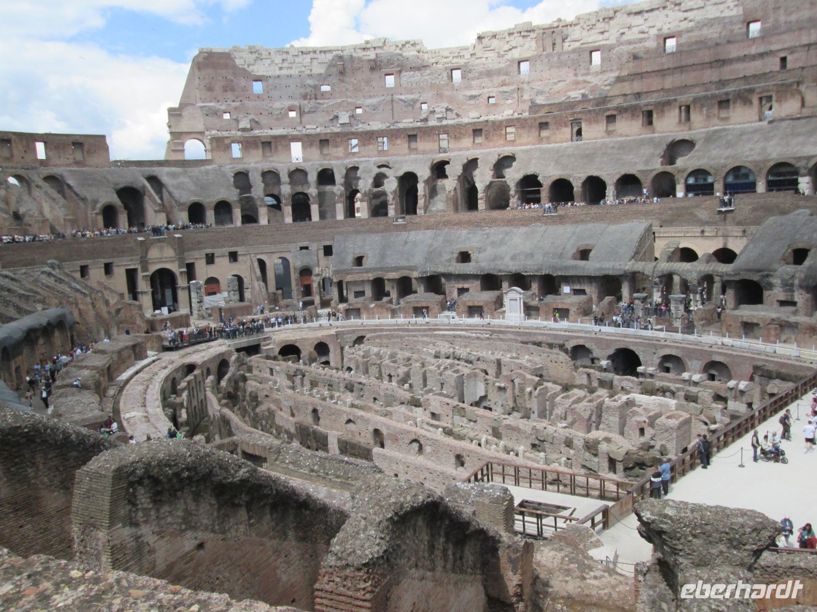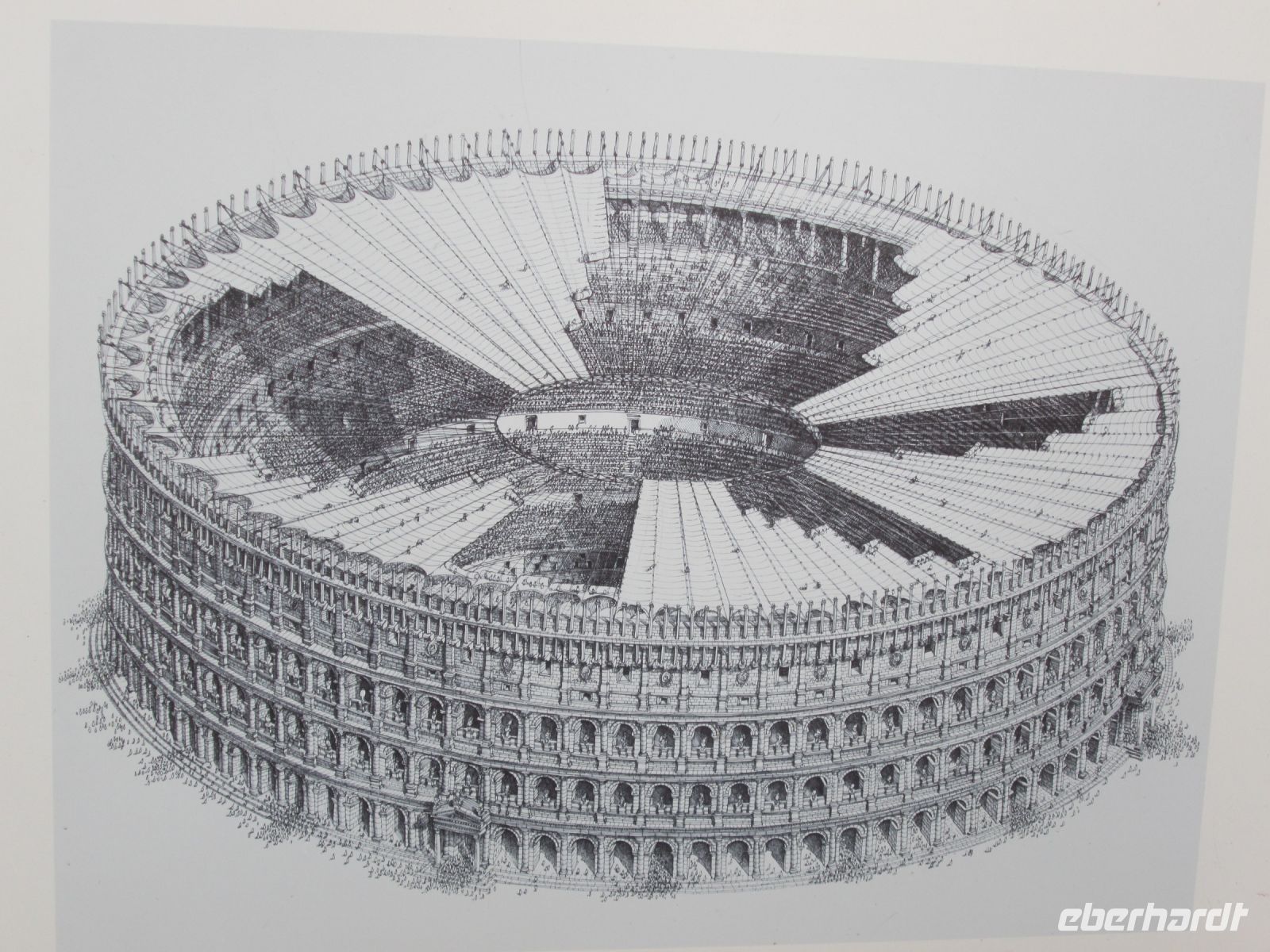 Das flavische Amphitheater, besser bekannt als Kolosseum, wurde nach kurzer Bauzeit im Jahre 80 eröffnet. Panem et Circenses, mit Brot und Spielen sollte fortan in diesem Bauwerk das Volk von Rom unterhalten werden. Bis zu ca. 60000 Zuschauer, die Schätzungen gehen weit auseinander, konnten Tierhetzen und Gladiatorenkämpfen, vielleicht auch Seeschlachten, beiwohnen.