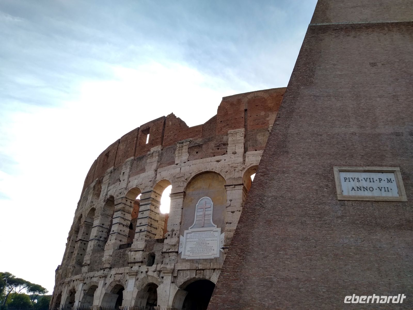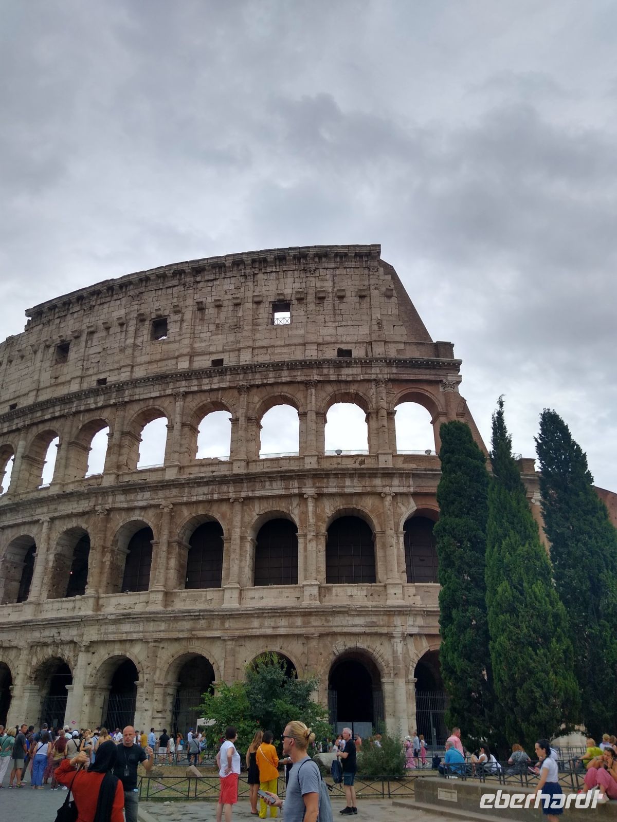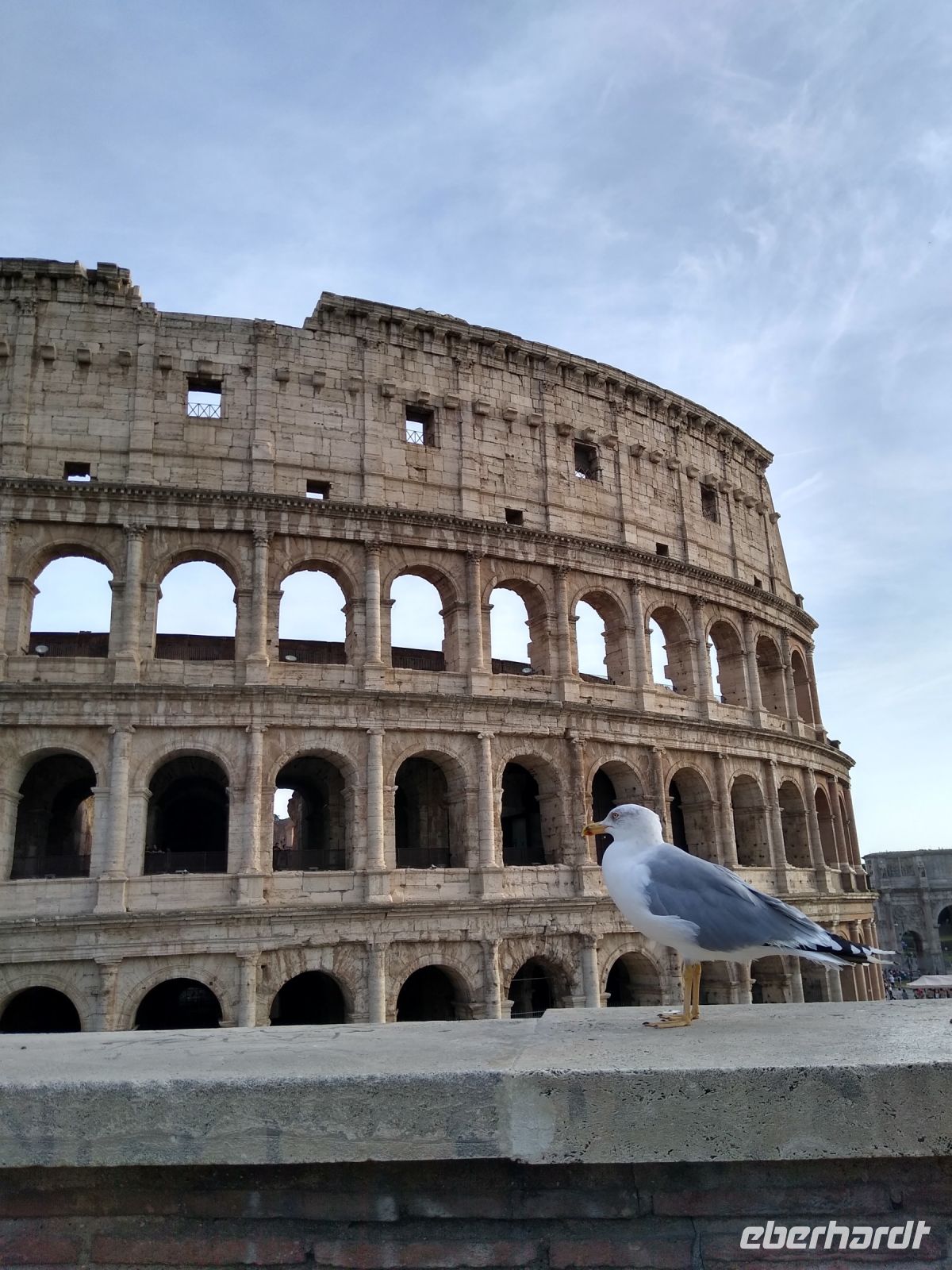Draußen war es noch dunkel als ich mich mit einigen Eberhardt Gästen 6 Uhr früh am Flughafen Dresden traf. Nach einem schnellen Check-in und einer noch schnelleren Sicherheitskontrolle führten wir die ersten Gespräche und lernten uns kennen. Mit einem etwas verspäteten Flug ging es dann nach Frankfurt. Konnten wir beim Abflug in Dresden noch Bilder mit blauen Himmel machen war es bei der Landung in Frankfurt schon etwas bewölkter. In Frankfurt trafen wir auf vier weitere Gäste die bereits aus Leipzig und Stuttgart angereist waren. Mit 10 Gästen ging es dann weiter nach Rom. Nach circa 100 Minuten landeten wir am Flughafen Leonardo da Vinci in der kleinen Stadt Fiumicino, 30 Kilometer von Rom entfernt. Nach langem Warten und Bangen auf unsere Koffer fuhren wir mit Vans in die Hauptstadt Italiens, vorbei an den ersten Sehenswürdigkeiten wie Circus Maximus und der Basilika Santa Maria Maggiore. Im unserem Hotel Monti Palace angekommen konnten wir direkt unsere Zimmer beziehen und eine kleine Pause zur Erholung einlegen. Eine Stunde später trafen wir uns wieder und machten uns auf den Weg zum Kolosseum.