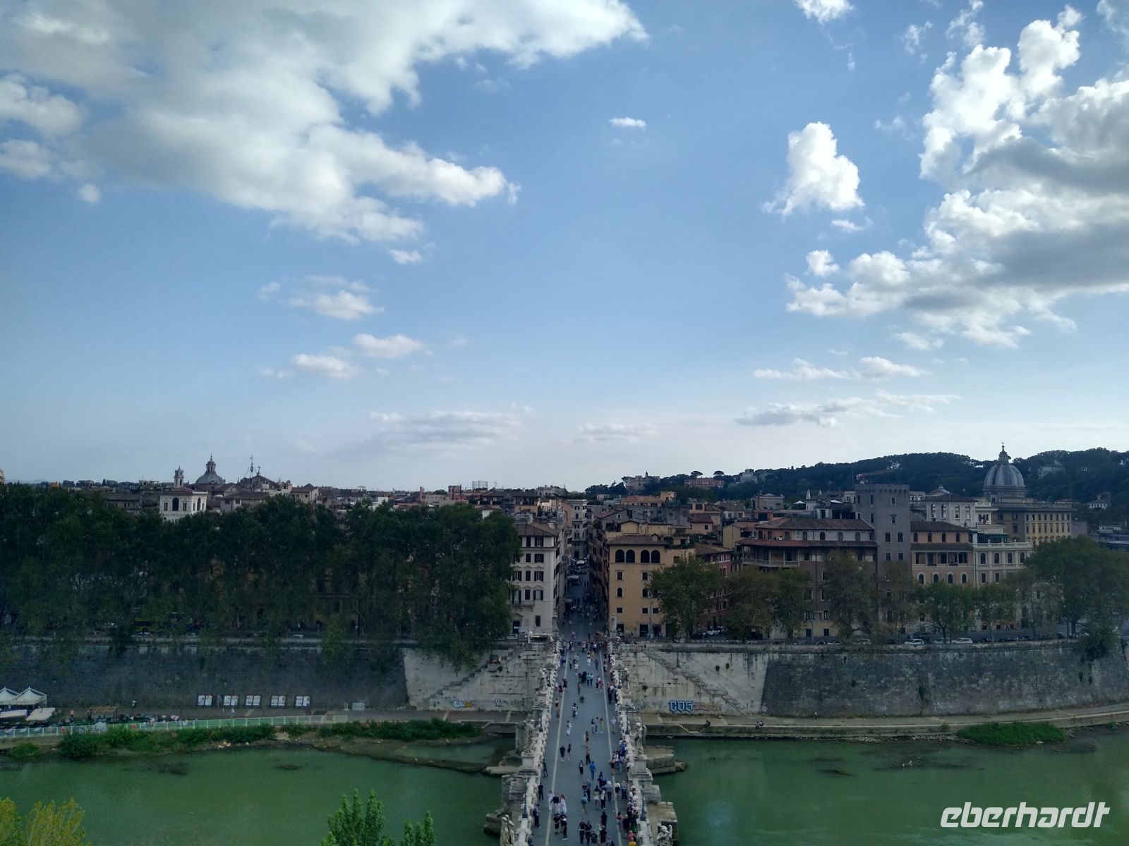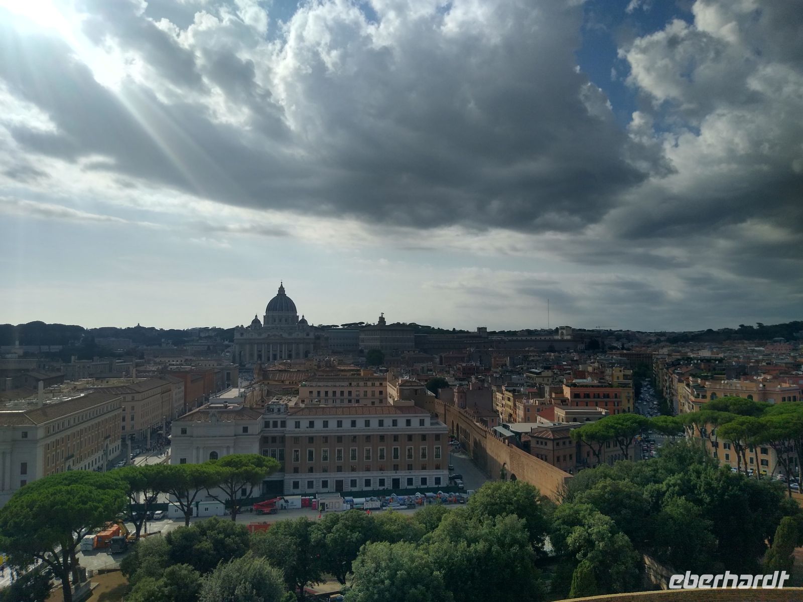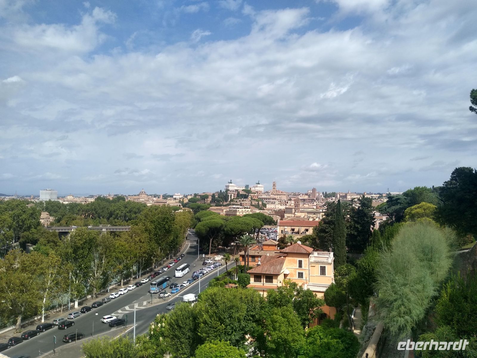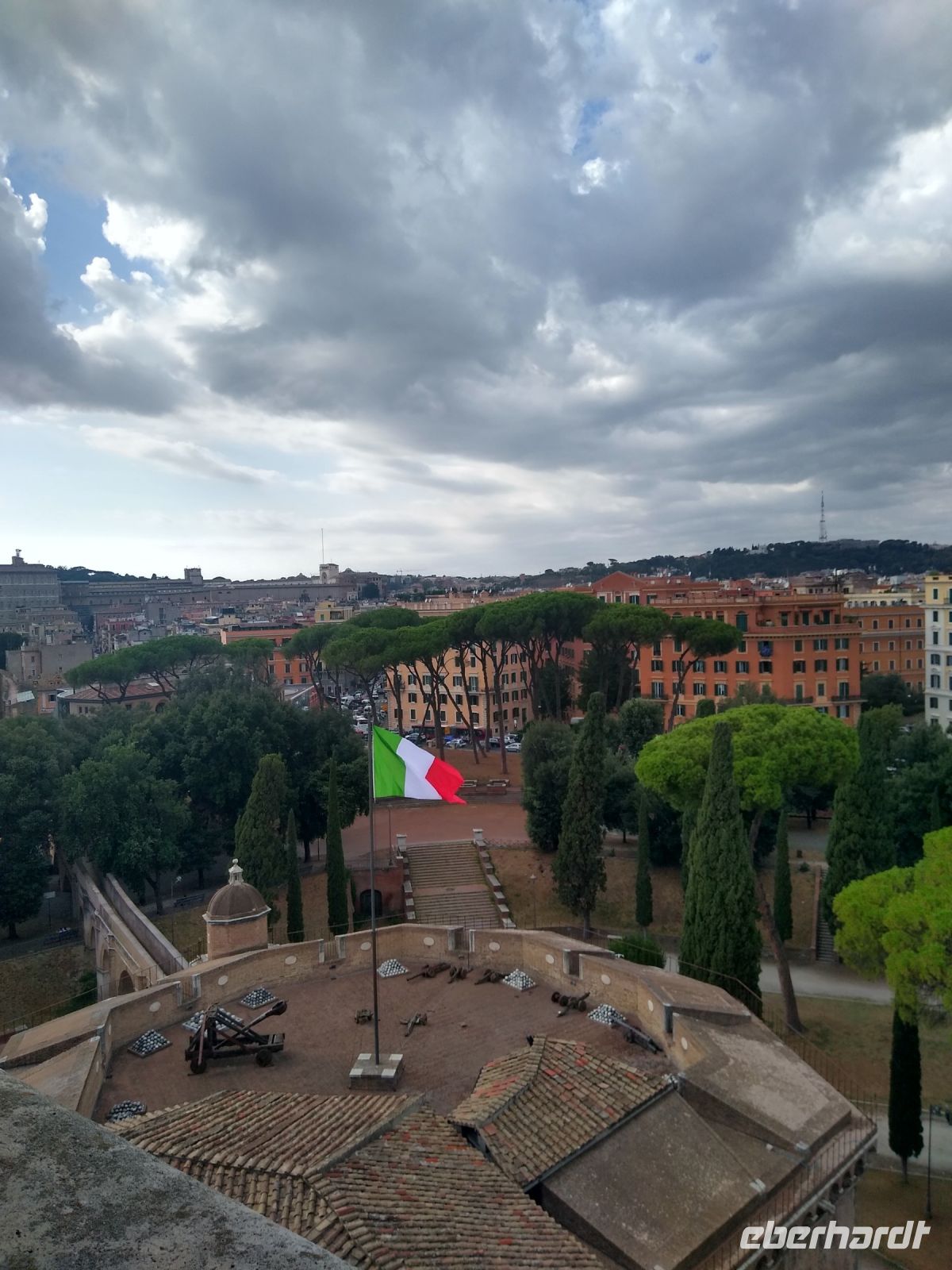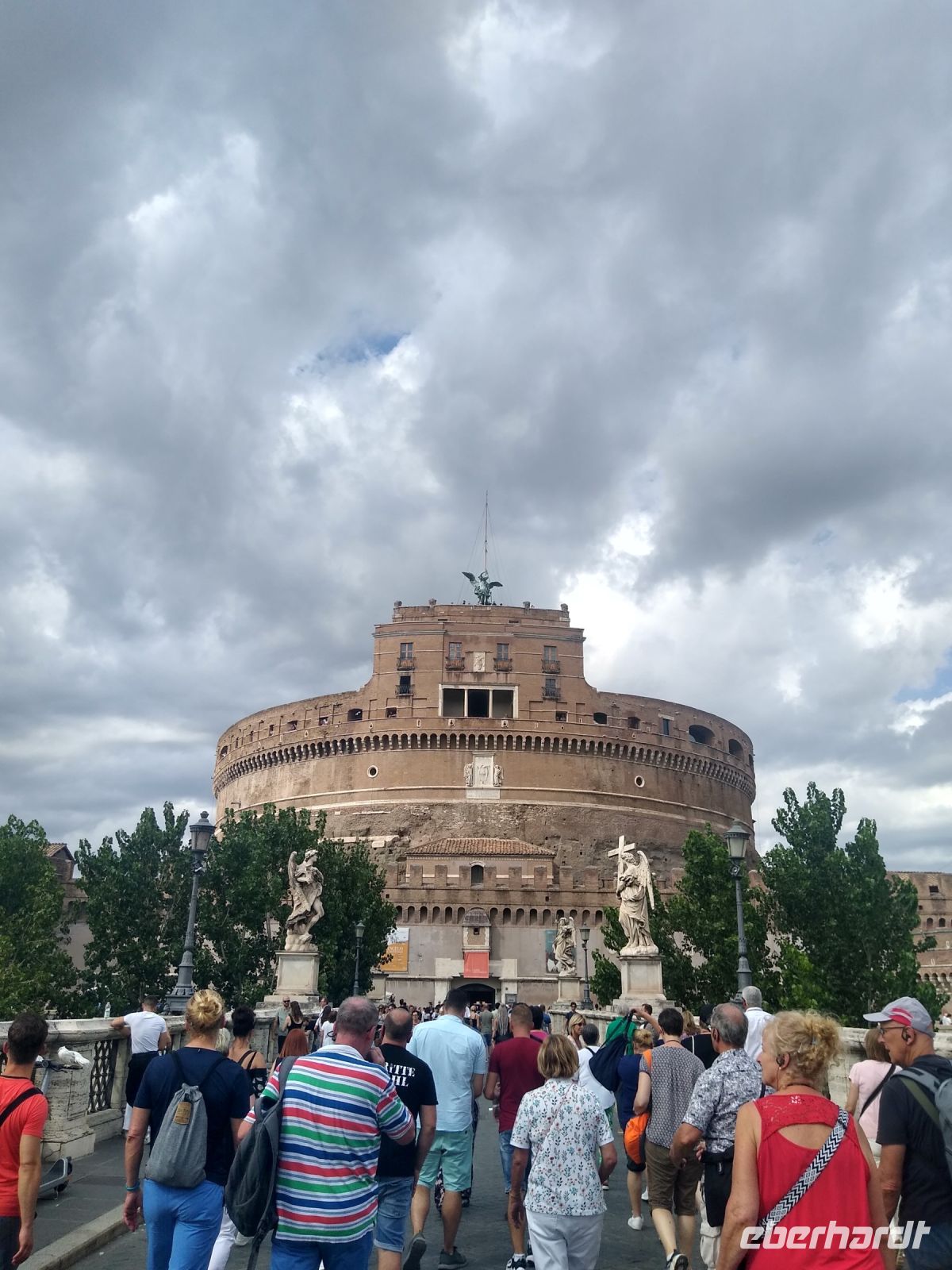 Unsere Stadtführung begannen wir mit der nahegelegenen Kirche Santa Maria Maggiore, die wichtigste Marienkirche von Rom. Innen findet man 1106 Jahre alte Mosaike an der Wand. Diese erzählen die Wanderung des auserwählten Volkes in das gelobte Land. Santa Maria Maggiore war die erste Kirche dessen Bau der Papst selbst in Auftrag gab, dies zeigte damals das der Papst nicht nur religiöse Funktionen übernahm, sondern auch für die Politik verantwortlich war. Das Vorbild der Marienkirche war die Basilika in Assisi und ist heute mit dem Kölner Dom eine der wenigen Kirchen wo der Papst, an einem gesonderten Altar, einen Gottesdienst abhalten kann. Schaut man nach oben sieht man die einzige Decke in Rom die tatsächlich vergoldet ist. An einer unscheinbaren Stelle fanden wir eine Blume auf dem Marmorboden stehen, dies ist die Grabstätte von Gian Lorenzo Bernini, einer der bedeutendsten Steinhauer Italiens. Als man ihn fragte wie er sich seine Grabstätte vorstellte sagte er: „Wer bitte schön sollte mir ein würdiges Grab bauen? Die größten und schönsten Gräber habe ich selber geschaffen.“. Nach der Kirche ging es für uns zu Fuß vorbei am Haus von Gian Lorenzo Bernini und mit der Metro weiter zum Circus Maximus. Mit einer Länge von 600 Metern war es in der Antike der größte und erste Circus Roms. Früher haben sich circa 25000 Menschen an Wagenrennen erfreut und im Mittelalter fanden sogar Hexenverbrennung statt. Heute finden hier noch Konzerte und Veranstaltungen statt, auch die Rolling Stones sind schon im Circus Maximus aufgetreten. Weiter ging es für uns auf den Aventin-Hügel, einer der 7 Hügel Roms, zur Basilika di Santa Sabina und dem dazugehörigen Pomeranzengarten von dem man einen wunderschönen Blick auf den Petersdom hat. Mit dem Bus, denn nach 5 aufregenden Tagen bei hohen Temperaturen waren wir etwas laufmüde, ging es über den Tiber zu dem hippen Viertel Trastevere wo wir eine Mittagspause einlegten. Auf unseren weiteren Weg kamen wir an der mehrfach ausgezeichneten Eisdiele Günthervorbei und EBERHARDT Travel gab allen zwei Geschmäcker, den in Italien sagt man nicht Kugeln da man das Eis spachtelt, aus. Mit dieser leckeren Erfrischung ging es dann wieder mit dem Bus in Richtung Innenstadt. Wir spazierten über die Engelsbrücke auf die Engelsburg zu, das ehemalige Mausoleum des Kaisers Hadrian. Später wurde es eine militärische Festung und galt als uneinnehmbar. Heute beherbergt das Castel Sant Angelo Kunstwerke, Fresken, und Skulpturen aus verschiedenen Epochen der römischen Geschichte. Auf der Terrasse genießen wir noch einmal den letzten Blick auf die Stadt am Tiber. Unsere Gästeführerin Agnieszka verabschiedet sich und auch für uns sind die letzten Stunden in der Ewigen Stadt angebrochen. Einige der Eberhardt Gäste gehen nochmal individuell durch die Stadt und mit den anderen begebe ich mich per Bus zum Hotel. Die letzten Souvenirs und italienische Spezialitäten wurden gekauft und am Abend genossen einige noch unsere tolle Dachterrasse im Hotel und sprachen bei einem Aperol Spritz über die Erlebnisse der letzten Tage.