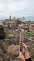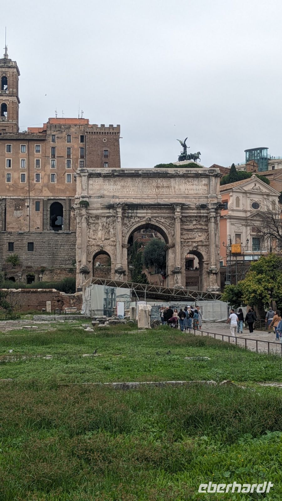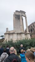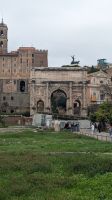 Der folgende Tag stand ganz im Zeichen der ´alten Römer´. Dazu holte uns unsere Stadtführerin Sylvia im Hotel ab. Wir besichtigten die größte und wichtigste antike Ausgrabungsstätte das Forum Romanum. Es liegt nur 10 Gehminuten vom Hotel entfernt. Es war das politische, wirtschaftliche und religiöse Zentrum des antiken Rom. Es liegt in einer Senke zwischen drei Hügeln, wovon einer der Palatin ist. Im Forum Romanum sind die Überreste von Bauten aus mehreren Jahrhunderten der römischen Republik bzw. des römischen Kaiserreichs zu sehen, so dass der Besucher einiges an Vorstellungsvermögen benötigten. Hier können nur wenige Schritte von Ruine zu Ruine mehrere Jahrhunderte der Geschichte bedeuten. Wir besichtigten zum Beispiel eine Straße auf der die Triumpfzüge der siegreichen Feldherren und Soldaten zelebriert wurden. Dazu gehören auch mehrere Triumpfbögen, auf denen die Kaiser Details ihrer Feldzüge verherrlichten.