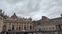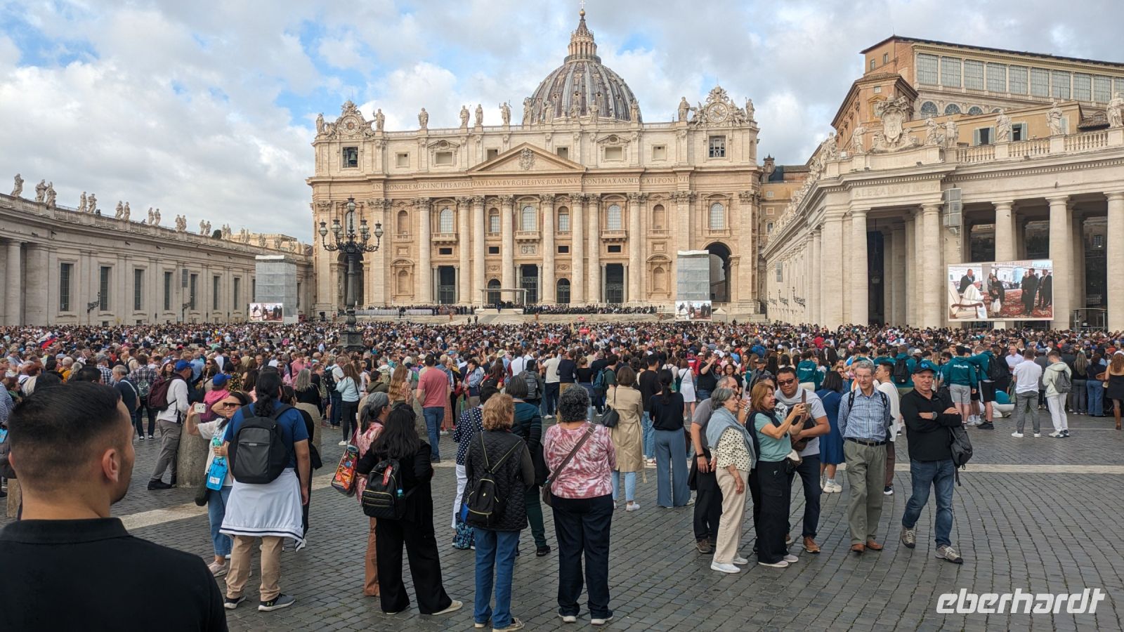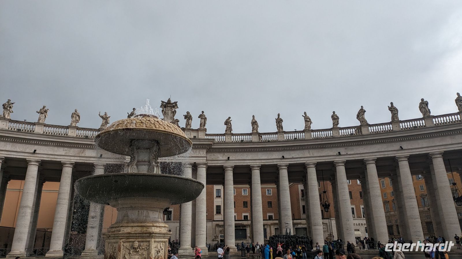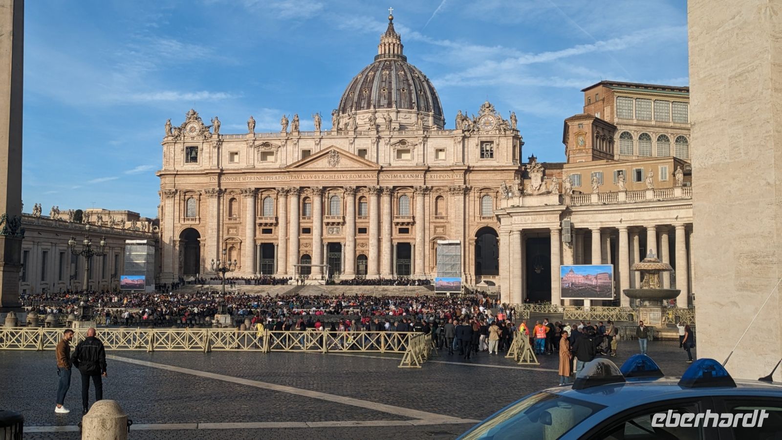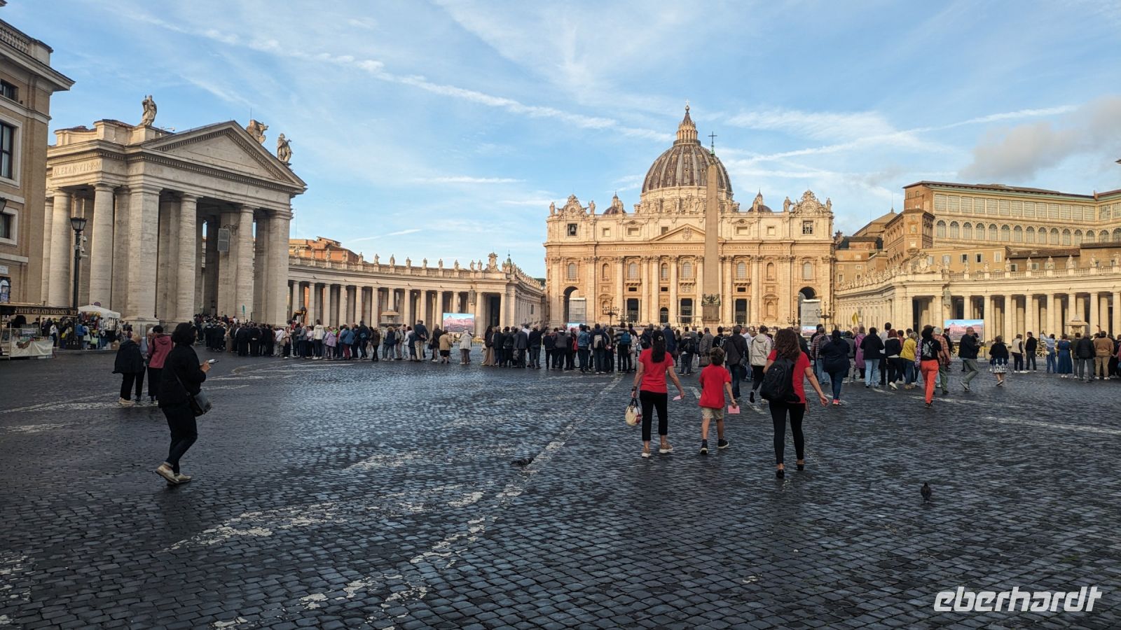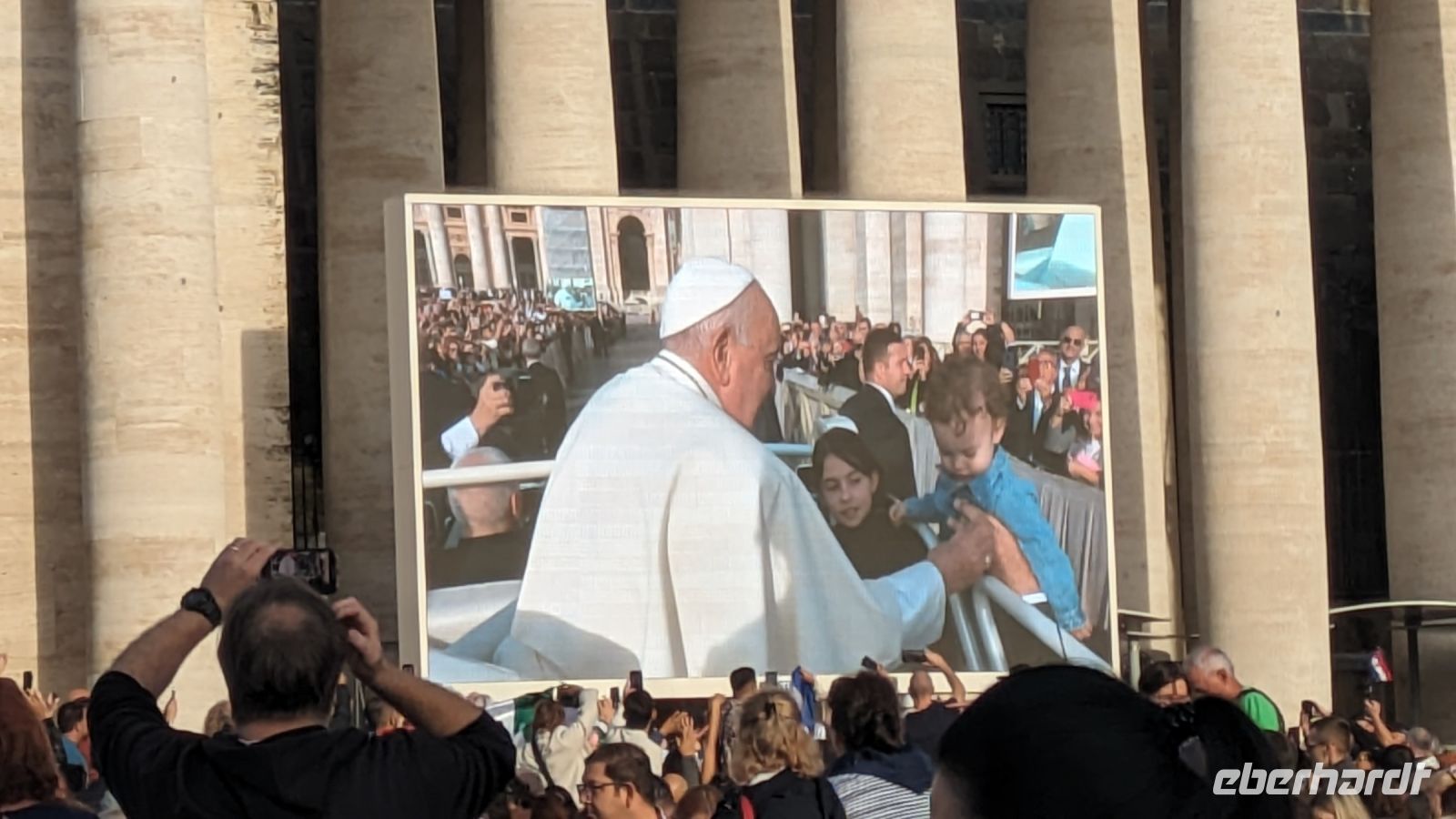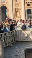 Höhepunkt an diesem Reisetag in Rom war die Generalaudienz bei Papst Franziskus, die jeden Mittwoch auf dem Petersplatz stattfindet. Wir hatten Glück, es war bestes Touristenwetter. Zuvor versuchen stets tausende Menschen mit den öffentlichen Verkehrsmitteln zum Petersplatz zu gelangen, was den ÖPNV immer völlig überlastet. Nur gut, dass Eberhardt Travel auch hier vorgesorgt hatte und uns mit VANs direkt vom Hotel zum Petersplatz brachte. Danach hieß es geduldig in der Schlange bei der Sicherheitskontrolle stehen. Zu Beginn der Generalaudienz fährt der Papst mit seinem offenen Fahrzeug durch die Reihen und wir hatten die Gelegenheit ihn aus nur ca. 10 m Entfernung zu sehen. Seine Predigt wurde in mehrere Sprachen übersetzt.