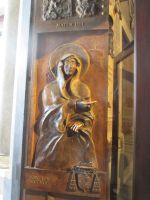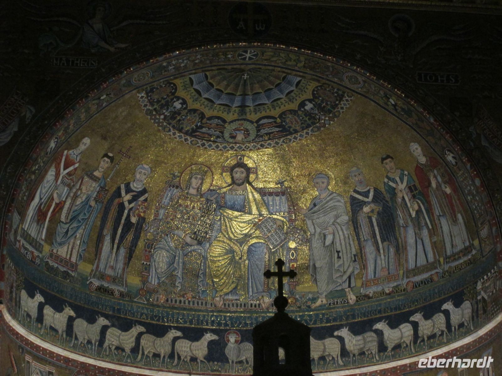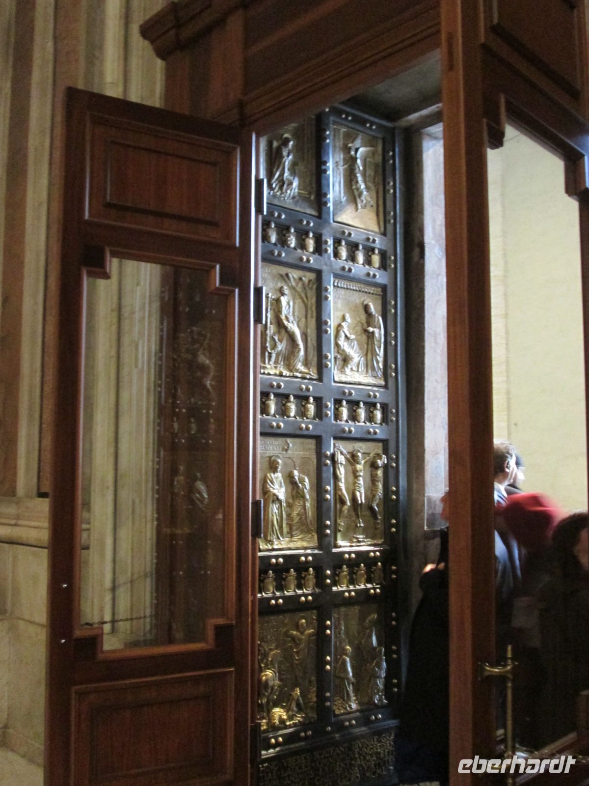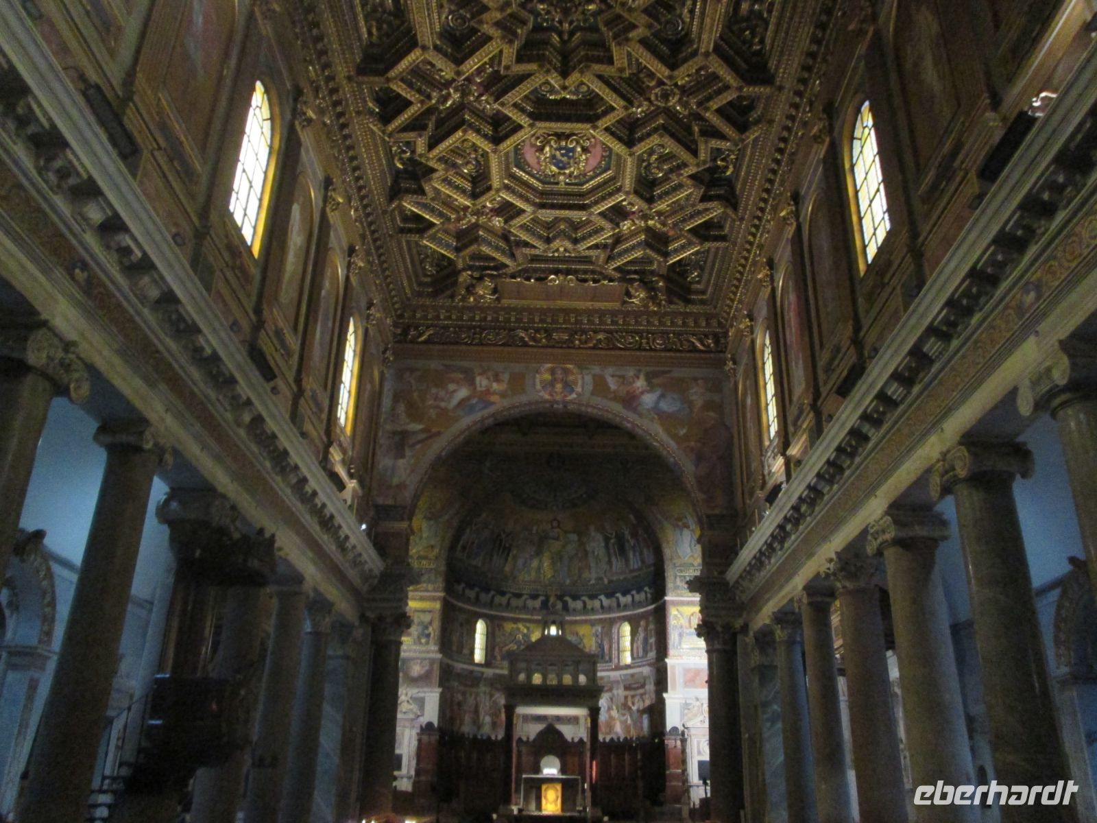Da 2025 das "Heilige Jahr" gefeiert wird, konnte man durch die nur alle 25 Jahre geöffnete "Heilige Pforte" das Innere betreten. Ein erster überwältigender Blick schweifte in die Basilika mit der vergoldeten Kassettendecke, dem unglaublichen Mosaikschmuck, den Baldachin mit dem Hauptaltar und darunter dem Reliquiar der Heiligen Krippe und die Marmorstatue des betenden Papstes Pius IX.