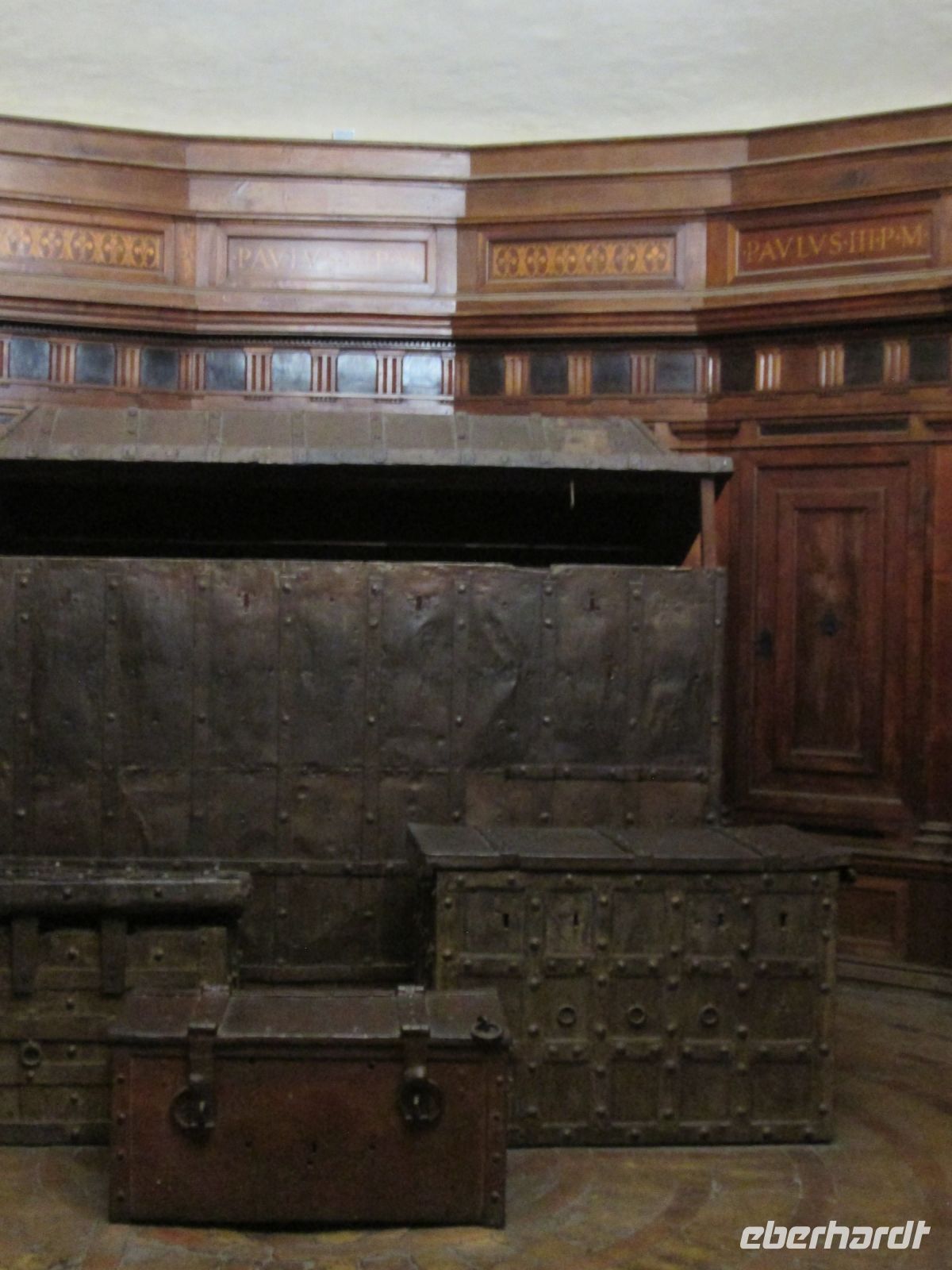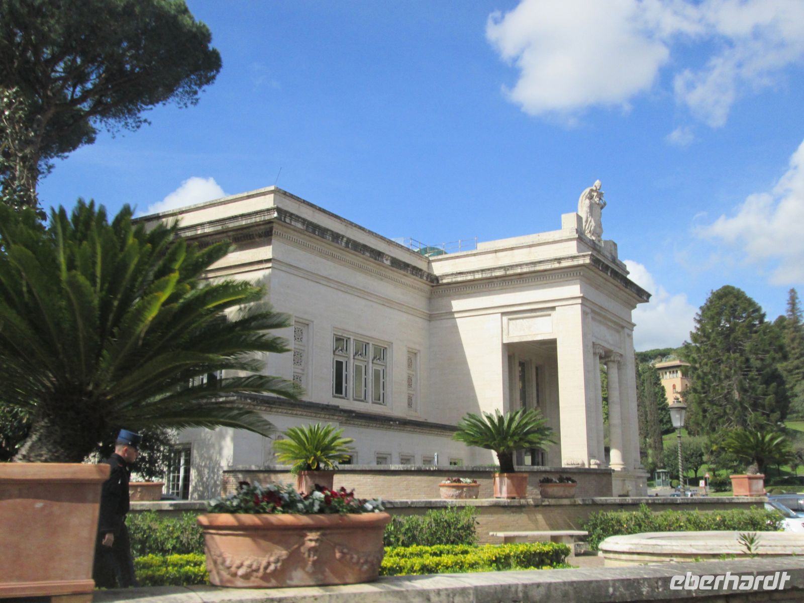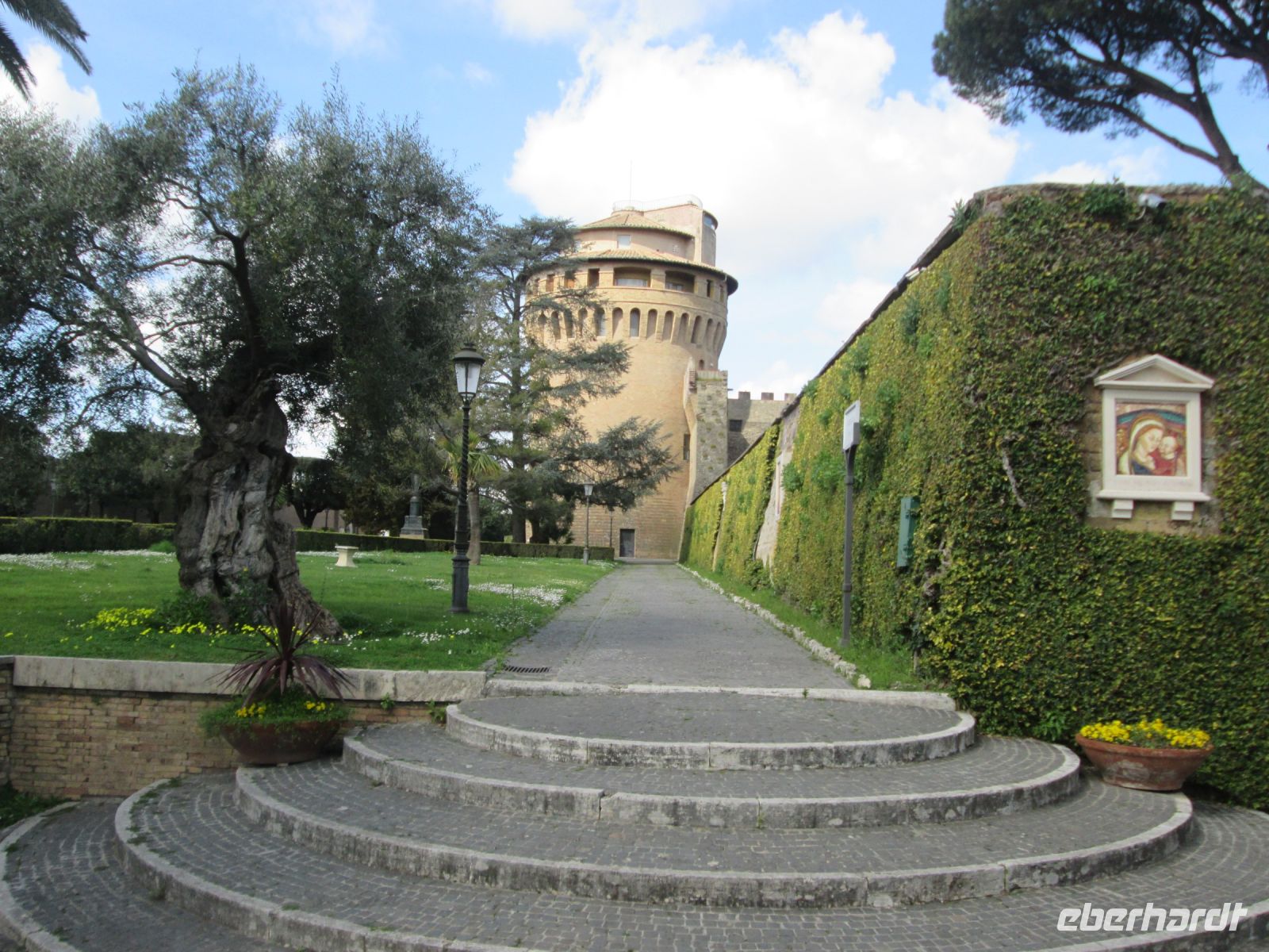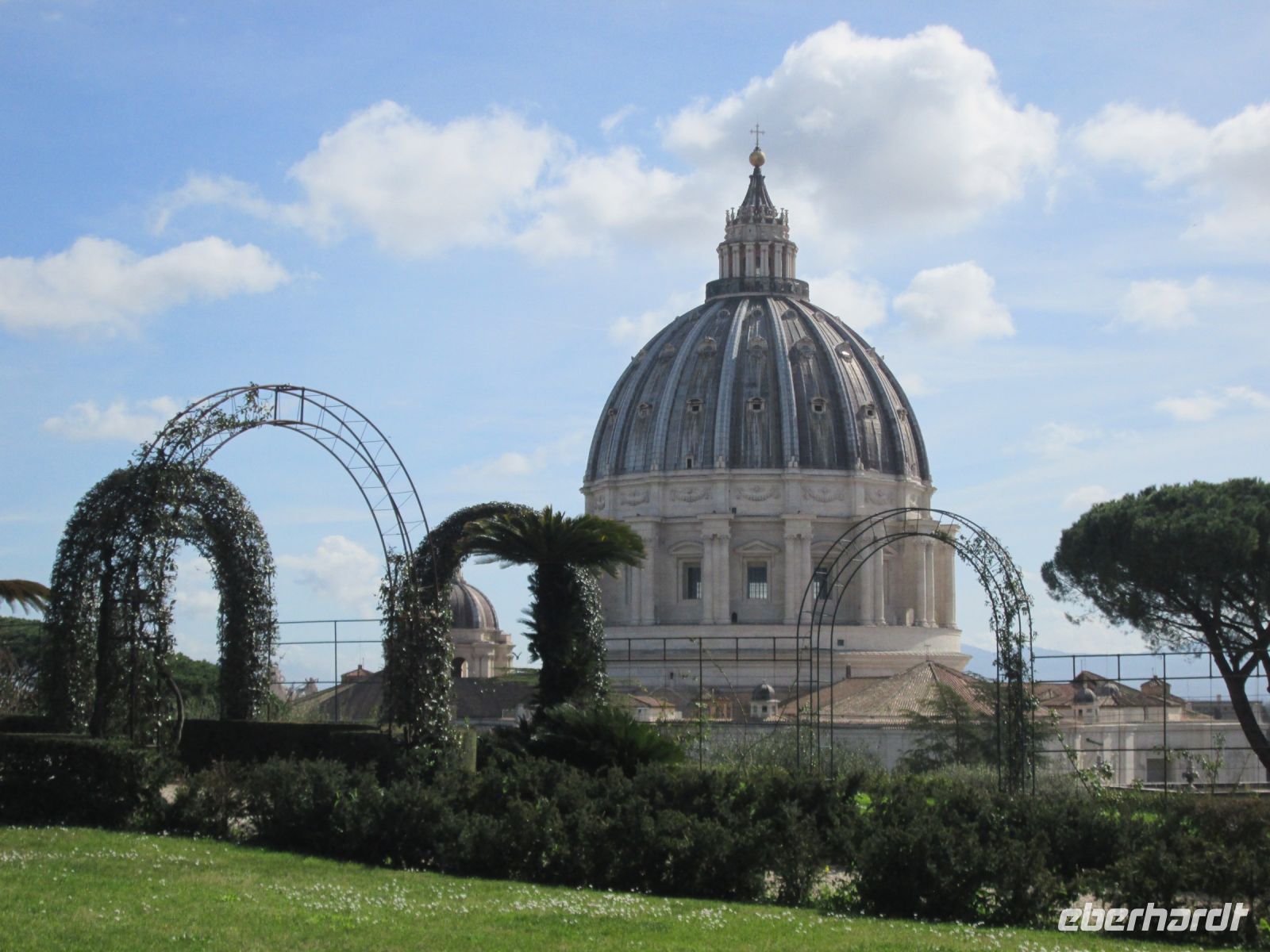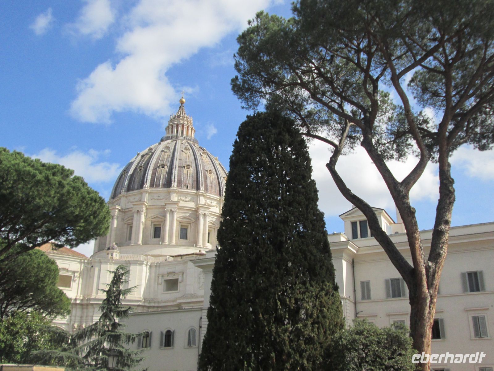 Mit dem schnellsten Fortbewegungsmittel Roms, der Metro, fuhren wir auf die andere Tiberseite, zum "SCV", wie wir es später auf den Autokennzeichen überall sehen konnten. Der Stato della Cita del Vaticano ist der kleinste Staat der Welt mit einer Fläche von 44 ha. Dazu gehören selbstverständlich auch die Vatikanischen Gärten und die Vatikanischen Museen. Genau in dieser Reihenfolge gab es die Besichtigungen, wieder bestens organisiert vom Eberhardt-Produktmanager, Herrn Patrick Fritzsche. Die gemütliche Rundfahrt durch die Gärten war eine willkommene Entspannung in der Natur. Die Sonne war unser Begleiter, und die Fotos von Brunnen, Steingärten, Jahrhunderte alten Bäumen, Kamelien, dem englischen Garten, Magnolien und Grotten sind Zeugnisse eines besonderen Erlebnisses.