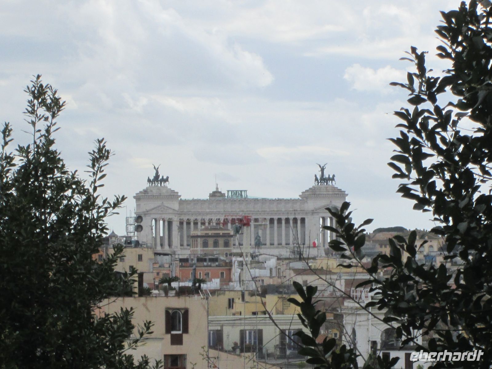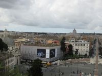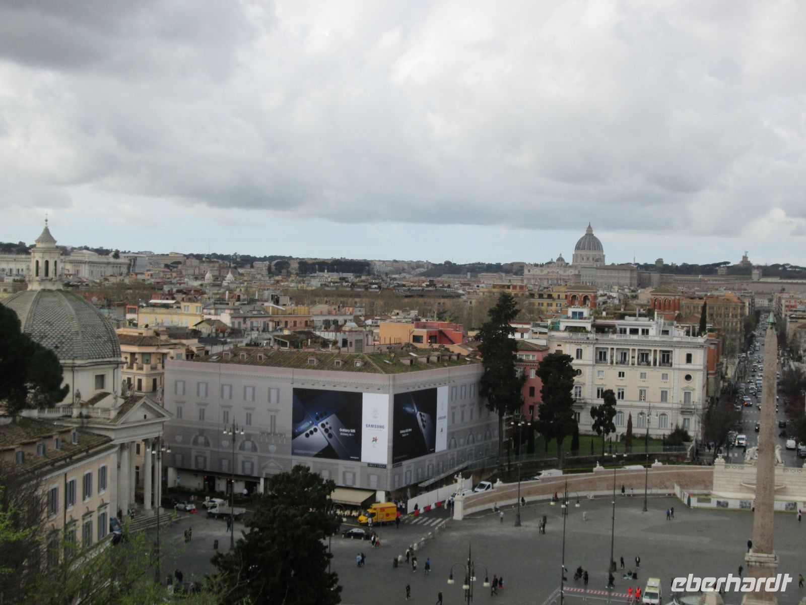 Eine kurze U-Bahn-Fahrt und schon waren wir auf einem Platz, der eingerahmt wird von 2 Kirchen, einem Stadttor und dem Pincio Hügel: Piazza del Popolo. Auf letzteren ging es hinauf, diesmal mit Sonnenschein, und somit hatten wir einen herrlichen Blick.