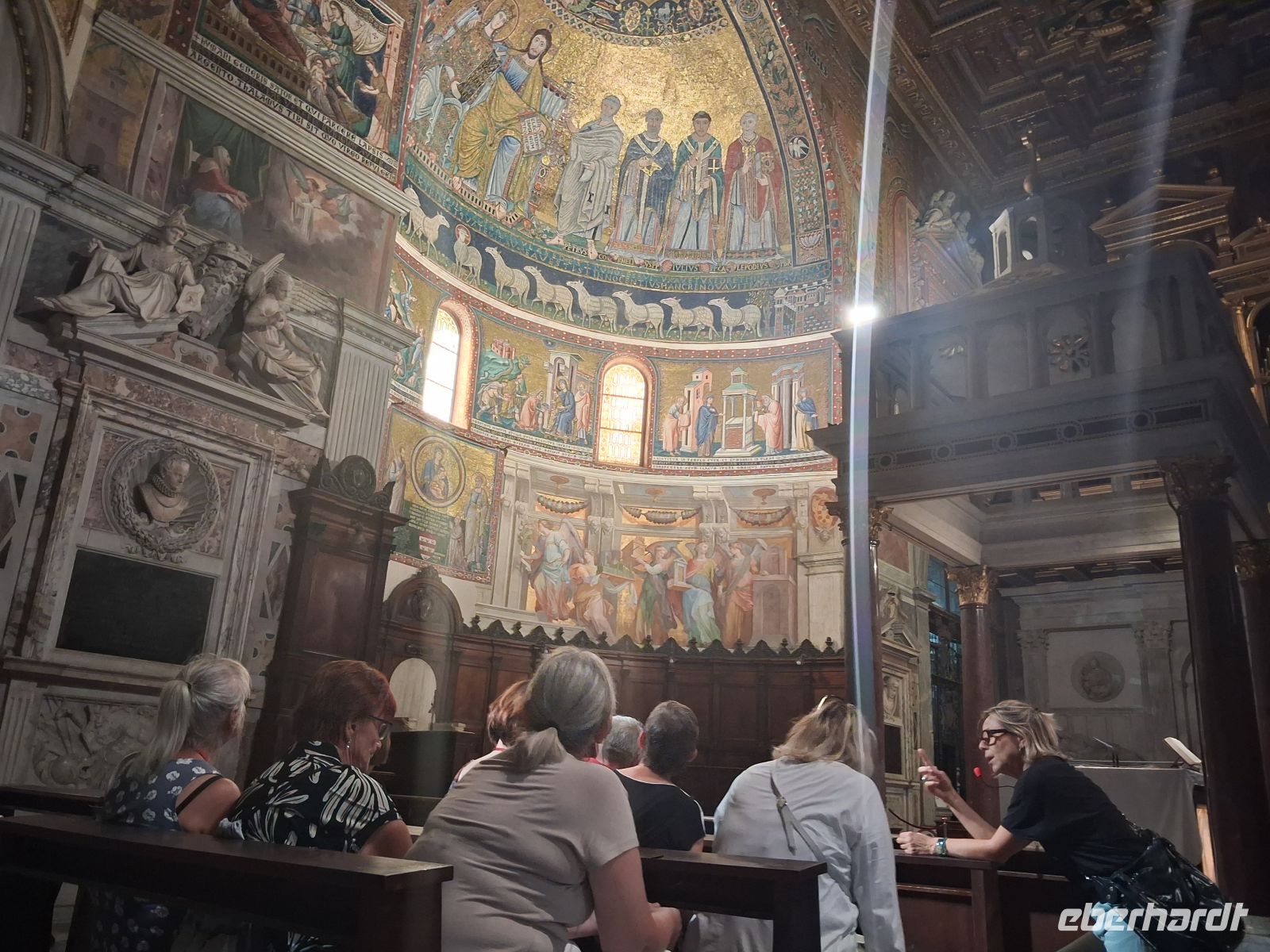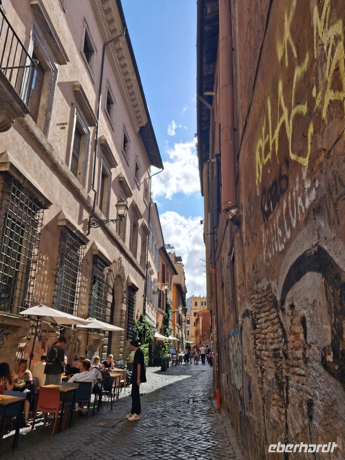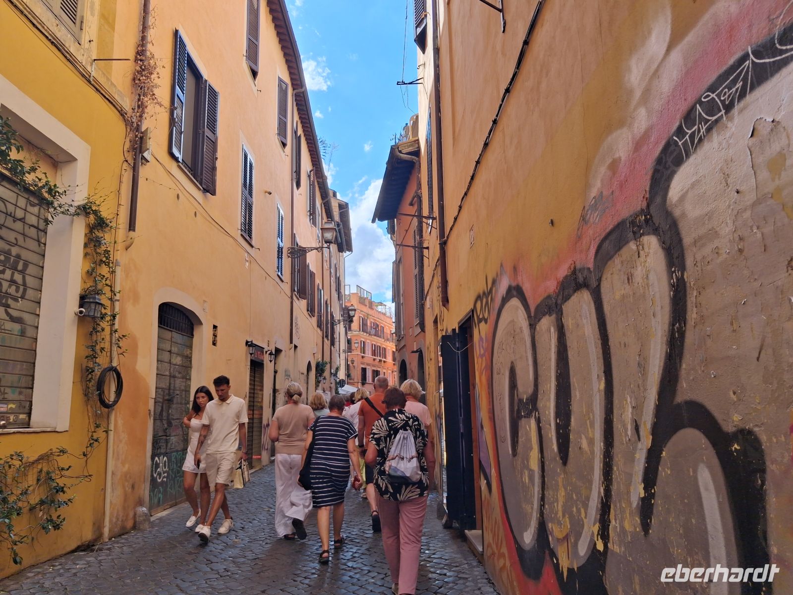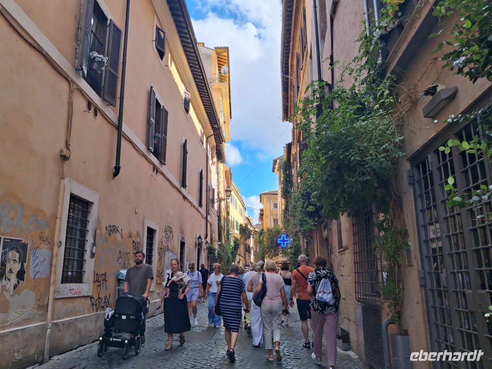 Anschließend besuchen wir den Marktplatz Campo de' Fiori mit der Statue von Giordano Bruno. Von hier gehen wir weiter über den Tiber bis in das charakteristische Stadtviertel Trastevere. Durch bunte Gassen mit vielen Lokalen und einigen noch traditionellen Handwerksläden erreichen wir die Kirche Santa Maria in Trastevere. Agnieszka betritt sie gemeinsam mit uns, um uns die Bedeutung und die kunstvollen Mosaiken zu erläutern. Nun ist schon Zeit, sich von unserer örtlichen Reiseführererin zu verabschieden - 5 eindrucksvolle Tage in Rom sind viel zu schnell vergangen. Wir haben noch Freizeit, die wir in Trastevere oder auf der anderen Seite des Tibers verbringen, bevor wir wieder ins Hotel zurückkehren. Um die Reise gemeinsam ausklingen zu lassen, treffen wir uns zum Abschied in einer Trattoria in unserem Stadtviertel Monti.