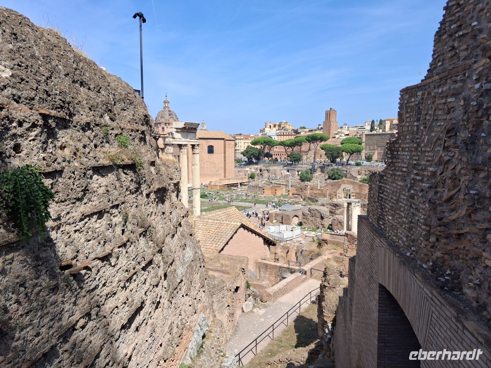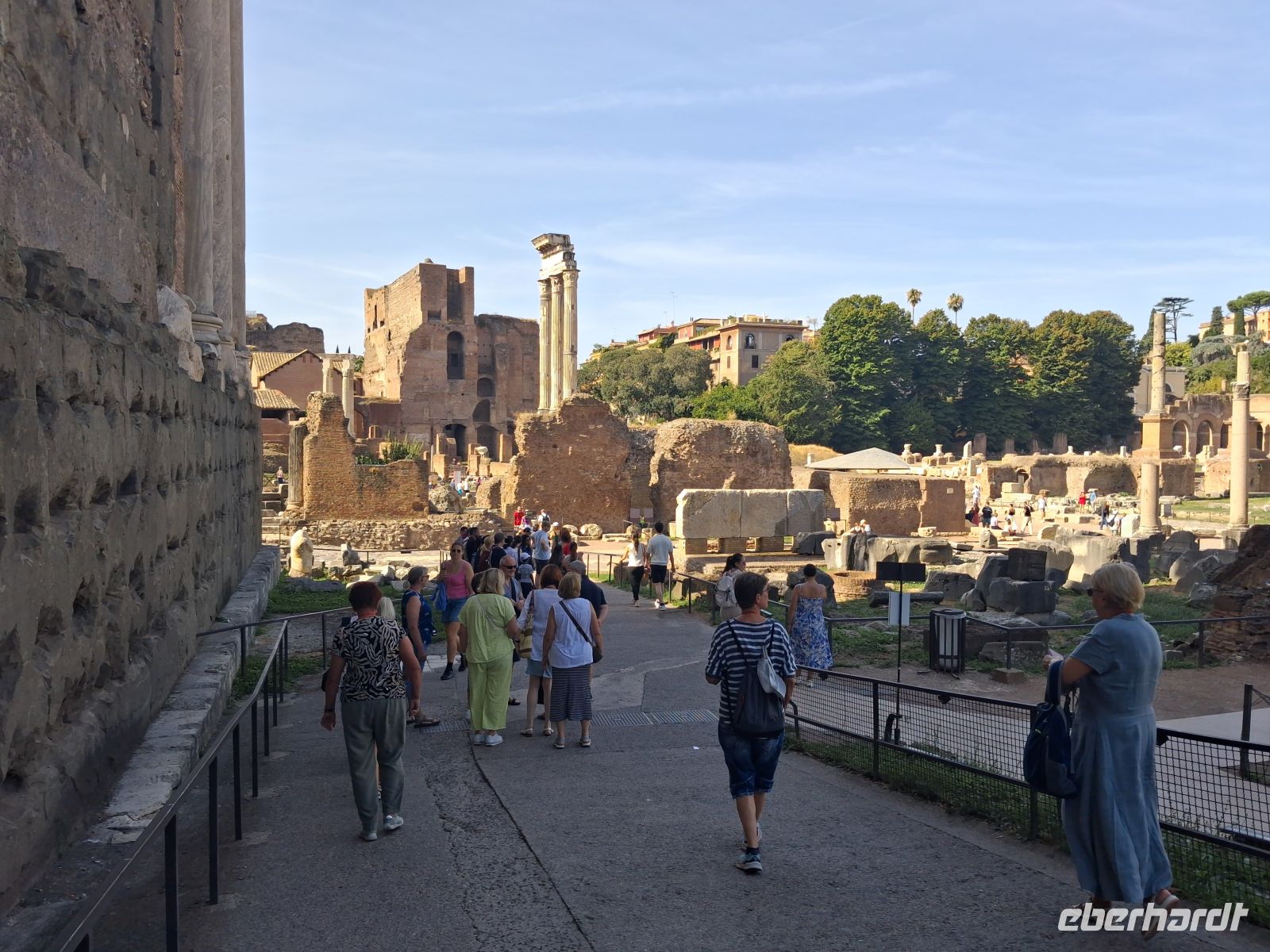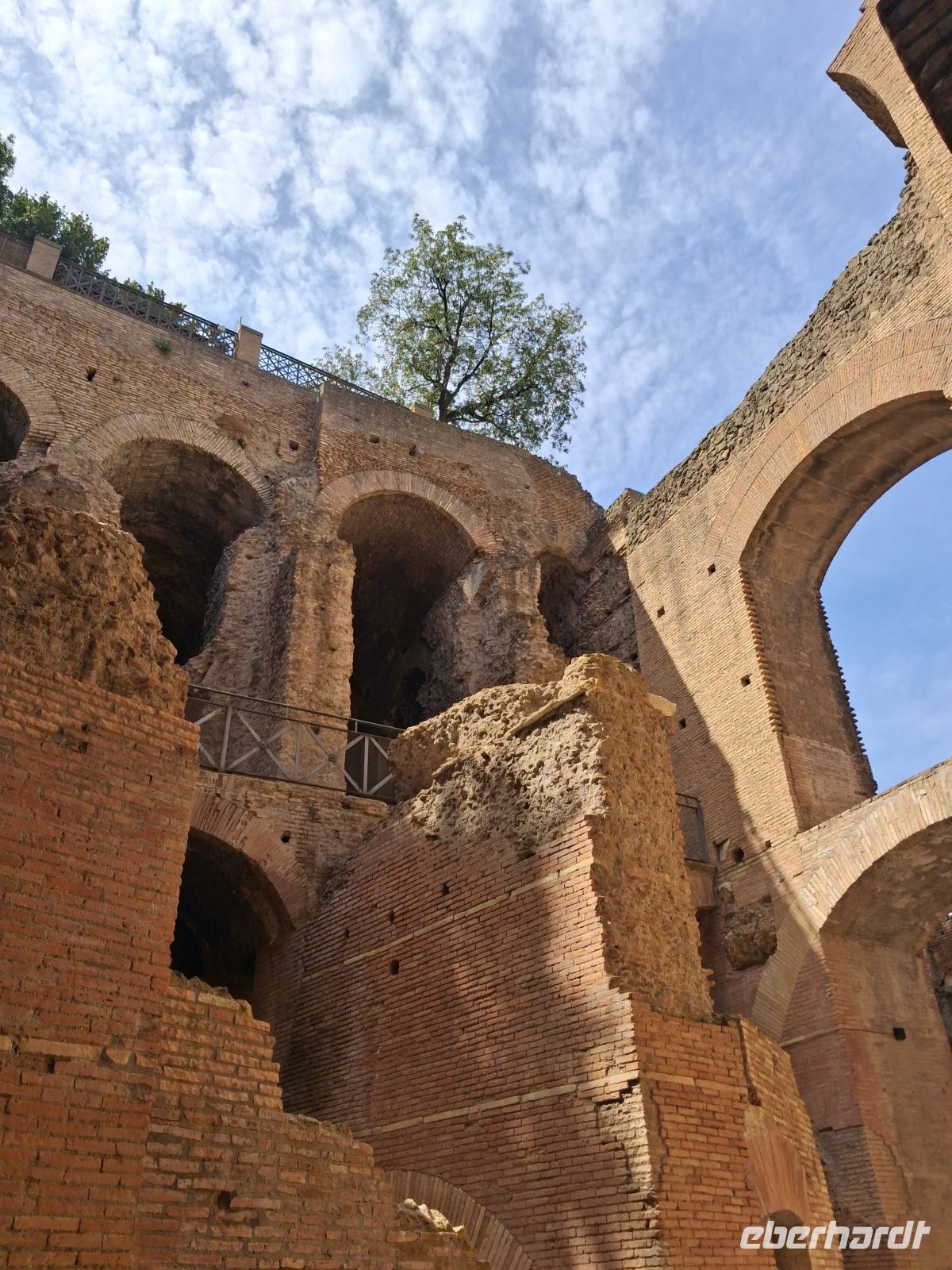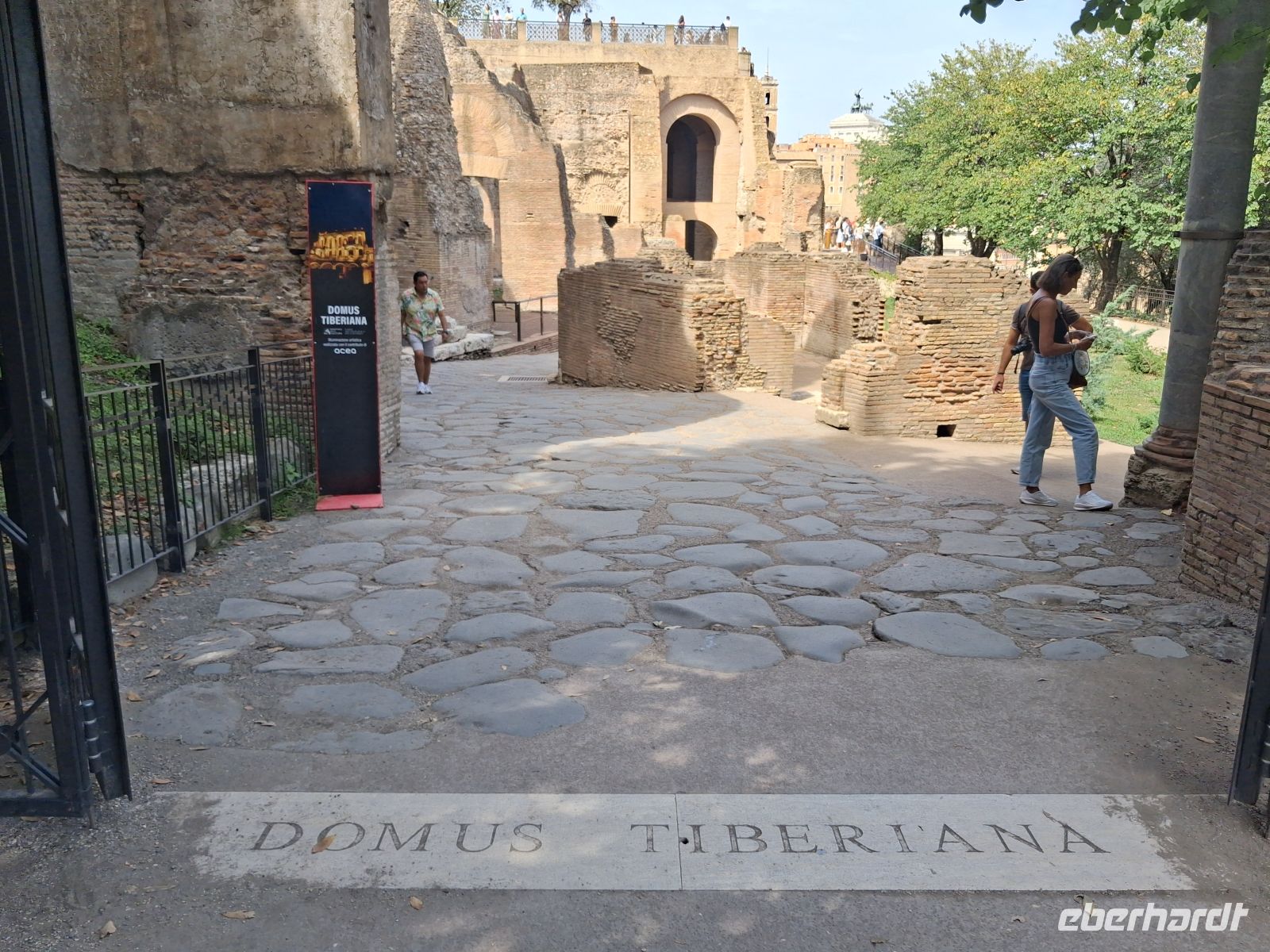 Nach dem Frühstück treffen wir unsere Reiseleiterin Agnieszka in der Lobby unseres Hotels, die uns auf die nächsten Besichtigungstage einstimmt. Von der Dachterrasse neben unserem Frühstücksraum können wir bereits einen ersten Blick auf Rom und das Nationaldenkmal werfen. Nach der Einführung testen wir die praktischen Audiogeräte, alles funktioniert wie geplant, und wir begeben uns zu Fuß zum Archäologischen Park. In wenigen Minuten erreichen wir das Forum Romanum. Zwischen den alten Säulen, Tempelresten und Plätzen erweckt unsere Reiseleiterin die Vergangenheit zum Leben. Während wir durch die Ruinen spazieren, erklärt Agnieszka uns, wie Rom entstand und hier einst Politik gemacht und das römische Alltagsleben organisiert wurde. Der Aufstieg auf den Palatin führt uns mit unserem Sonderticket zur Casa Tiberiana. Dieses Gebiet wurde erst vor wenigen Jahren für Touristen zugänglich gemacht. Die Casa Tiberiana, benannt nach Kaiser Tiberius, gehört zu den ältesten erhaltenen kaiserlichen Palästen in Rom. Von den oberen Bereichen hat man auf Aussichtsterrassen einen herlichen Blick auf das Forum Romanum. Zwischen den Resten von Wohn- und Repräsentationsräumen, von Gärten und Wandelhallen sehen wir marmorne Böden, reich mit Fresken verzierte Decken und hohe Hallen, die uns die Atmosphäre kaiserlicher Macht und die Pracht der Vergangenheit verdeutlichen.