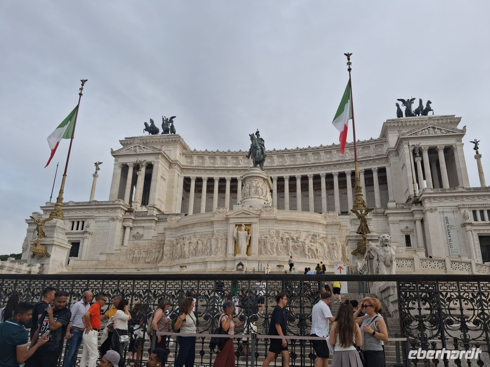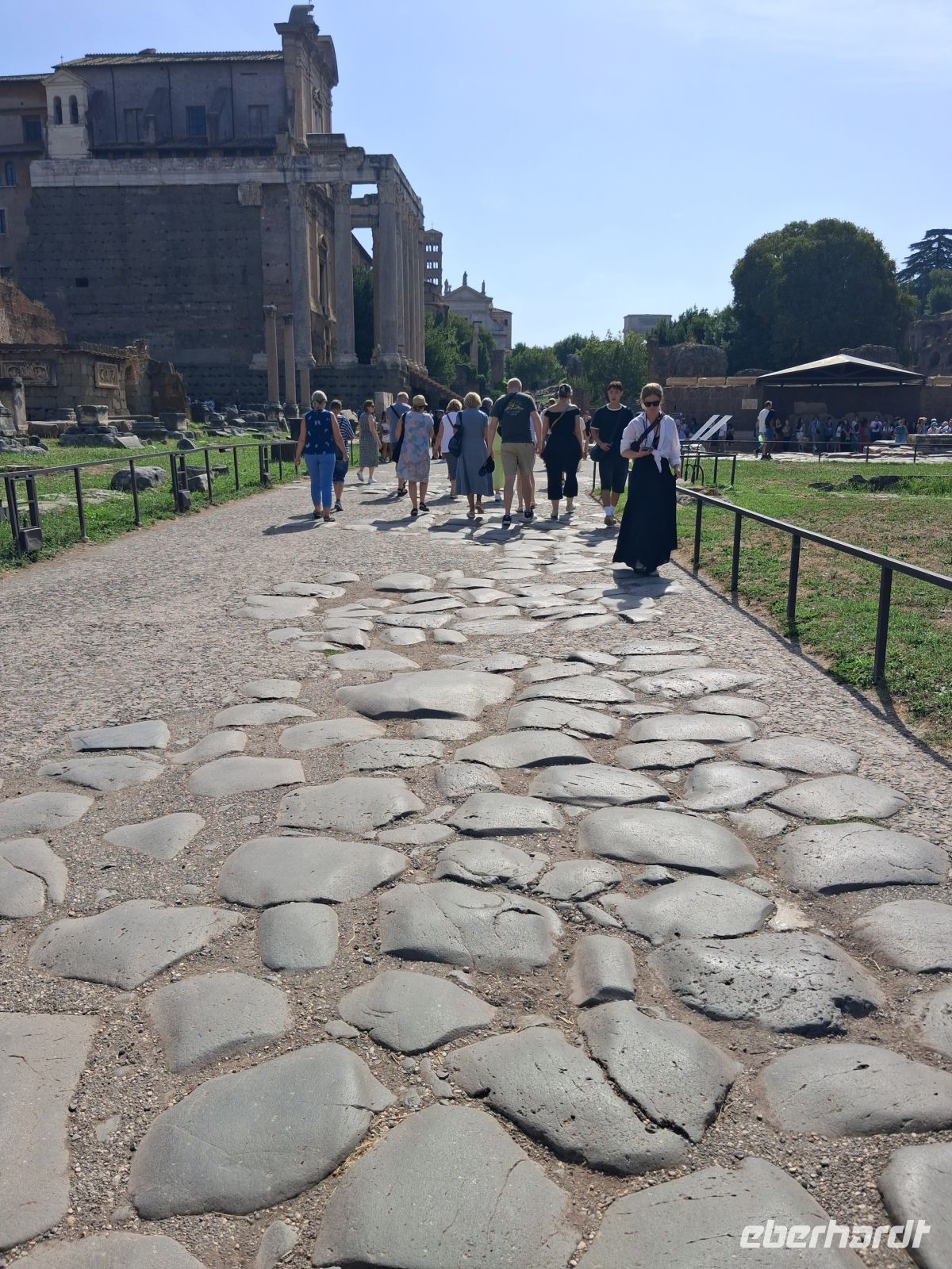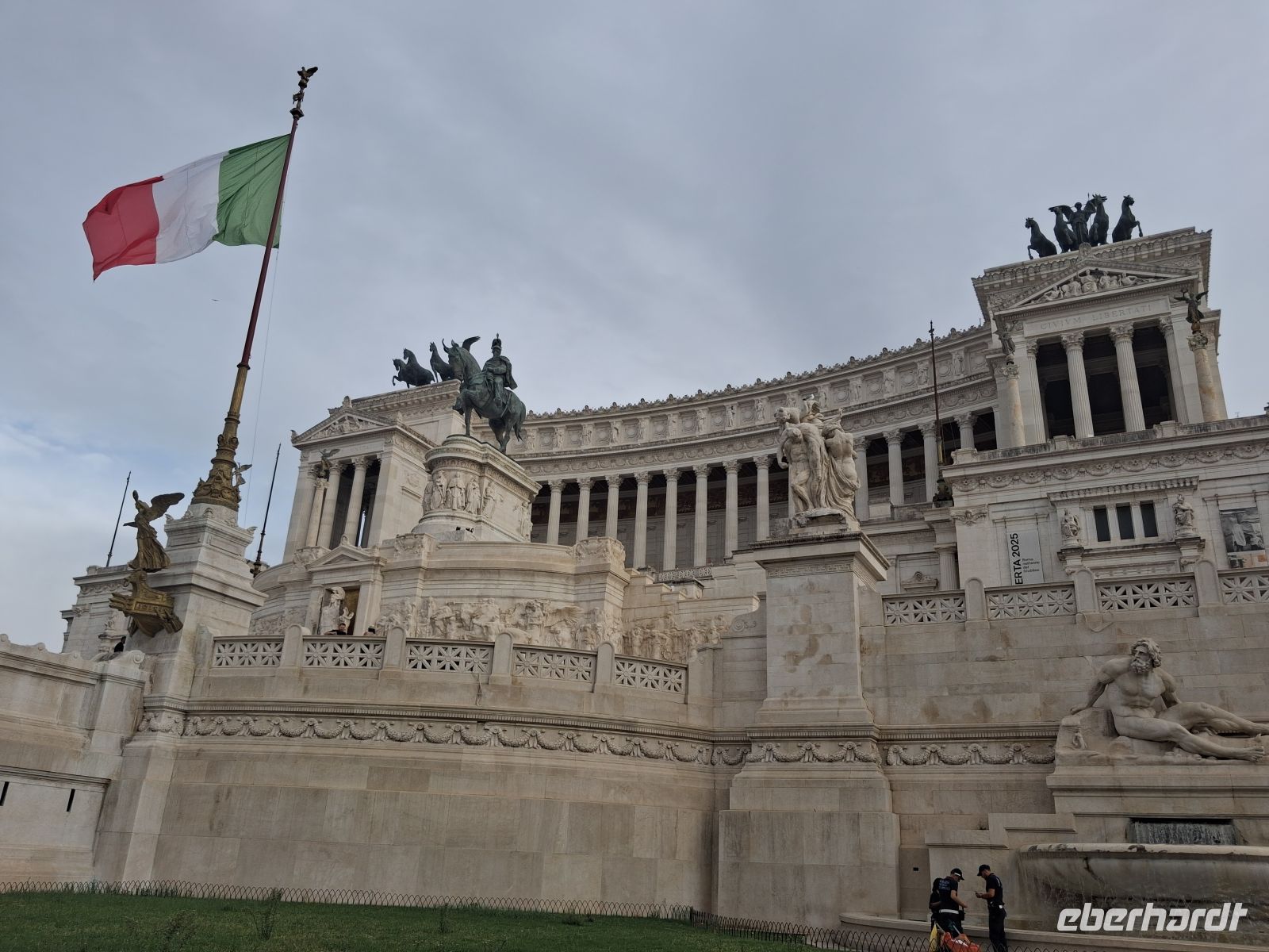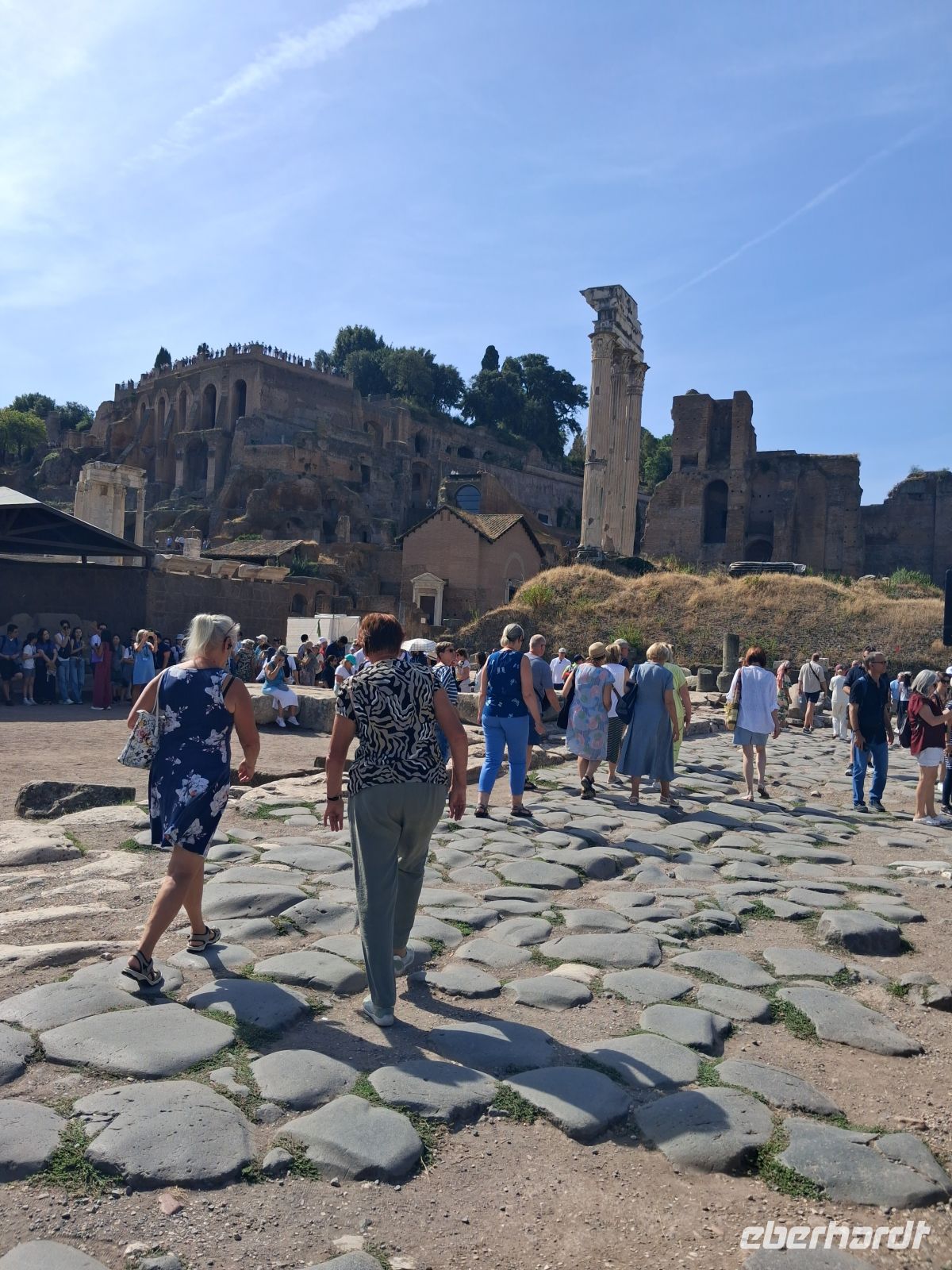Nach dem Frühstück treffen wir unsere Reiseleiterin Agnieszka in der Lobby unseres Hotels, die uns auf die nächsten Besichtigungstage einstimmt. Von der Dachterrasse neben unserem Frühstücksraum können wir bereits einen ersten Blick auf Rom und das Nationaldenkmal werfen. Nach der Einführung testen wir die praktischen Audiogeräte, alles funktioniert wie geplant, und wir begeben uns zu Fuß zum Archäologischen Park. In wenigen Minuten erreichen wir das Forum Romanum. Zwischen den alten Säulen, Tempelresten und Plätzen erweckt unsere Reiseleiterin die Vergangenheit zum Leben. Während wir durch die Ruinen spazieren, erklärt Agnieszka uns, wie Rom entstand und hier einst Politik gemacht und das römische Alltagsleben organisiert wurde. Der Aufstieg auf den Palatin führt uns mit unserem Sonderticket zur Casa Tiberiana. Dieses Gebiet wurde erst vor wenigen Jahren für Touristen zugänglich gemacht. Die Casa Tiberiana, benannt nach Kaiser Tiberius, gehört zu den ältesten erhaltenen kaiserlichen Palästen in Rom. Von den oberen Bereichen hat man auf Aussichtsterrassen einen herlichen Blick auf das Forum Romanum. Zwischen den Resten von Wohn- und Repräsentationsräumen, von Gärten und Wandelhallen sehen wir marmorne Böden, reich mit Fresken verzierte Decken und hohe Hallen, die uns die Atmosphäre kaiserlicher Macht und die Pracht der Vergangenheit verdeutlichen.