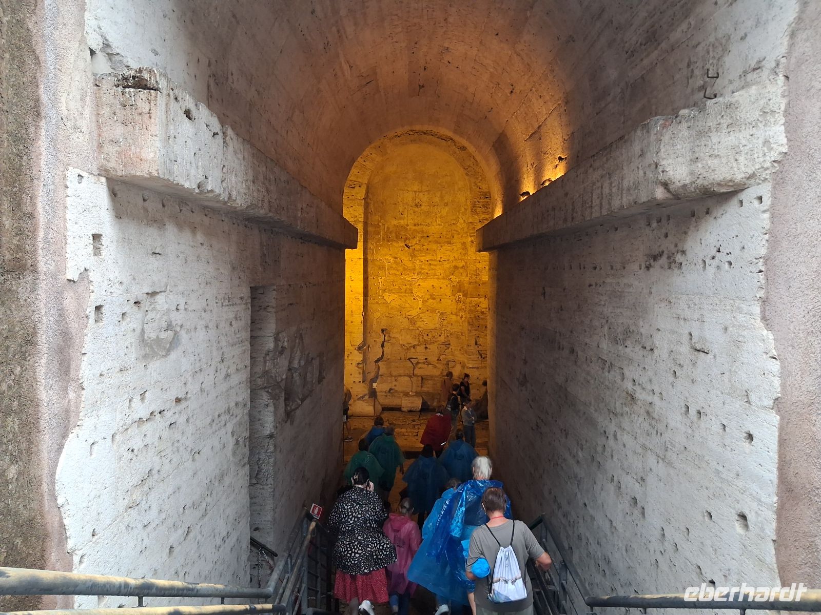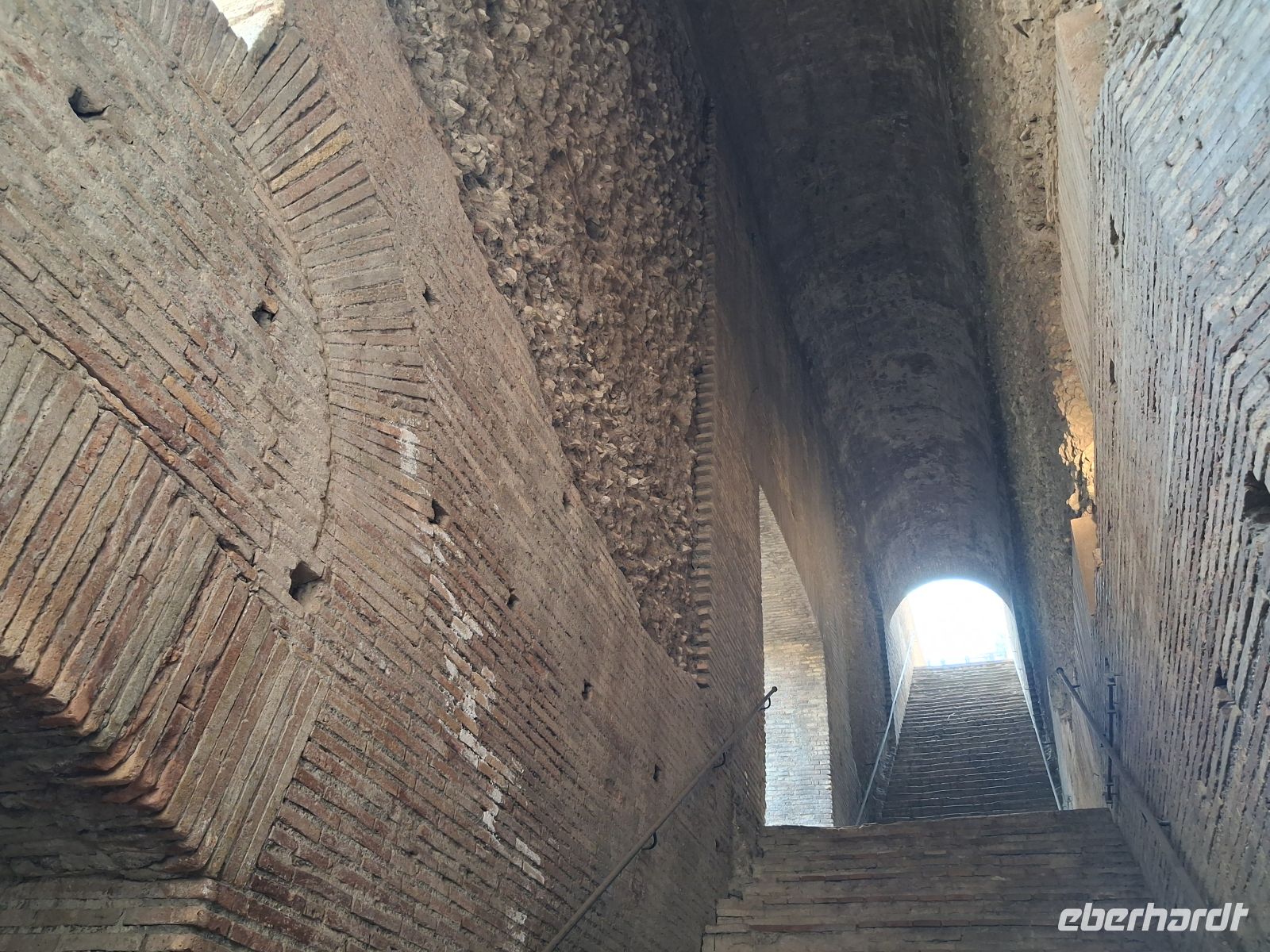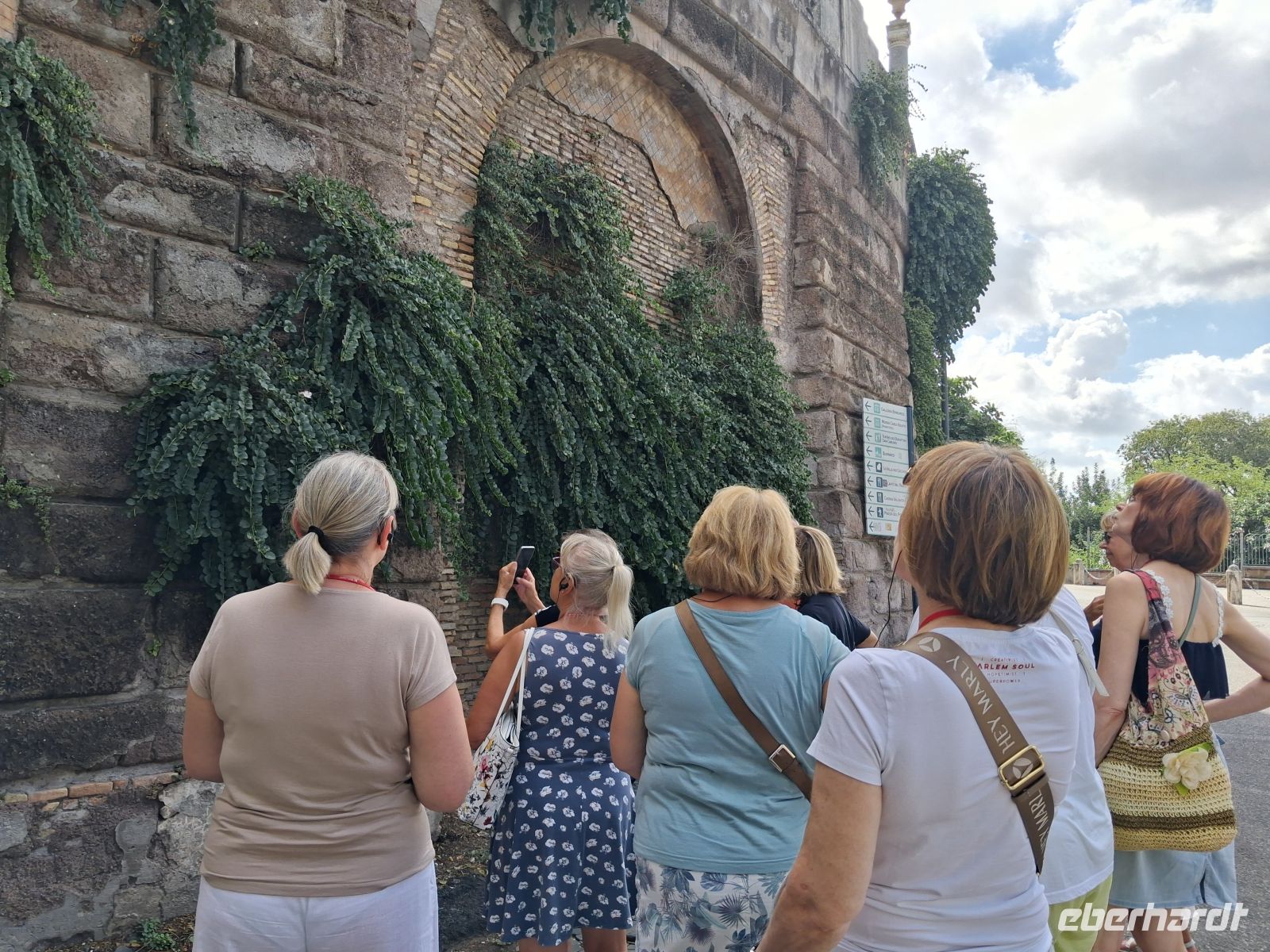 Nach einer Mittagspause in einer Trattoria begeben wir uns zum Kolosseum, das Amphiteatrum Flavium, wie es eigentlich heißt. Mit unseren Sonderkarten haben wir einen speziellen Zutritt zur Arena. Schon beim Betreten des Kolosseums spüren wir die gewaltige Dimension dieses Bauwerks. Plötzlich stehen wir mitten im Zentrum, dort wo vor rund 2000 Jahren das Publikum bei Gladiatorenkämpfen tobte. Agnieszka erzählt uns, wie der Zugang und die Schauspiele im Kolosseum organisiert wurden und welchen Zweck sie hatten. Wir sehen die unterirdischen Gänge der Arena, wo Tiere und Kämpfer auf ihren Einsatz warteten. Anschließend haben wir Gelegenheit, über die höheren Ränge einen Blick von oben in das Innere der Arena zu werfen und das Kolosseum von innen zu umrunden.