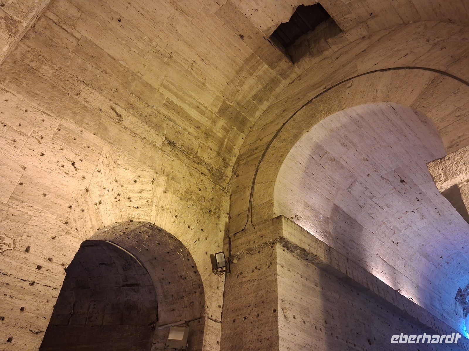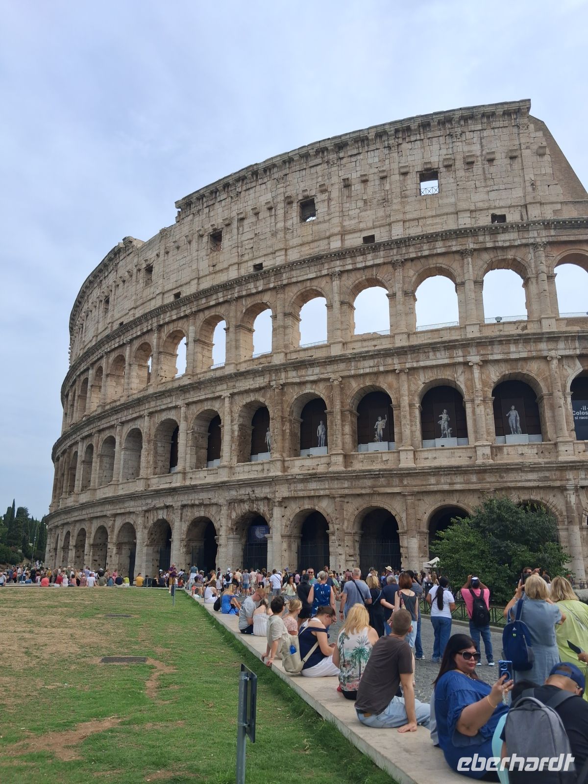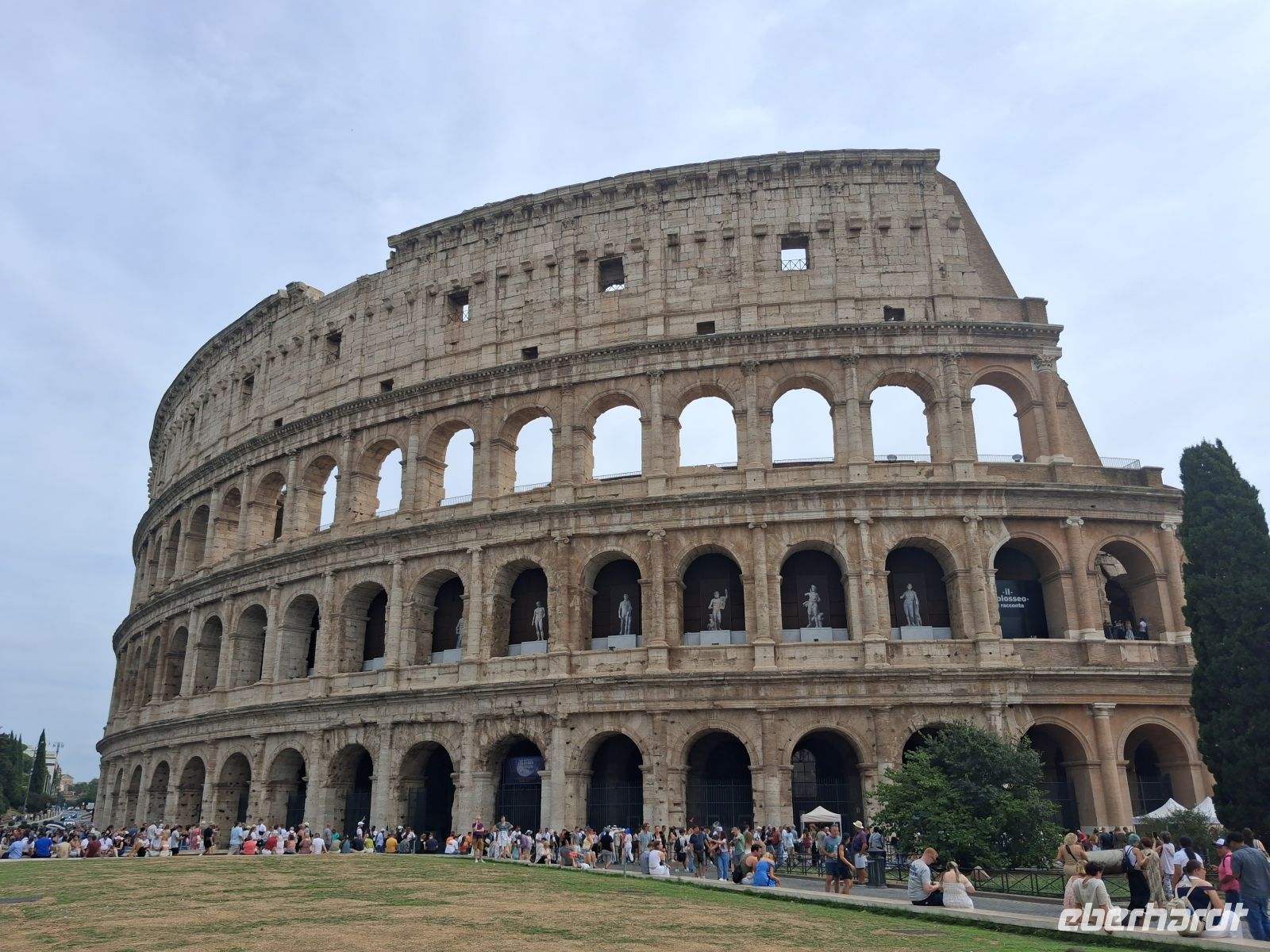 Nach einer Mittagspause in einer Trattoria begeben wir uns zum Kolosseum, das Amphiteatrum Flavium, wie es eigentlich heißt. Mit unseren Sonderkarten haben wir einen speziellen Zutritt zur Arena. Schon beim Betreten des Kolosseums spüren wir die gewaltige Dimension dieses Bauwerks. Plötzlich stehen wir mitten im Zentrum, dort wo vor rund 2000 Jahren das Publikum bei Gladiatorenkämpfen tobte. Agnieszka erzählt uns, wie der Zugang und die Schauspiele im Kolosseum organisiert wurden und welchen Zweck sie hatten. Wir sehen die unterirdischen Gänge der Arena, wo Tiere und Kämpfer auf ihren Einsatz warteten. Anschließend haben wir Gelegenheit, über die höheren Ränge einen Blick von oben in das Innere der Arena zu werfen und das Kolosseum von innen zu umrunden.