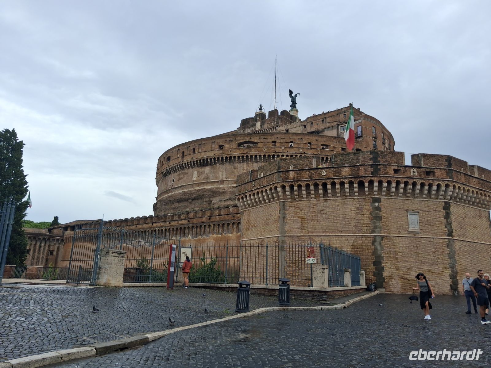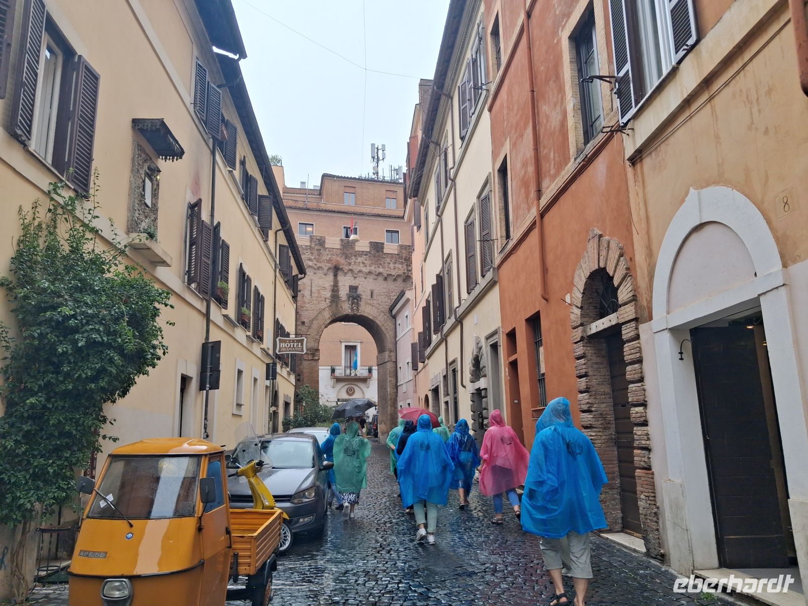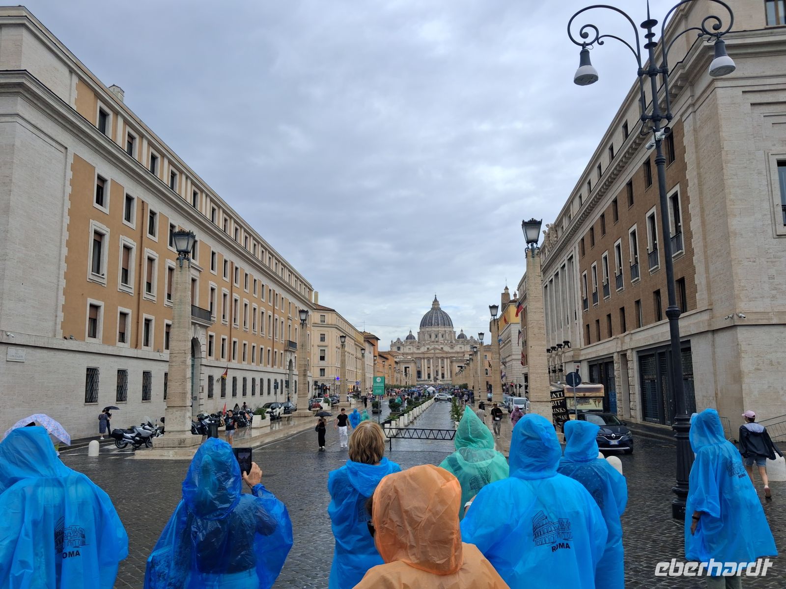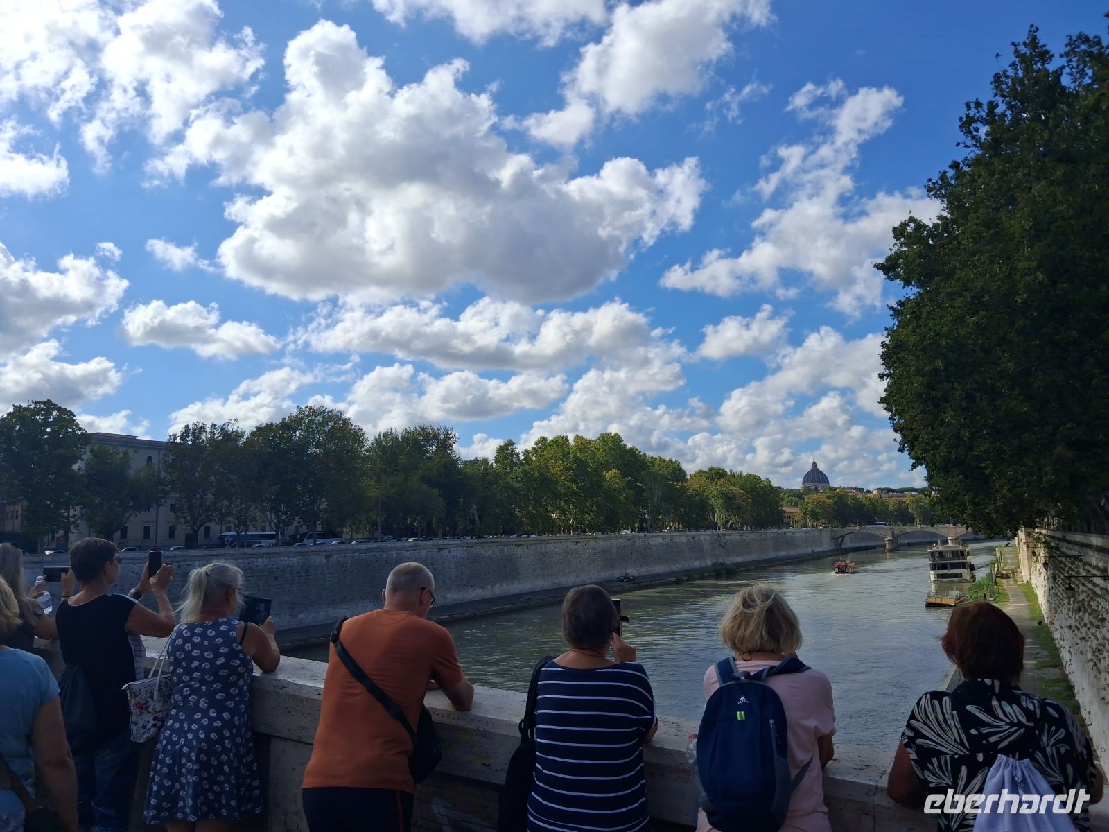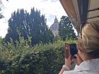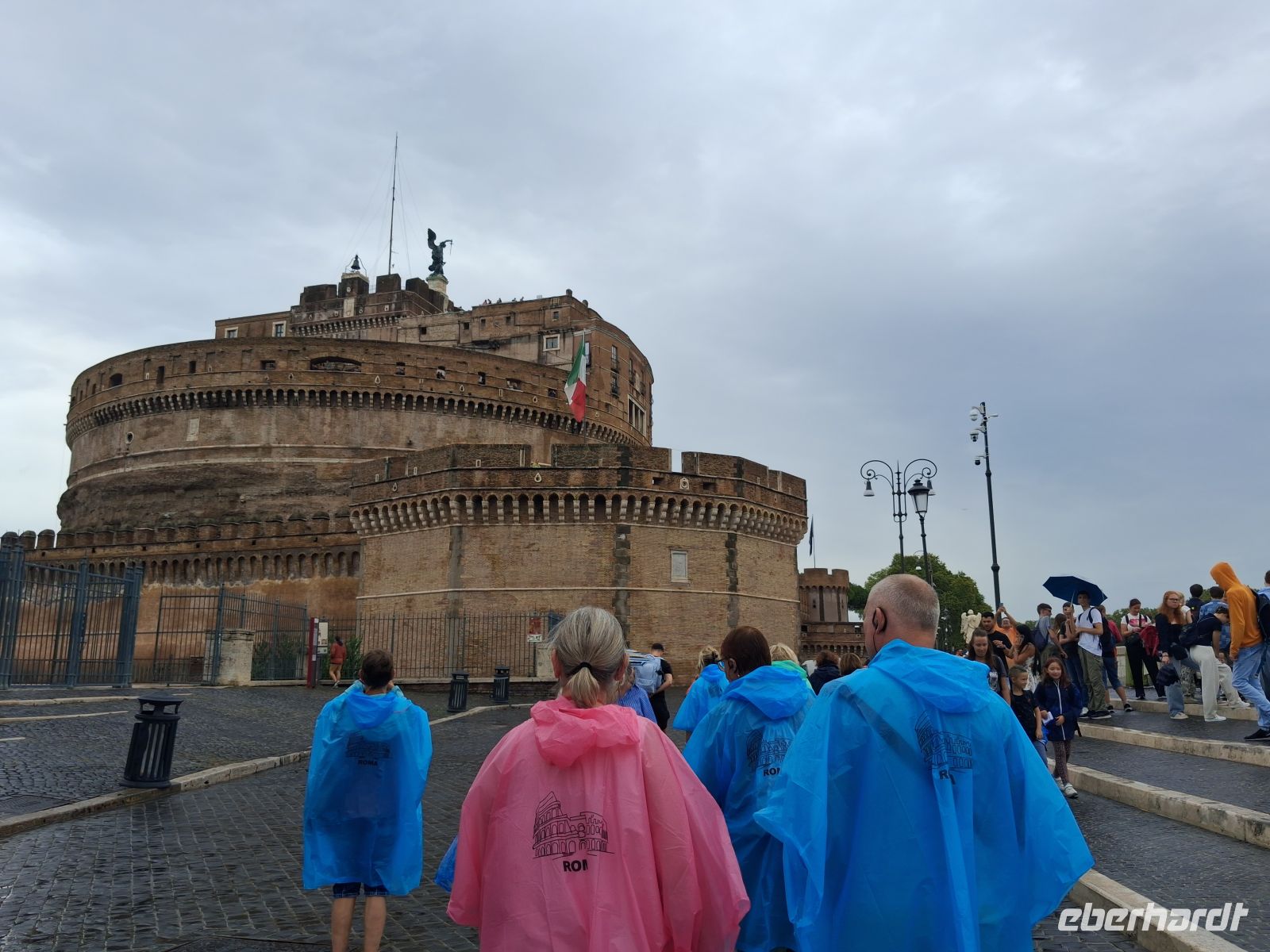 Unser Frühstück ziehen wir heute vor, um uns von unseren Chauffeuren zeitig zum Petersdom bringen zu lassen. Leider ist das Wetter heute regnerisch vorausgesagt, was sich auch bewahrheitet. Wir durchstehen gemeinsam mit unserer kämpferischen Reiseführerin - im Regen - die Zugangskontrolle zur Audienz auf dem Petersplatz. Als Papst Leo XIV. mit seinem Papstmobil durch die Reihen fährt, hat der Regen glücklicherweise nachgelassen. Wir sehen ihn ganz aus der Nähe und können die Reden auf den großen Leinwänden verfolgen. Die Stimmung der internationalen Gäste und Pilger ist aufgeregt und gespannt auf den neuen Papst. Im Anschluss sammeln wir uns und nehmen eine Stärkung in einem familiären Café in der Vatikanstadt ein. Bei leichtem Regen spazieren wir entlang am Passetto di Borgo, dem oberhalb der Straße gelegenen Übergang vom Petersdom bis zur Engelsburg. Agnieszka führt uns durch die kleinen Gassen der Altstadt im Vatikan, vorbei an Schneidergeschäften für kirchliche Würdenträger und Souvenirläden, bis wir die Engelsburg am Tiber erreichen. Hier erfahren wir Wissenswertes über die Geschichte dieses imposanten Gebäudes, das ursprünglich als Mausoleum für den Kaiser Hadrian und seine Familie erbaut wurde. In den Jahrhunderten hat es wegen seiner strategischen Lage direkt am Tiber und nah am Vatikan vielen Zwecken gedient: Das Grabgebäude wurde umgebaut zu einer Festung und diente Päpsten als Rückzugsort in Krisenzeiten. Außerdem war die Engelsburg ein Gefängnis für Staatsgefangene. Wir besichtigen das Museum, das die bewegte Geschichte aus der Kaiserzeit über das Mittelalter bis zur Renaissance und Moderne zeigt. Von ganz oben, wo die Statue des Erzengels Michael thront (der hier Papst Gregor I. erschienen sein soll), genießen wir einen atemberaubenden Blick auf den Vatikan und die Stadt Rom.