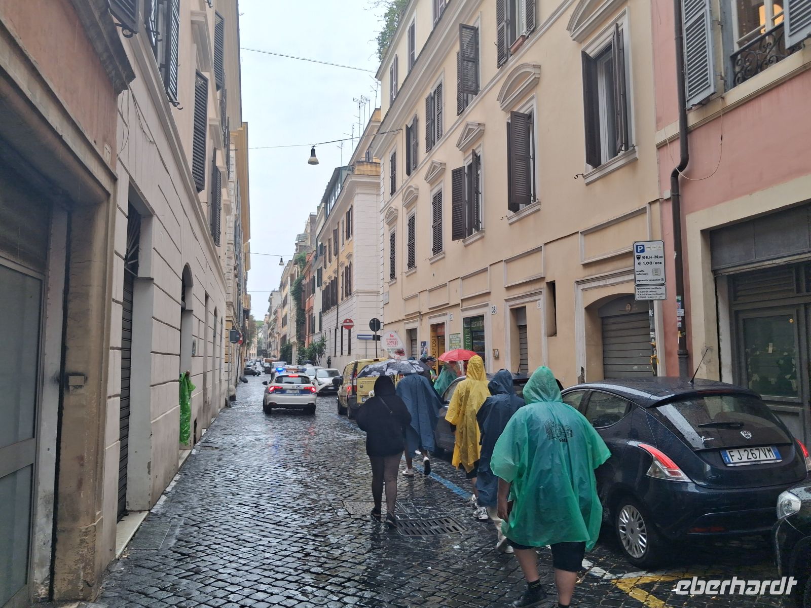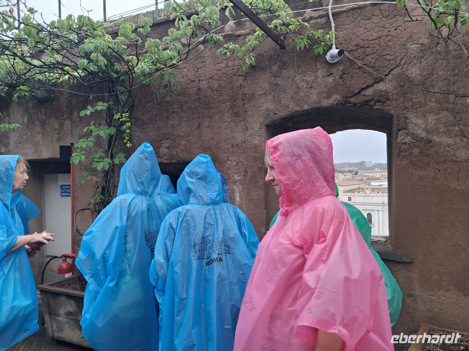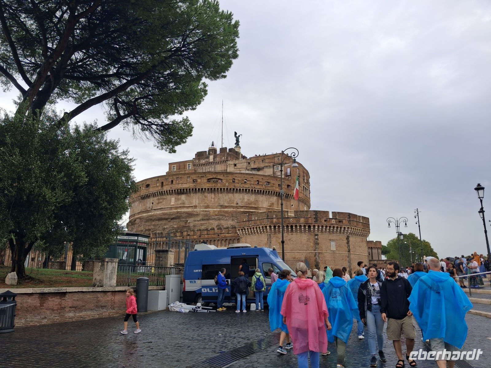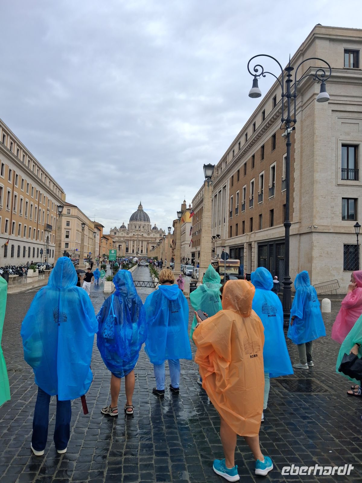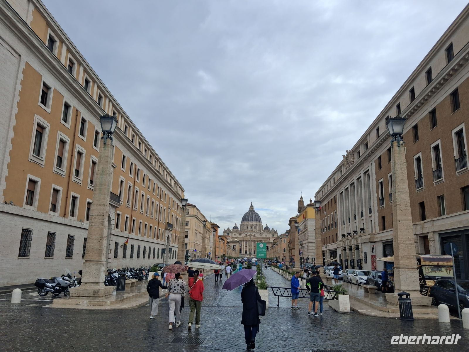Unser Frühstück ziehen wir heute vor, um uns von unseren Chauffeuren zeitig zum Petersdom bringen zu lassen. Leider ist das Wetter heute regnerisch vorausgesagt, was sich auch bewahrheitet. Wir durchstehen gemeinsam mit unserer kämpferischen Reiseführerin - im Regen - die Zugangskontrolle zur Audienz auf dem Petersplatz. Als Papst Leo XIV. mit seinem Papstmobil durch die Reihen fährt, hat der Regen glücklicherweise nachgelassen. Wir sehen ihn ganz aus der Nähe und können die Reden auf den großen Leinwänden verfolgen. Die Stimmung der internationalen Gäste und Pilger ist aufgeregt und gespannt auf den neuen Papst. Im Anschluss sammeln wir uns und nehmen eine Stärkung in einem familiären Café in der Vatikanstadt ein. Bei leichtem Regen spazieren wir entlang am Passetto di Borgo, dem oberhalb der Straße gelegenen Übergang vom Petersdom bis zur Engelsburg. Agnieszka führt uns durch die kleinen Gassen der Altstadt im Vatikan, vorbei an Schneidergeschäften für kirchliche Würdenträger und Souvenirläden, bis wir die Engelsburg am Tiber erreichen. Hier erfahren wir Wissenswertes über die Geschichte dieses imposanten Gebäudes, das ursprünglich als Mausoleum für den Kaiser Hadrian und seine Familie erbaut wurde. In den Jahrhunderten hat es wegen seiner strategischen Lage direkt am Tiber und nah am Vatikan vielen Zwecken gedient: Das Grabgebäude wurde umgebaut zu einer Festung und diente Päpsten als Rückzugsort in Krisenzeiten. Außerdem war die Engelsburg ein Gefängnis für Staatsgefangene. Wir besichtigen das Museum, das die bewegte Geschichte aus der Kaiserzeit über das Mittelalter bis zur Renaissance und Moderne zeigt. Von ganz oben, wo die Statue des Erzengels Michael thront (der hier Papst Gregor I. erschienen sein soll), genießen wir einen atemberaubenden Blick auf den Vatikan und die Stadt Rom.