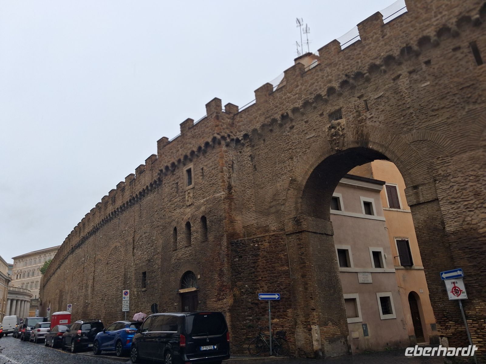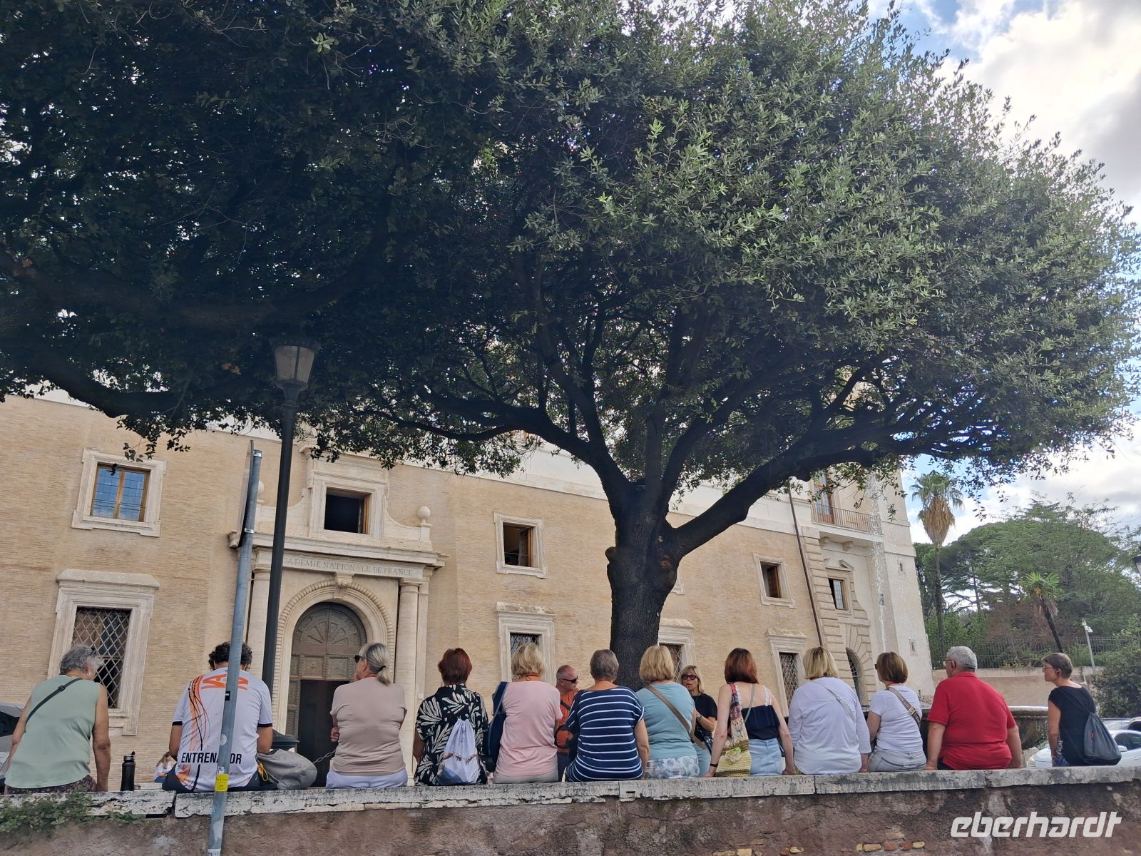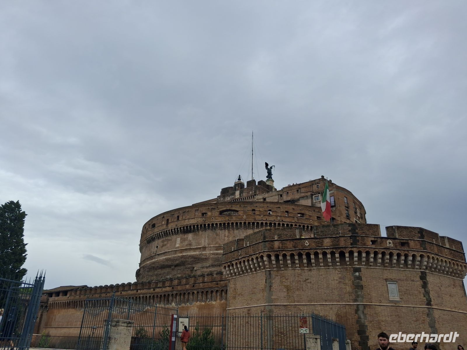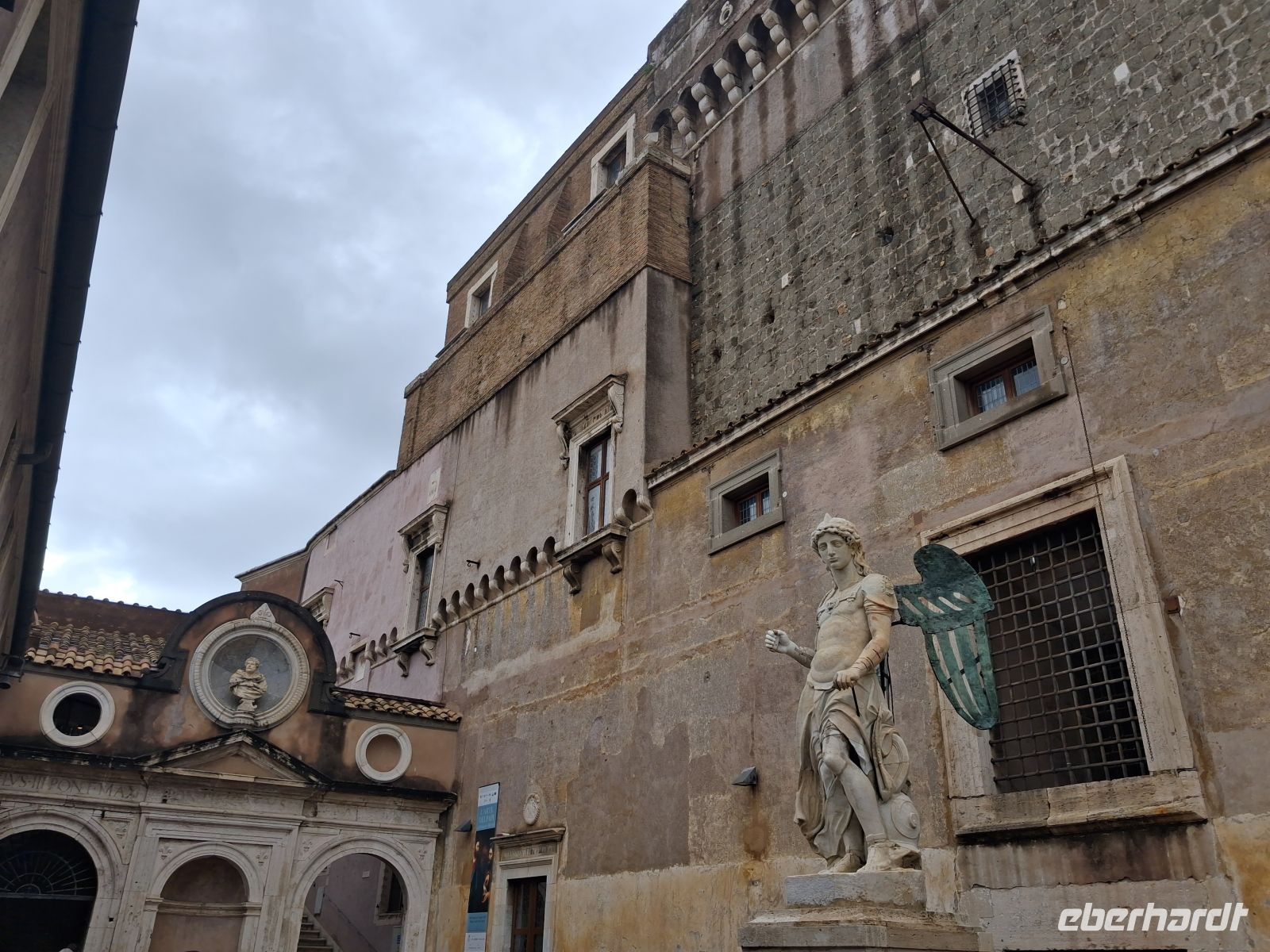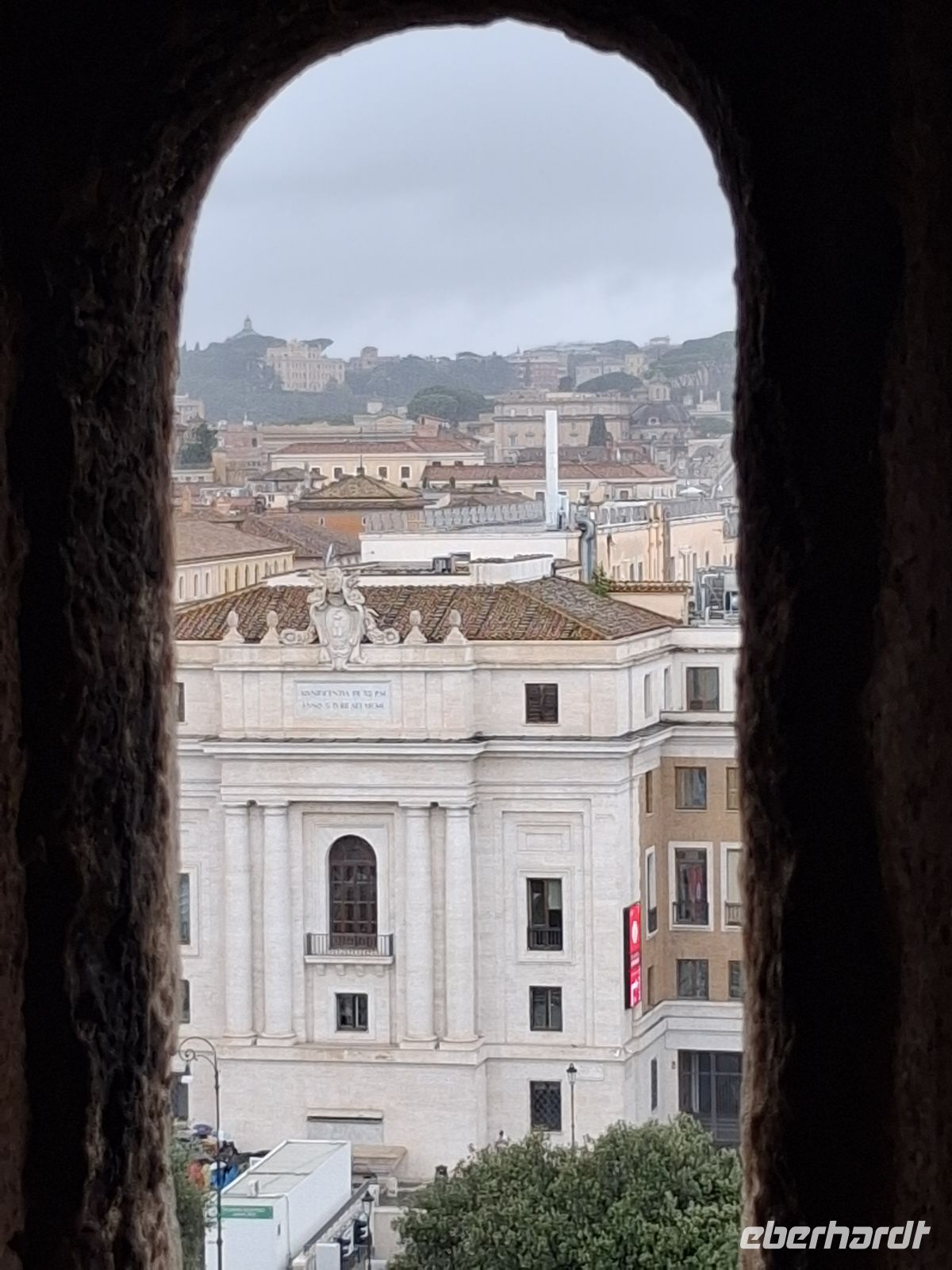 Unser Frühstück ziehen wir heute vor, um uns von unseren Chauffeuren zeitig zum Petersdom bringen zu lassen. Leider ist das Wetter heute regnerisch vorausgesagt, was sich auch bewahrheitet. Wir durchstehen gemeinsam mit unserer kämpferischen Reiseführerin - im Regen - die Zugangskontrolle zur Audienz auf dem Petersplatz. Als Papst Leo XIV. mit seinem Papstmobil durch die Reihen fährt, hat der Regen glücklicherweise nachgelassen. Wir sehen ihn ganz aus der Nähe und können die Reden auf den großen Leinwänden verfolgen. Die Stimmung der internationalen Gäste und Pilger ist aufgeregt und gespannt auf den neuen Papst. Im Anschluss sammeln wir uns und nehmen eine Stärkung in einem familiären Café in der Vatikanstadt ein. Bei leichtem Regen spazieren wir entlang am Passetto di Borgo, dem oberhalb der Straße gelegenen Übergang vom Petersdom bis zur Engelsburg. Agnieszka führt uns durch die kleinen Gassen der Altstadt im Vatikan, vorbei an Schneidergeschäften für kirchliche Würdenträger und Souvenirläden, bis wir die Engelsburg am Tiber erreichen. Hier erfahren wir Wissenswertes über die Geschichte dieses imposanten Gebäudes, das ursprünglich als Mausoleum für den Kaiser Hadrian und seine Familie erbaut wurde. In den Jahrhunderten hat es wegen seiner strategischen Lage direkt am Tiber und nah am Vatikan vielen Zwecken gedient: Das Grabgebäude wurde umgebaut zu einer Festung und diente Päpsten als Rückzugsort in Krisenzeiten. Außerdem war die Engelsburg ein Gefängnis für Staatsgefangene. Wir besichtigen das Museum, das die bewegte Geschichte aus der Kaiserzeit über das Mittelalter bis zur Renaissance und Moderne zeigt. Von ganz oben, wo die Statue des Erzengels Michael thront (der hier Papst Gregor I. erschienen sein soll), genießen wir einen atemberaubenden Blick auf den Vatikan und die Stadt Rom.