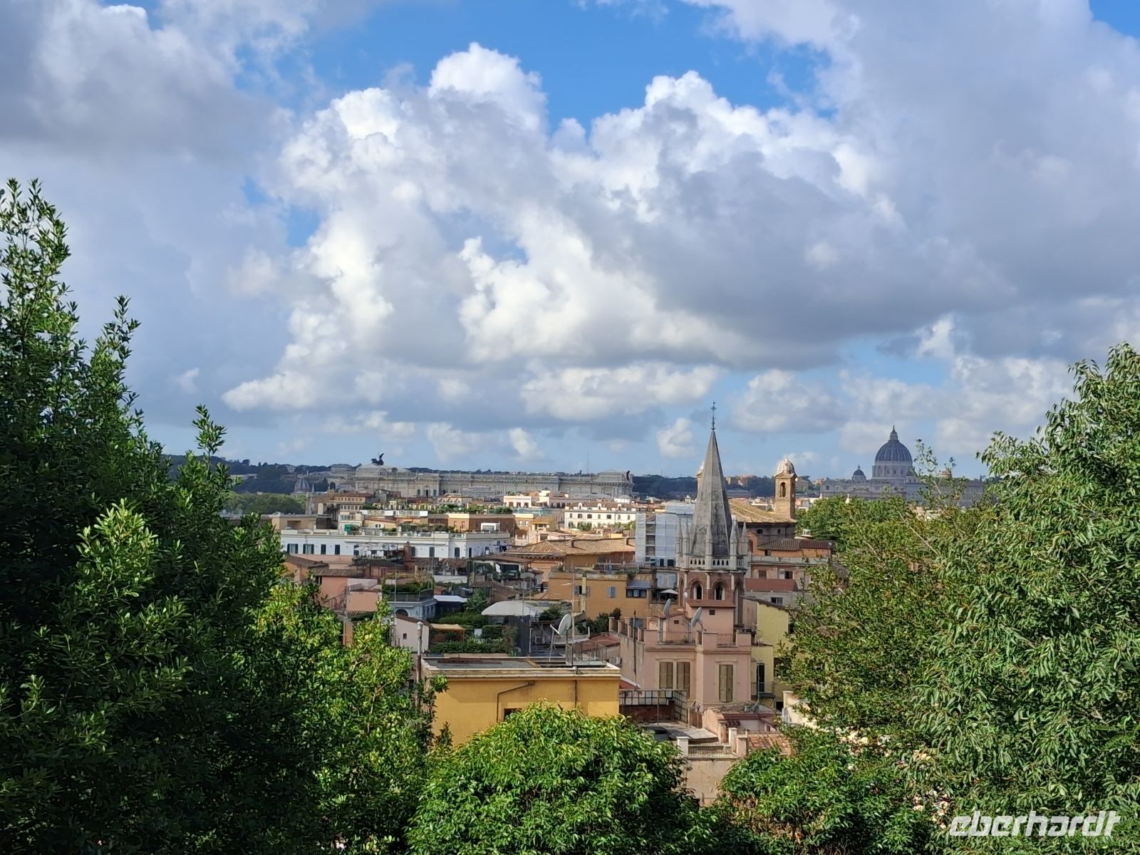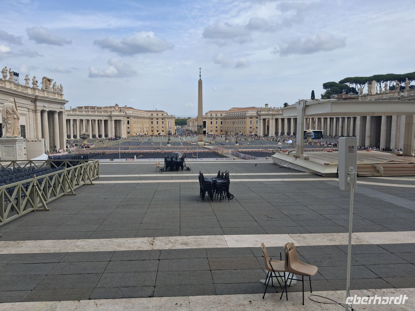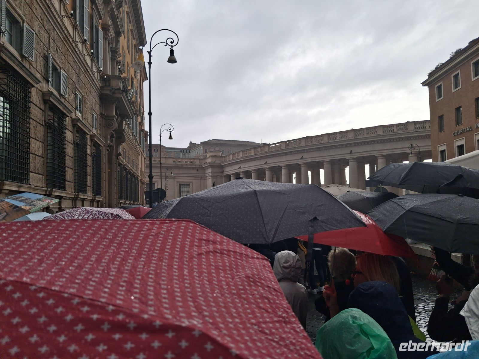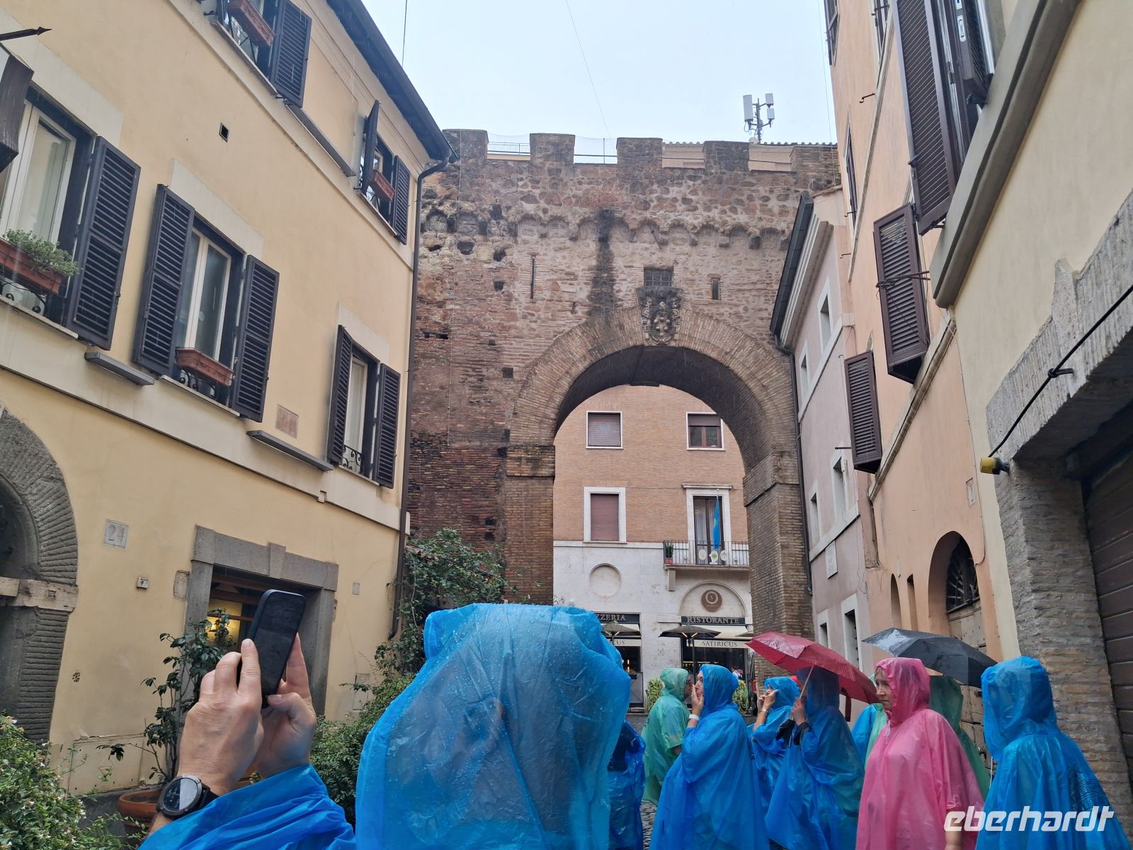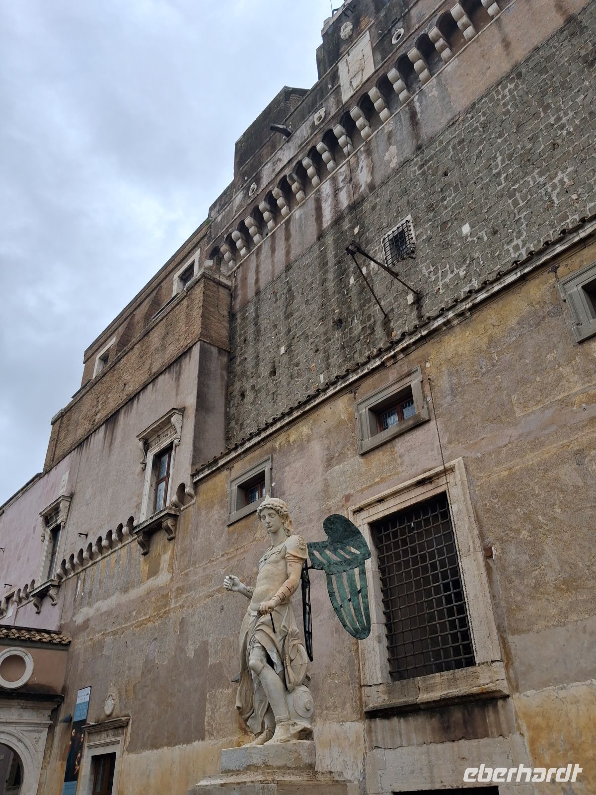 Unser Frühstück ziehen wir heute vor, um uns von unseren Chauffeuren zeitig zum Petersdom bringen zu lassen. Leider ist das Wetter heute regnerisch vorausgesagt, was sich auch bewahrheitet. Wir durchstehen gemeinsam mit unserer kämpferischen Reiseführerin - im Regen - die Zugangskontrolle zur Audienz auf dem Petersplatz. Als Papst Leo XIV. mit seinem Papstmobil durch die Reihen fährt, hat der Regen glücklicherweise nachgelassen. Wir sehen ihn ganz aus der Nähe und können die Reden auf den großen Leinwänden verfolgen. Die Stimmung der internationalen Gäste und Pilger ist aufgeregt und gespannt auf den neuen Papst. Im Anschluss sammeln wir uns und nehmen eine Stärkung in einem familiären Café in der Vatikanstadt ein. Bei leichtem Regen spazieren wir entlang am Passetto di Borgo, dem oberhalb der Straße gelegenen Übergang vom Petersdom bis zur Engelsburg. Agnieszka führt uns durch die kleinen Gassen der Altstadt im Vatikan, vorbei an Schneidergeschäften für kirchliche Würdenträger und Souvenirläden, bis wir die Engelsburg am Tiber erreichen. Hier erfahren wir Wissenswertes über die Geschichte dieses imposanten Gebäudes, das ursprünglich als Mausoleum für den Kaiser Hadrian und seine Familie erbaut wurde. In den Jahrhunderten hat es wegen seiner strategischen Lage direkt am Tiber und nah am Vatikan vielen Zwecken gedient: Das Grabgebäude wurde umgebaut zu einer Festung und diente Päpsten als Rückzugsort in Krisenzeiten. Außerdem war die Engelsburg ein Gefängnis für Staatsgefangene. Wir besichtigen das Museum, das die bewegte Geschichte aus der Kaiserzeit über das Mittelalter bis zur Renaissance und Moderne zeigt. Von ganz oben, wo die Statue des Erzengels Michael thront (der hier Papst Gregor I. erschienen sein soll), genießen wir einen atemberaubenden Blick auf den Vatikan und die Stadt Rom.