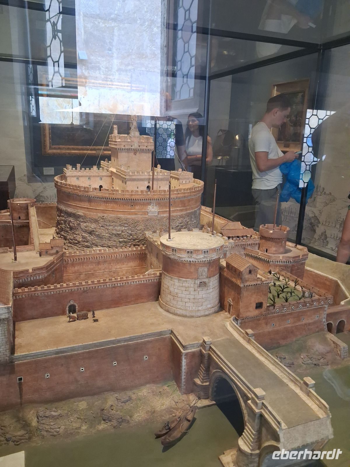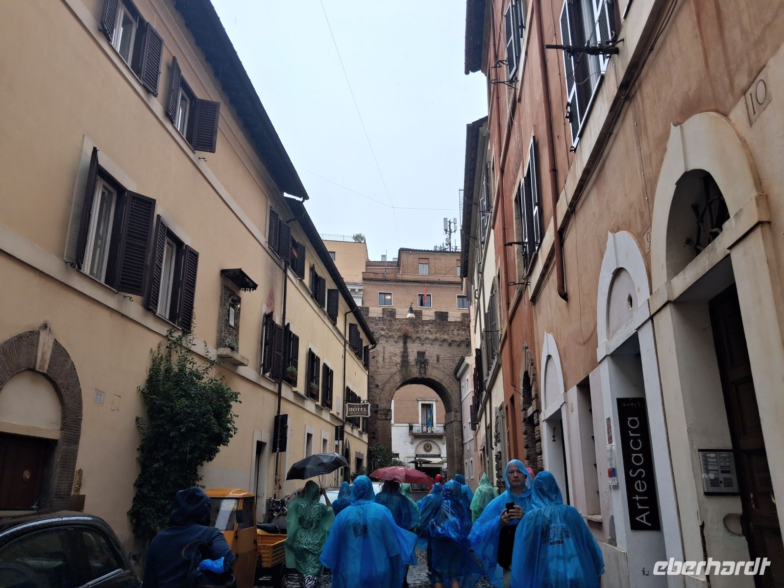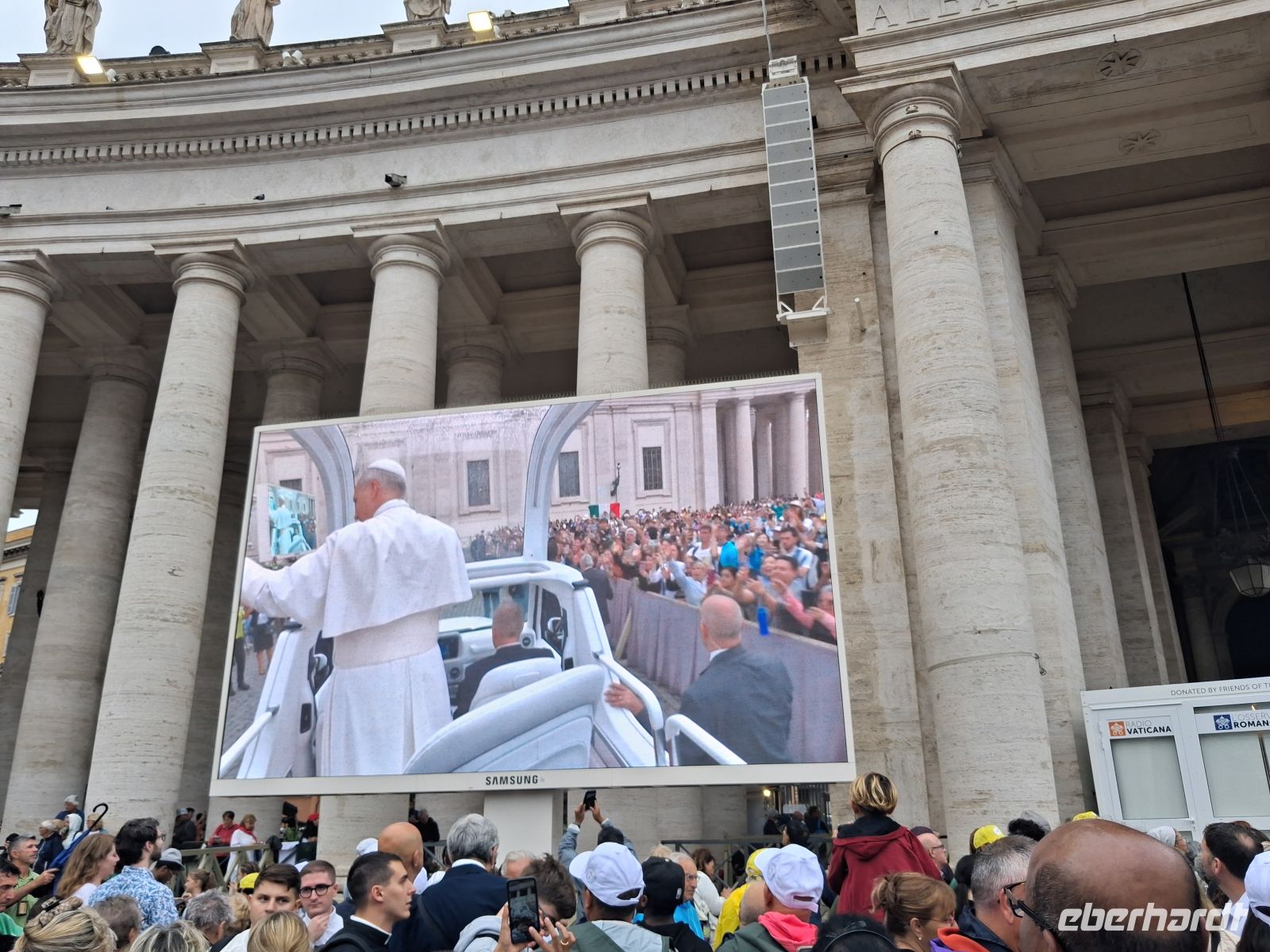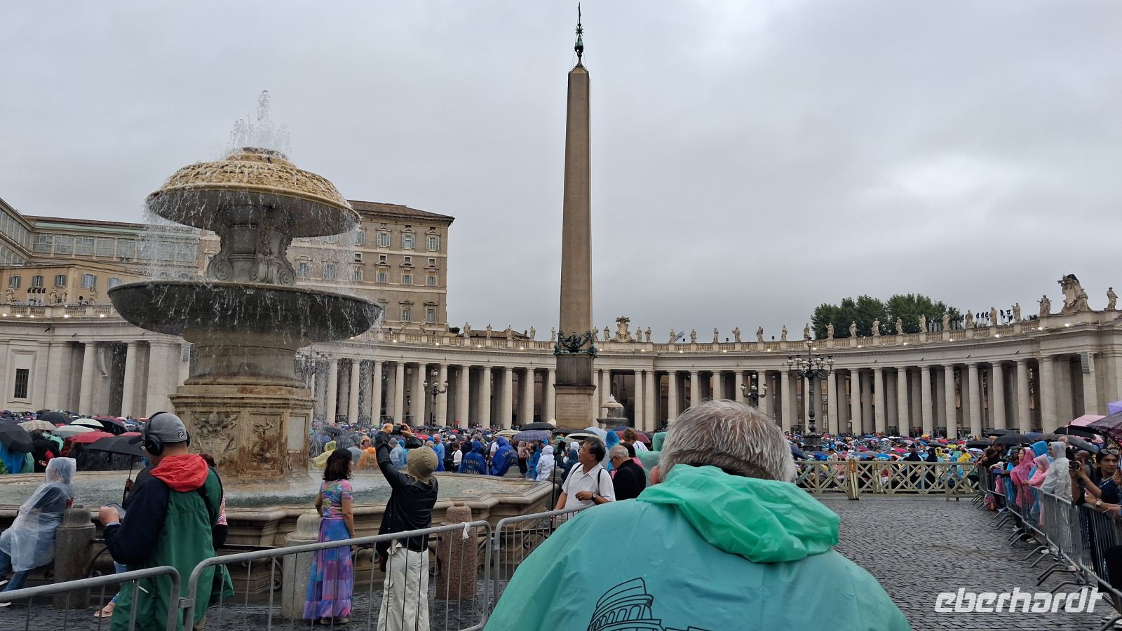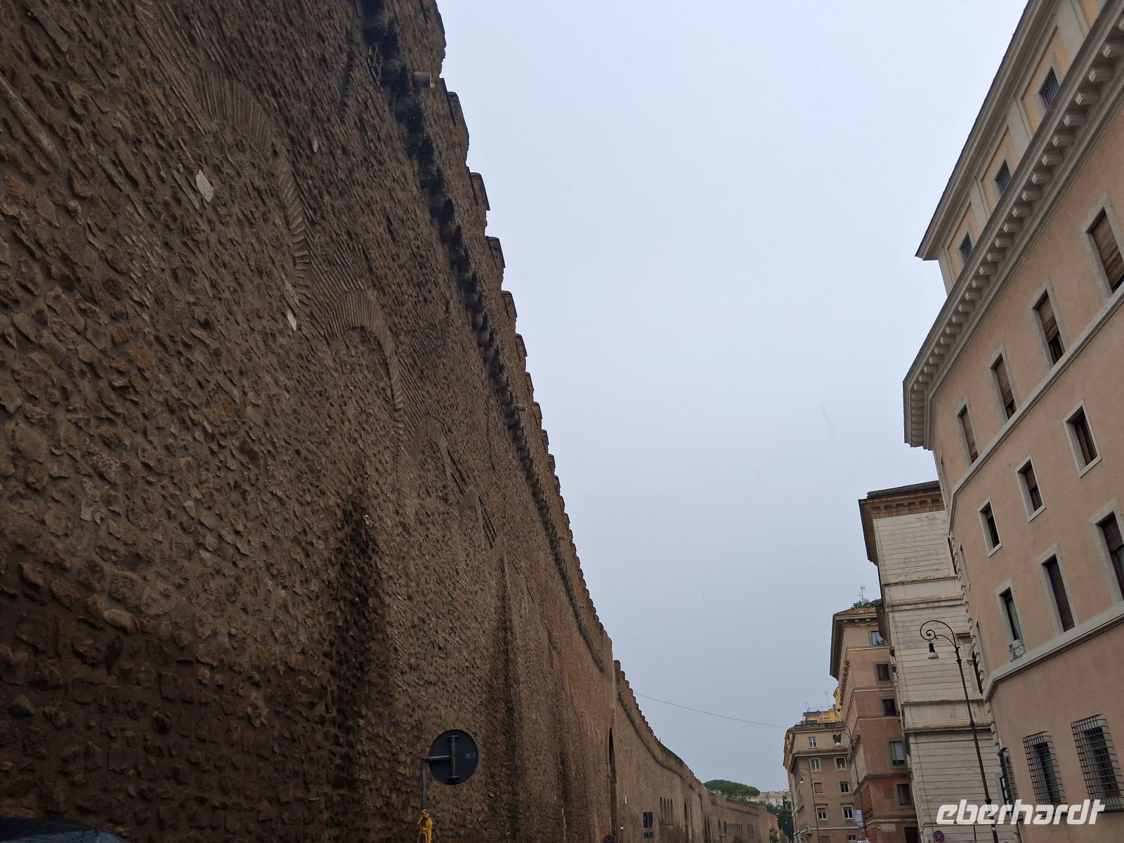 Unser Frühstück ziehen wir heute vor, um uns von unseren Chauffeuren zeitig zum Petersdom bringen zu lassen. Leider ist das Wetter heute regnerisch vorausgesagt, was sich auch bewahrheitet. Wir durchstehen gemeinsam mit unserer kämpferischen Reiseführerin - im Regen - die Zugangskontrolle zur Audienz auf dem Petersplatz. Als Papst Leo XIV. mit seinem Papstmobil durch die Reihen fährt, hat der Regen glücklicherweise nachgelassen. Wir sehen ihn ganz aus der Nähe und können die Reden auf den großen Leinwänden verfolgen. Die Stimmung der internationalen Gäste und Pilger ist aufgeregt und gespannt auf den neuen Papst. Im Anschluss sammeln wir uns und nehmen eine Stärkung in einem familiären Café in der Vatikanstadt ein. Bei leichtem Regen spazieren wir entlang am Passetto di Borgo, dem oberhalb der Straße gelegenen Übergang vom Petersdom bis zur Engelsburg. Agnieszka führt uns durch die kleinen Gassen der Altstadt im Vatikan, vorbei an Schneidergeschäften für kirchliche Würdenträger und Souvenirläden, bis wir die Engelsburg am Tiber erreichen. Hier erfahren wir Wissenswertes über die Geschichte dieses imposanten Gebäudes, das ursprünglich als Mausoleum für den Kaiser Hadrian und seine Familie erbaut wurde. In den Jahrhunderten hat es wegen seiner strategischen Lage direkt am Tiber und nah am Vatikan vielen Zwecken gedient: Das Grabgebäude wurde umgebaut zu einer Festung und diente Päpsten als Rückzugsort in Krisenzeiten. Außerdem war die Engelsburg ein Gefängnis für Staatsgefangene. Wir besichtigen das Museum, das die bewegte Geschichte aus der Kaiserzeit über das Mittelalter bis zur Renaissance und Moderne zeigt. Von ganz oben, wo die Statue des Erzengels Michael thront (der hier Papst Gregor I. erschienen sein soll), genießen wir einen atemberaubenden Blick auf den Vatikan und die Stadt Rom.